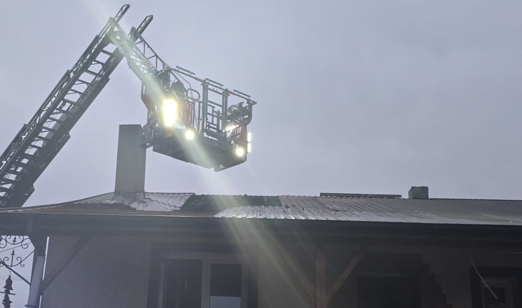 Na miejsce skierowano łącznie siedem zastępów straży pożarnej. Po przybyciu strażaków stwierdzono rozwinięty pożar na nieużytkowym poddaszu budynku jednorodzinnego. W chwili zdarzenia wewnątrz przebywało pięć osób, które samodzielnie i bezpiecznie opuściły dom, udając się do ogrzewanego budynku gospodarczego na terenie posesji. Żadna z nich nie wymagała pomocy medycznej. Strażacy zabezpieczyli teren, odłączyli zasilanie elektryczne i przystąpili do działań gaśniczych, wprowadzając linię gaśniczą na poddasze. Budynek został dokładnie sprawdzony kamerą termowizyjną – wykryto podwyższoną temperaturę filara kominowego, jednak w pozostałych pomieszczeniach nie stwierdzono zagrożenia. Konieczne było częściowe rozebranie pokrycia dachowego przy użyciu drabiny mechanicznej. Nadpalone elementy konstrukcji oraz izolację termiczną usunięto i dogaszono wodą. Działania trwały ponad pięć godzin. Po ugaszeniu pożaru strażacy zabezpieczyli dach i ponownie skontrolowali obiekt urządzeniami pomiarowymi wykluczając zagrożenia.