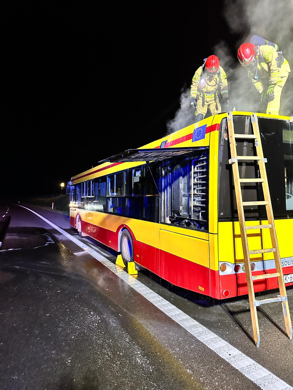 Jadąc trasą S7 zapalił się autobus marki Solaris Urbino 12 służący do przewozu osób. Autobus jechał do serwisu i podróżował w nim tylko kierowca, który, gdy zauważył pożar zdążył bezpiecznie zjechać na pobocze i wysiąść z pojazdu. Podjął również nieskuteczną próbę ugaszenia pożaru, który przeniósł się z komory silnika na dach autobusu. Mężczyzna nie wymagał pomocy medycznej. Strażacy zabezpieczyli i oznakowali teren działania i jednocześnie rozpoczęli gaszenie pojazdu dogaszając pożar w komorze silnika i wchodząc na dach autobusu atakując ogień od góry. Po ugaszeniu autobus został sprawdzony kamerą termowizyjną, która wykluczyła obecność zarzewi ognia.