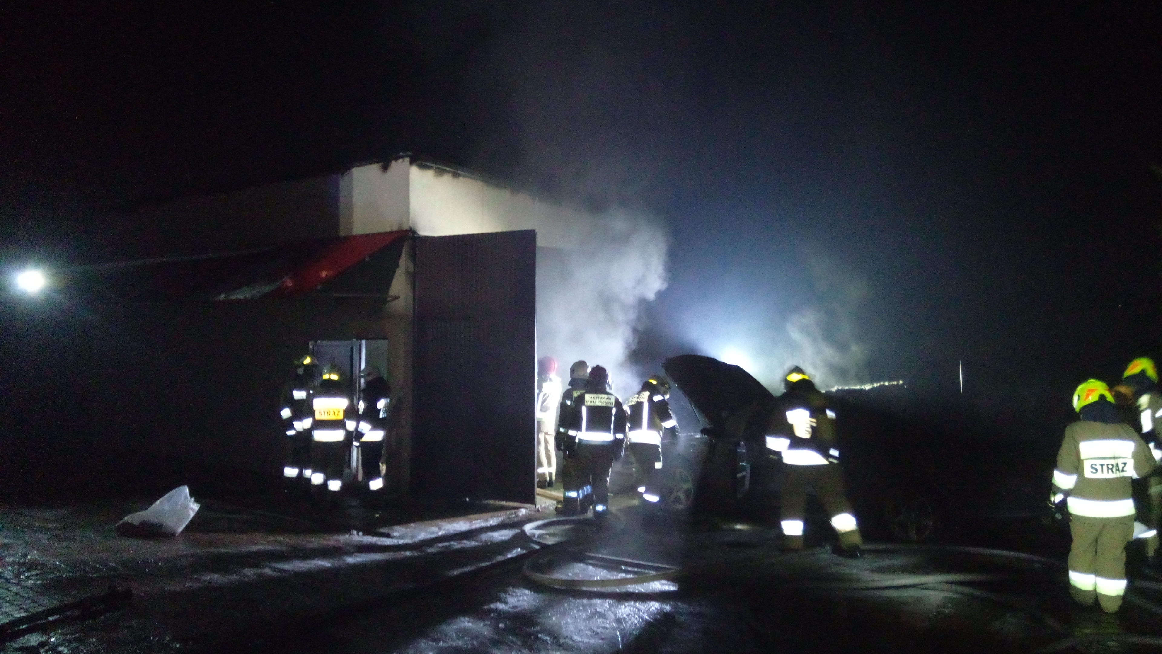 Po przybyciu na miejsce zdarzenia i przeprowadzeniu rozpoznania stwierdzono, że z pod dachu garażu, wydobywa się gęsty dym. Przed przybyciem zastępów straży pożarnejwłaściciel odciął napięcie elektryczne do płonącego obiektu oraz podjąłnieskuteczną próbę ugaszenia pożaru. Wewnątrz garażu stał zaparkowany samochód osobowy marki Mercedes Benz z zamontowaną instalacja LPG. Działania zastępów straży pożarnej w pierwszej fazie działań polegały na podaniu dwóch prądów wody przez drzwi w strefę podsufitową, aby schłodzić gazowe produkty rozkładu termicznego.Następnie otwarto bramę i podano dodatkowy prąd wody pod blaszane pokrycie dachu w miejsce gdzie pojawiły się płomienie. Miejsce działań na bieżąco monitorowano przy pomocy kamery termowizyjnej. Po lokalizacji pożaru wypchnięto na zewnątrz samochód osobowy, któryzostał uszkodzony w wyniku oddziaływania wysokiej temperatury.