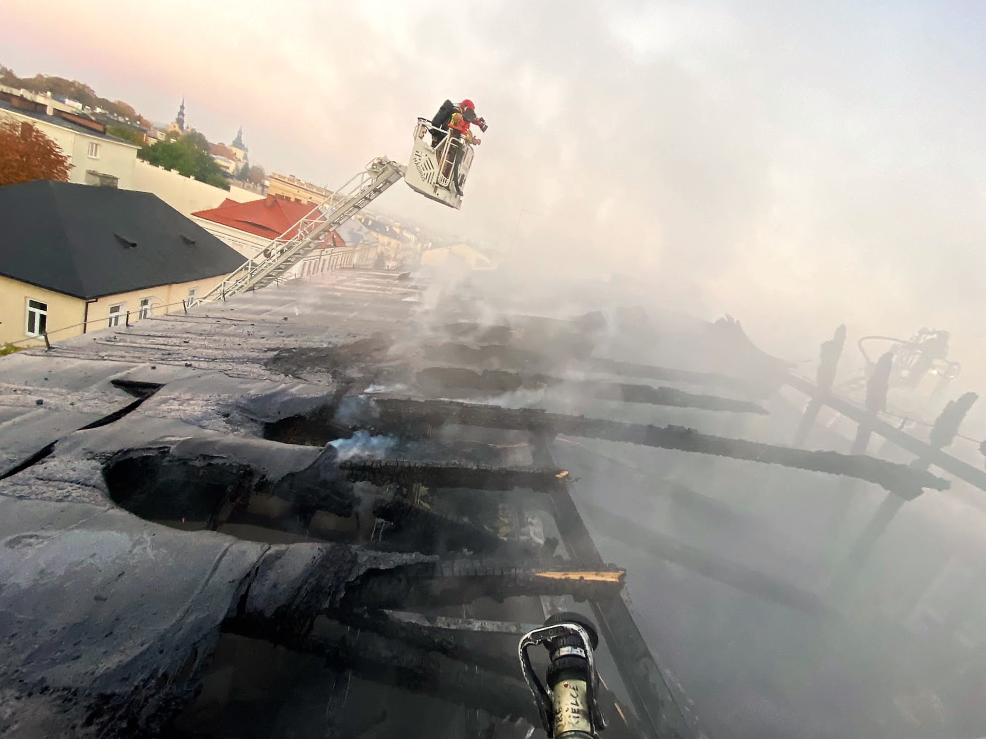 Ogień objął całą powierzchnię dachu kamienicy przy ulicy Sienkiewicza. 4-ro kondygnacyjny budynek w całości wykorzystywany w celach usługowych nie był zamieszkany, ale w wyniku pożaru zagrożone zostały sąsiadujące po dwóch stronach kamienice, w których przebywali mieszkańcy. W związku z realnym zagrożeniem rozwoju pożaru ewakuowano z obu budynków łącznie 22 osoby, którymi zaopiekowały się służby ratownicze. 11 zastępów straży pożarnej, po zabezpieczeniu i oznakowaniu terenu działań, rozpoczęło walkę z żywiołem. Gaszono pożar wykorzystując 2 drabiny mechaniczne, a także chroniono zagrożone kamienice. Ratownicy pracowali w aparatach ochrony dróg oddechowych, a po odłączeniu zasilania elektrycznego i gazowego w budynkach weszli do wnętrza kamienicy i zlokalizowali pożar. Przystąpiono do oddymiania budynku wentylatorem osiowym i demontażu nadwyrężonej przez ogień konstrukcji dachowej oraz zniszczonego pokrycia dachu. Strażacy w celu ochrony wartościowego mienia wynosili je w bezpieczne miejsce oraz chcąc ograniczyć zniszczenia rozpoczęli wypompowywanie wody pożarowej z budynku. Po ugaszeniu pożaru sprawdzono pogorzelisko kamerą termowizyjną wykluczając jakiekolwiek zarzewia ognia. Wszystkie pomieszczenia w 3 sąsiadujących kamienicach sprawdzono detektorem wielogazowym, który nie wykazał obecności niebezpiecznych gazów pożarowych. Dzięki sprawnej akcji ratowniczo-gaśniczej prowadzonej przez 51 strażaków udało się uratować oba przylegające do palącej się kamienicy budynki oraz zminimalizować straty. Działania trwały ponad 6 godzin.