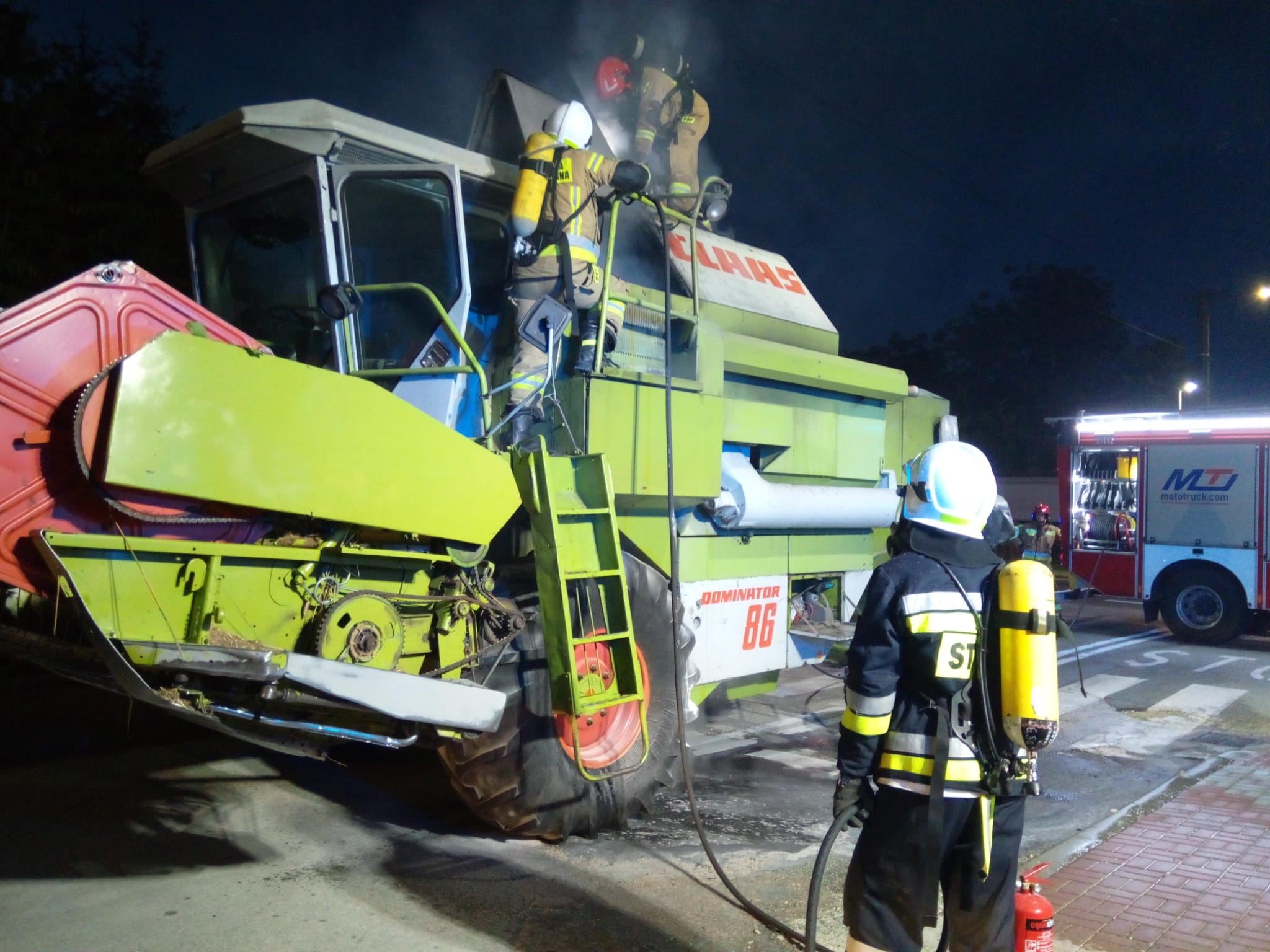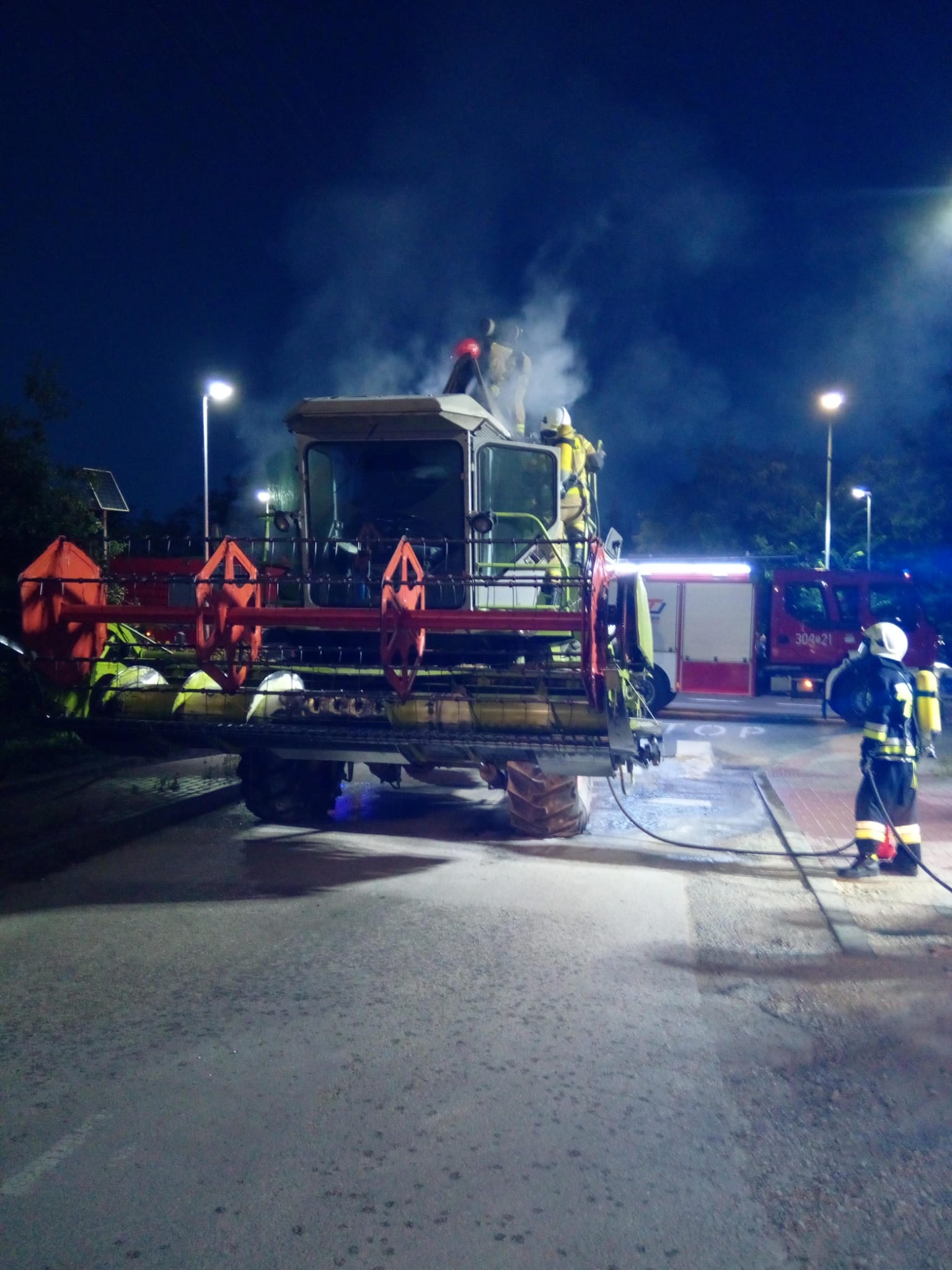 Na drodze gminnej, w Śladkowie Małym (gmina Chmielnik), 12 sierpnia 2025 r., około godziny 20:30 zapalił kombajn zbożowy marki Claas Dominator.