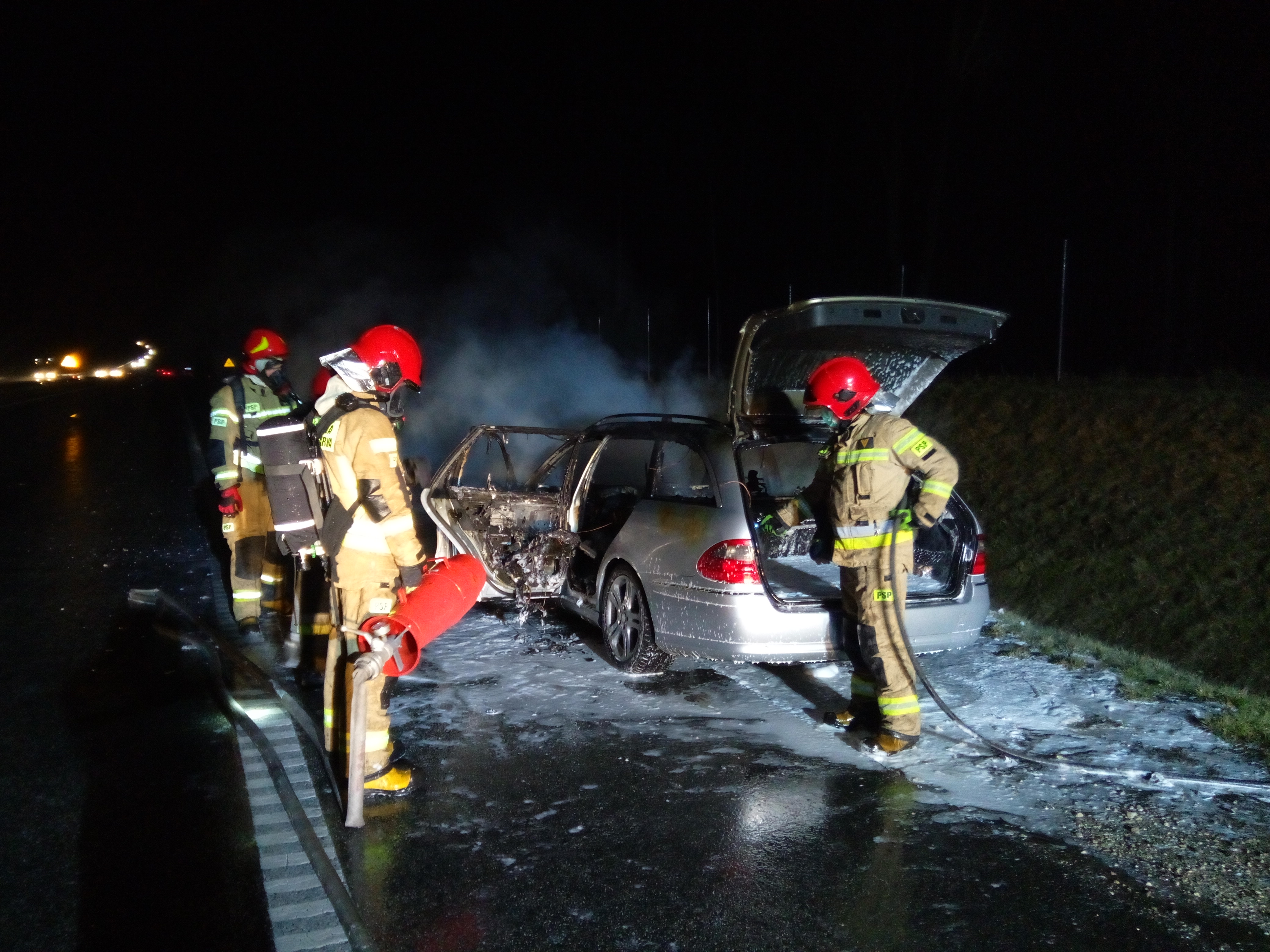 Po przybyciu ratowników na miejsce stwierdzono, że doszło do pożaru samochodu marki Mercedes kompresor E200. Samochód znajdował się na poboczu jezdni w kierunku Warszawy. Właściciel wraz z podróżującymi osobami (kobieta, dziecko) opuścili pojazd nie odnosząc obrażeń.