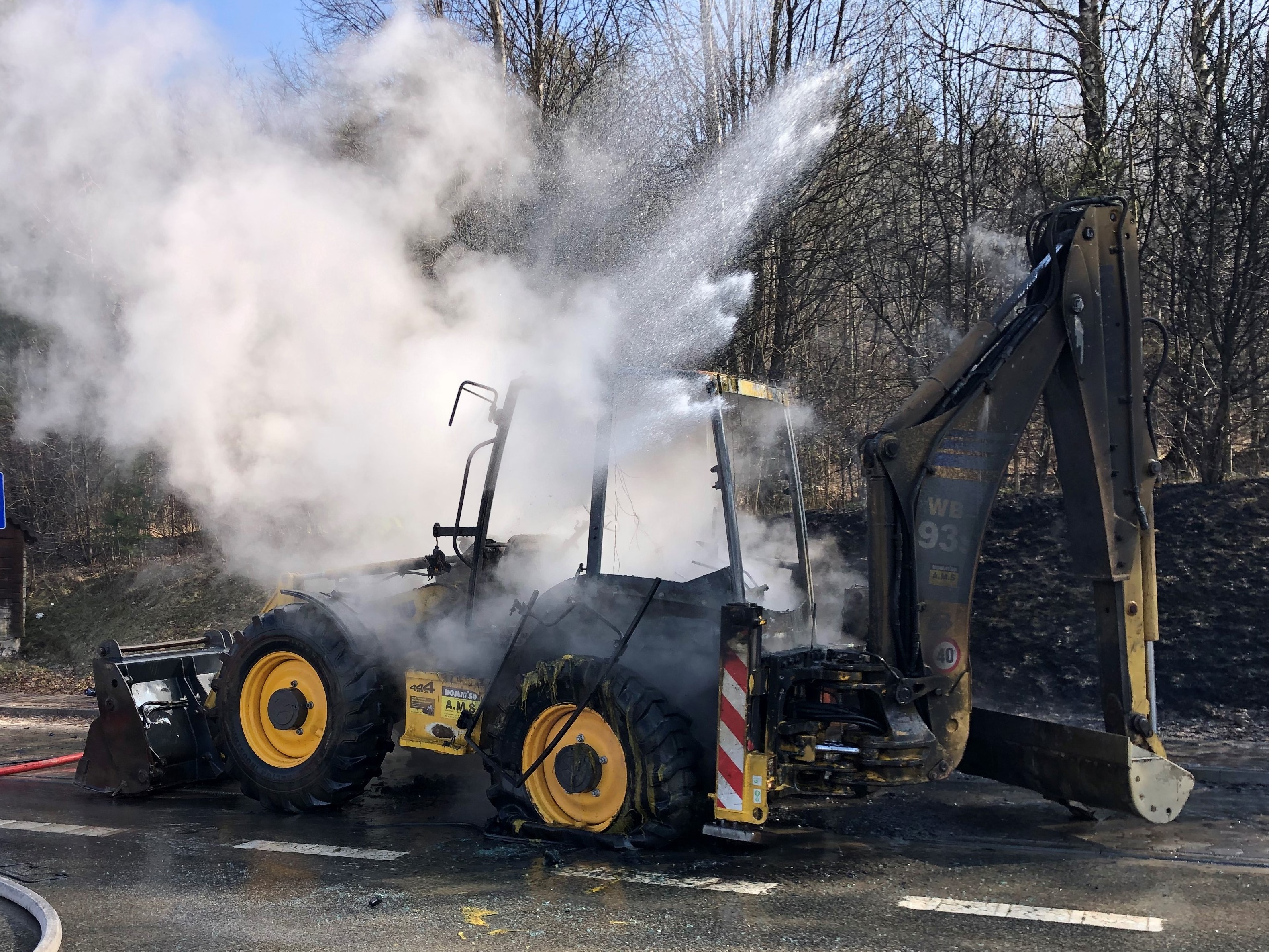 Koparka, której komora silnika i kabina kierowcy w całości objęta była ogniem stała na poboczu drogi wojewódzkiej. Ratownicy zabezpieczyli teren działania i podali wodę na palącą się maszynę. Po ugaszeniu pożaru urządzenie zostało skontrolowane kamerą termowizyjną, która nie wykazała żadnych zarzewi ognia. Dodatkowo strażacy usunęli powstałą w skutek pożaru plamę substancji ropopochodnej z jezdni i na tym zakończyli działania.