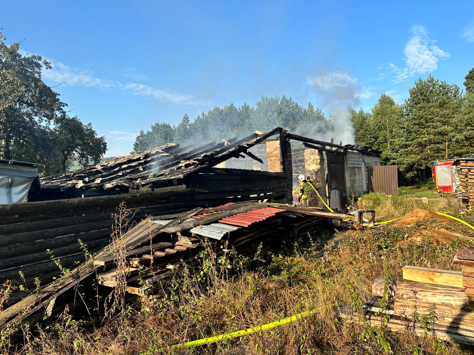 Na ratunek ruszyło 7 zastępów straży pożarnej w sile 31 ratowników, którzy zastali rozwinięty pożar budynku o wymiarach 20 m na 8 m gdzie składowano odpad drewniany. Budynek położony w kompleksie innych budynków gospodarczych. Właścicielowi udało wyprowadzić na zewnątrz maszyny, samochód i ciągnik rolniczy, ale został on poparzony. Strażacy udzielili kwalifikowanej pierwszej pomocy poszkodowanemu i rozpoczęli walkę z żywiołem jednocześnie prowadząc obronę zagrożonych obiektów. Po przybyciu Zespołu Ratownictwa Medycznego mężczyzna został przebadany i zabrany do szpitala. Ratownicy, po ugaszeniu pożaru przystąpili do prac rozbiórkowych konstrukcji budynku i dogaszaniu zarzewi ognia. Nadpalone elementy wynieśli na zewnątrz, a zgromadzone w jednym z budynków trociny zostały rozgarnięte i dokładnie przelane wodą. Po ugaszeniu pożaru miejsce skontrolowali kamerą termowizyjną nie znajdując żadnych zarzewi ognia. Tylko szybka i profesjonalna praca strażaków oraz znaczne zaangażowanie sił i środków pozwoliła na zminimalizowanie strat. Akcja trwała blisko 5 godzin.