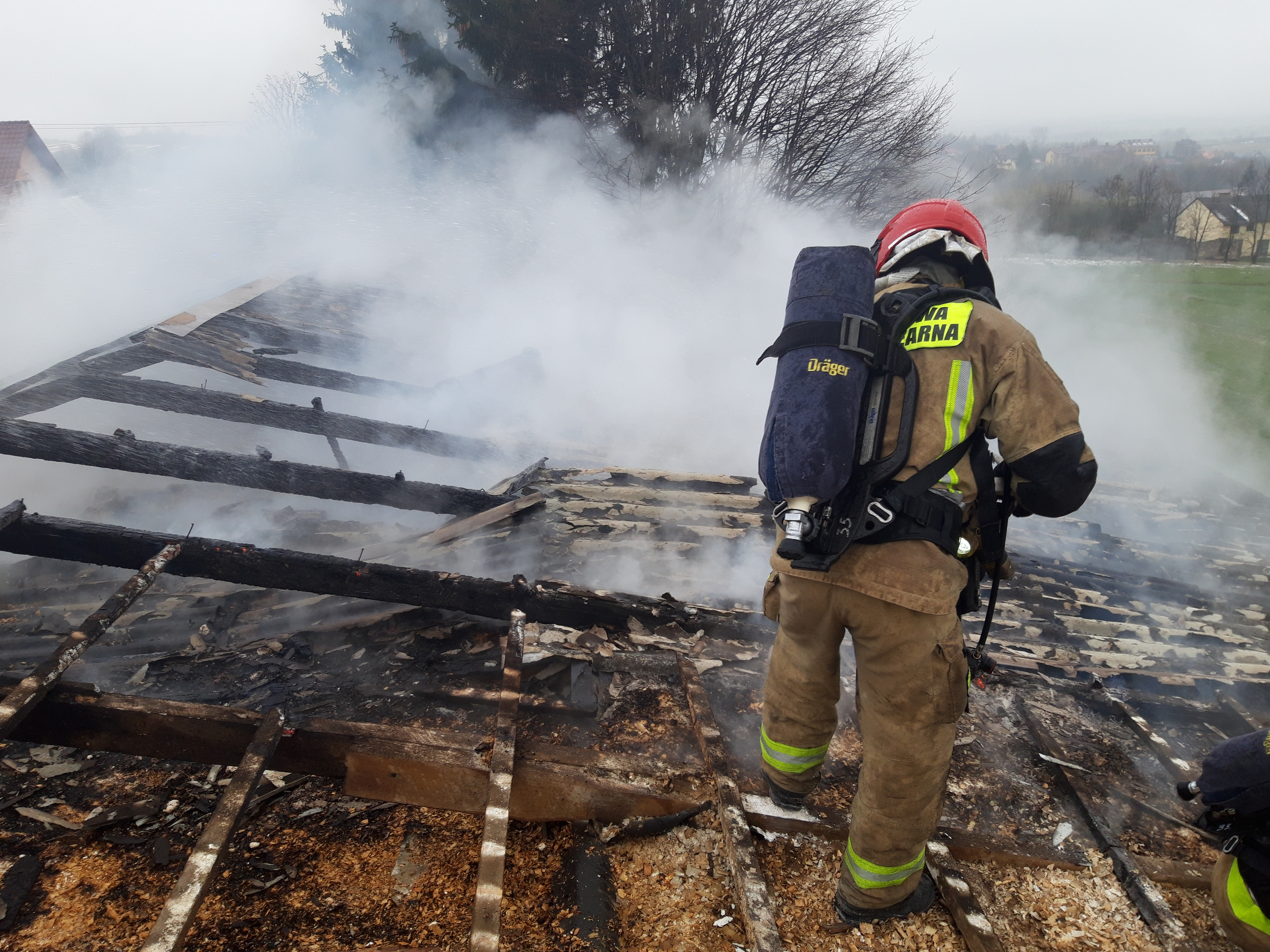 Po przybyciu na miejsce zdarzenia pierwszego zastępu (OSP Wola Jachowa) stwierdzono pożar dachu w nieużytkowanym kurniku. Działania polegały na podaniu dwóch prądów wody w natarciu do wnętrza budynku oraz na jego dach. Po przybyciu kolejnych zastępów straży pożarnej podano trzeci prąd gaśniczy z zewnątrz na dach budynku. Przy użyciu kamery termowizyjnej ustalono, iż pożarem objęta jest przednia część budynku na długości około 10 m. W celu niedopuszczenia do rozprzestrzenienia się pożaru na resztę dachu, ratownicy po drabinie nasadkowej weszli na dach wraz z linią gaśniczą, gdzie przystąpili do usunięcia eternitu w części nie objętej pożarem. Następnie strażacy sukcesywnie rozbierali pokrycie dachowe poruszając się w kierunku pożaru i gasząc jego ogniska. Po lokalizacji pożaru, przystąpiono do częściowej rozbiórki nadpalonej konstrukcji dachu, wyrzucania na zewnątrz trocin i sukcesywnym ich dogaszaniu. Miejsce pożaru dokładnie przelano wodą oraz sprawdzono kamerą termowizyjną i detektorem wielogazowym nie stwierdzając dodatkowych zagrożeń.