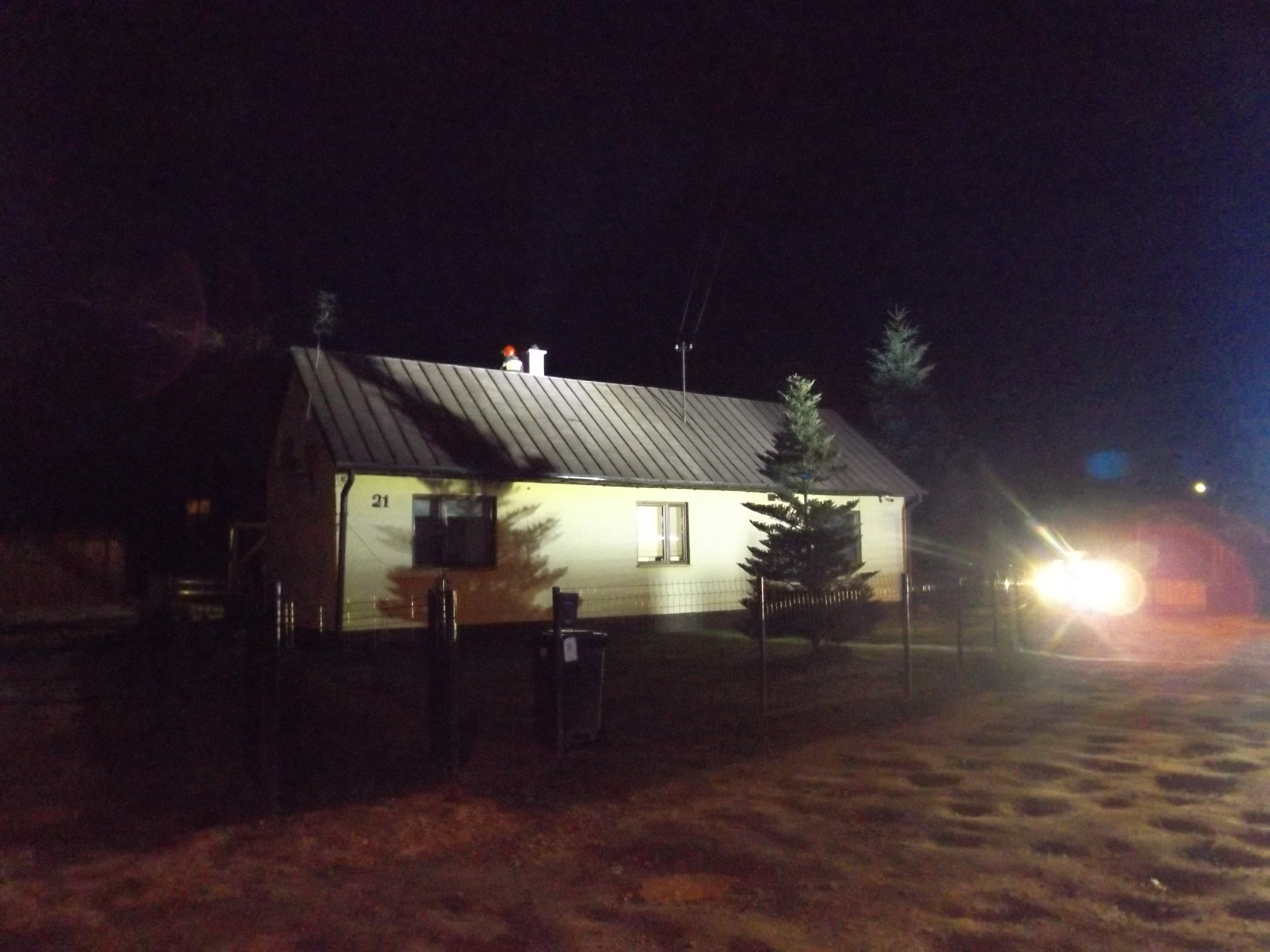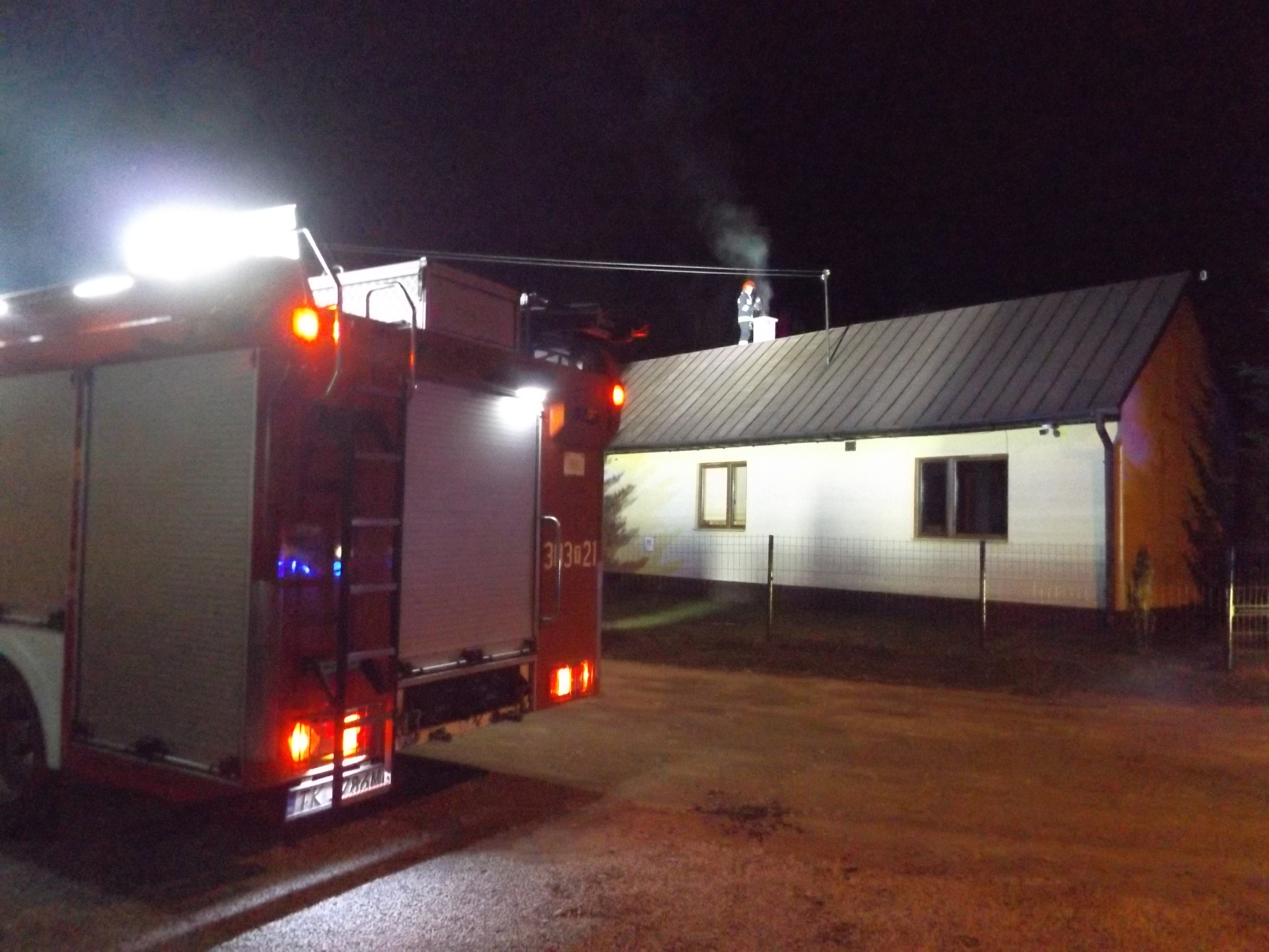 Działania straży pożarnej polegały na skontrolowaniu pomieszczeń mieszkalnych pod kątem obecności tlenku węgla, przy użyciu miernika gazowego który nie wykrył obecności tlenku węgla. Równocześnie dokonano sprawdzenia poddasza budynku, nie stwierdzając żadnego zagrożenia. Ratownicy zabezpieczeni szelkami bezpieczeństwa i linką ratowniczą dostali się na dach budynku do wylotu przewodu kominowego i strącili palące się sadze przy użyciu wyciora.