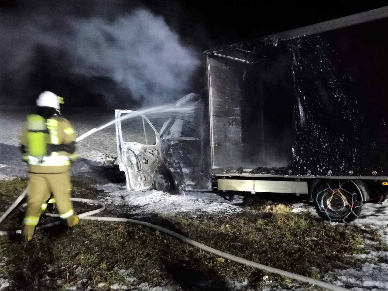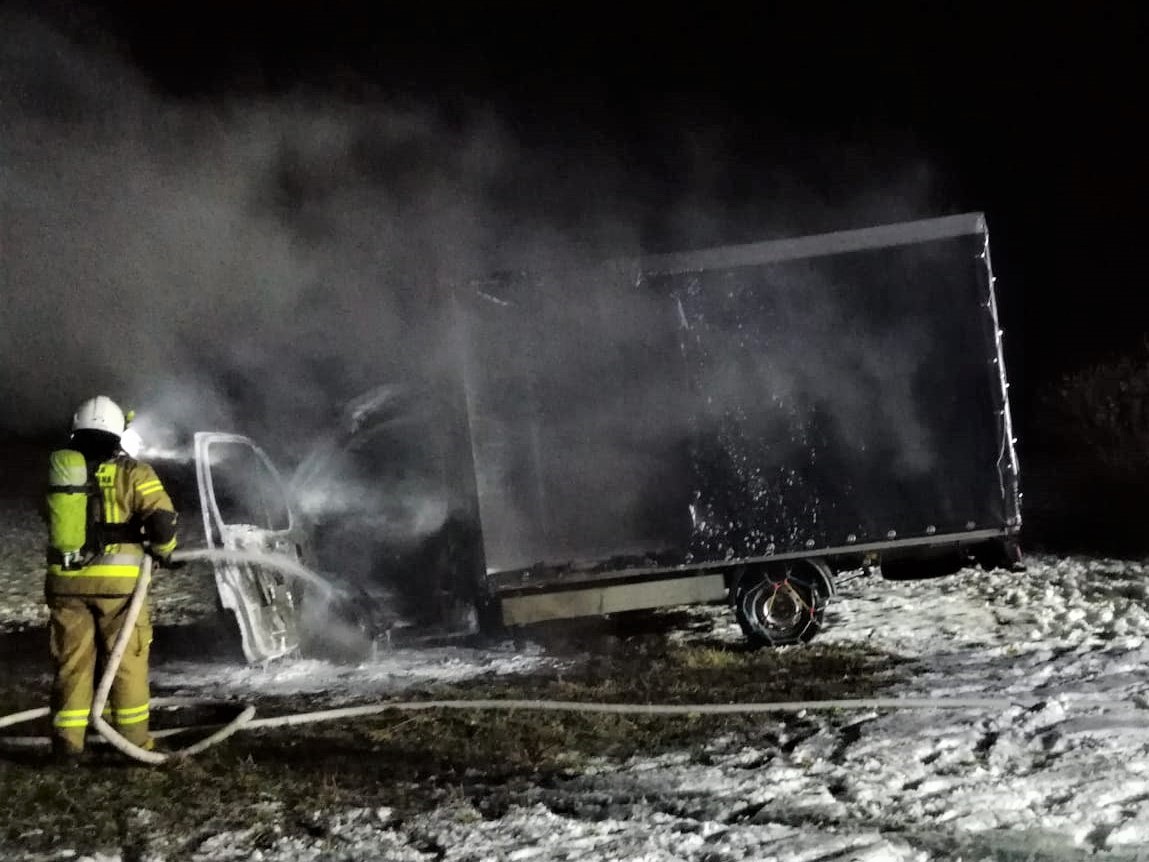 Po dojeździe na miejsce zdarzenia zastępów straży pożarnej stwierdzono, że pali się samochód ciężarowy marki Iveco Daily zasilany olejem napędowym. Pojazd znajdował się poza jezdnią, a pożarem objęta była komora silnika oraz cała kabina pojazdu. Autem podróżował jedynie kierowca, który bezskutecznie próbował ugasić pożar przy użyciu gaśnicy proszkowej. Nasze działania polegały na zabezpieczeniu miejsca zdarzenia, oświetleniu terenu akcji oraz ugaszeniu ognia przy użyciu jednego prądu piany ciężkiej. Dodatkowo sprawdzono kamerą termowizyjną nagrzane elementy konstrukcji pojazdu likwidując ewentualne zarzewia ognia.