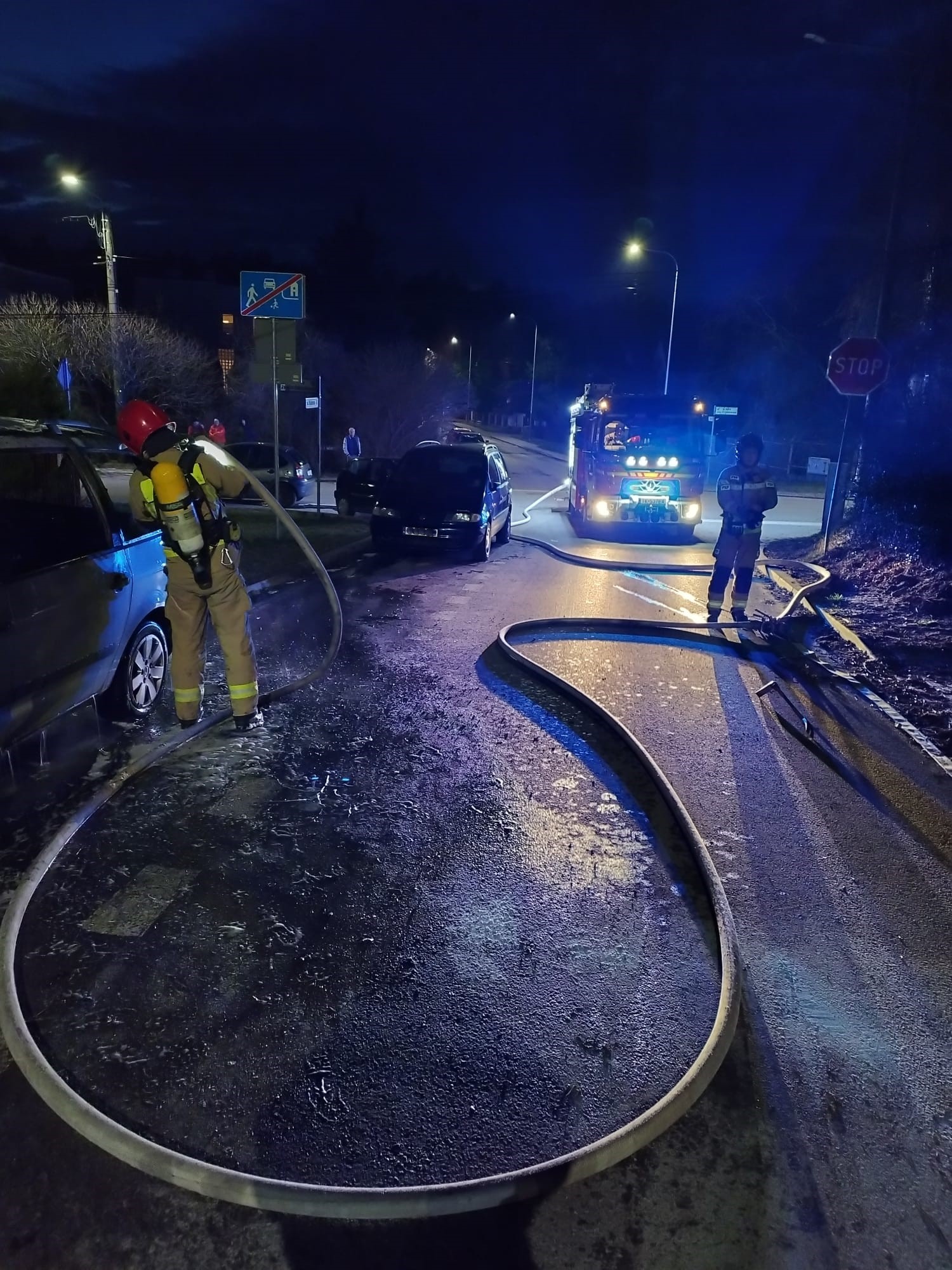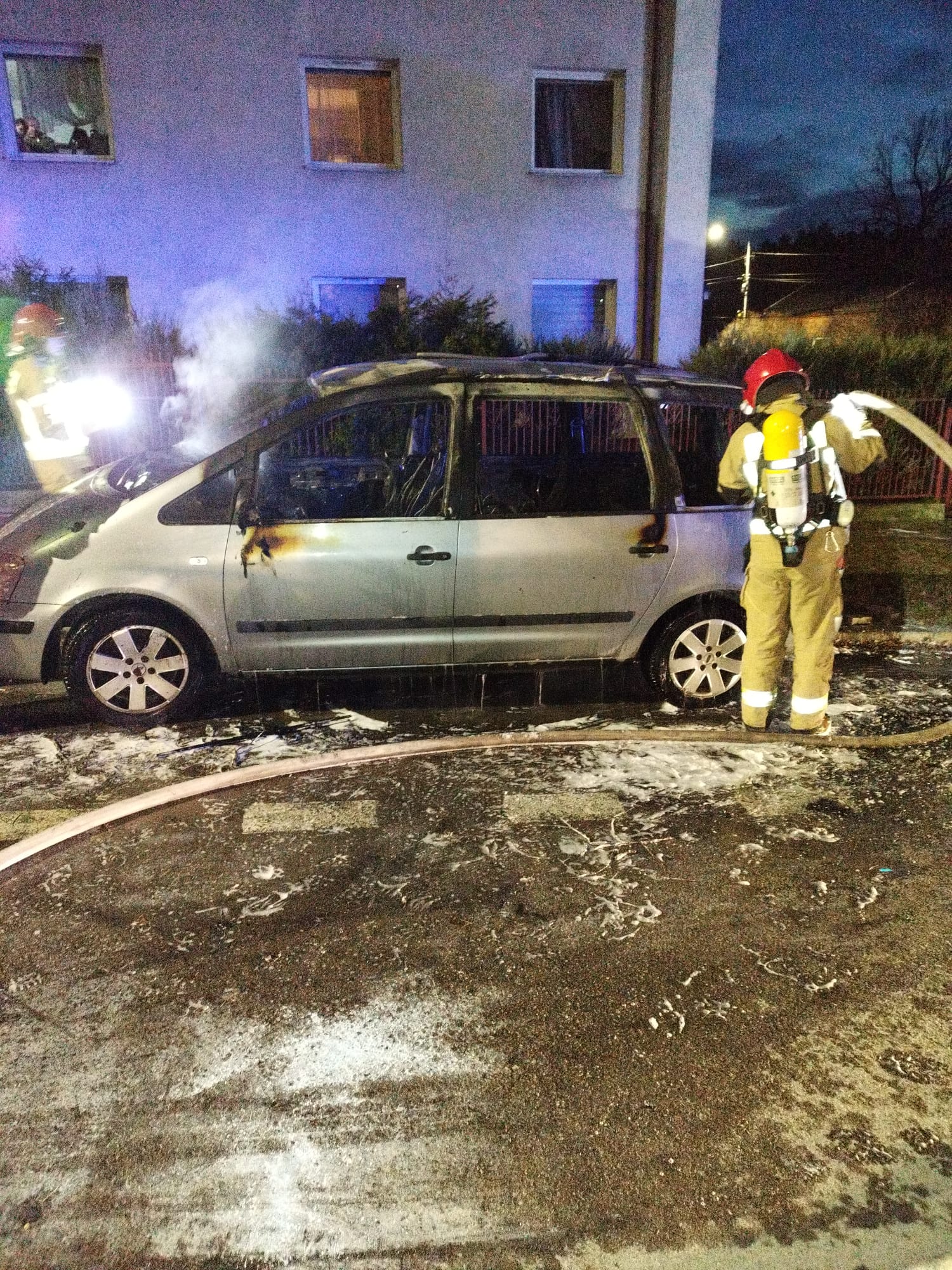 Ogień zauważył właściciel pojazdu, który podjął nieskuteczną próbę ugaszenia palącego się auta osobowego marki Ford Galaxy. W chwili gdy na miejsce przybył zastęp Państwowej Straży Pożarnej pożar był w pełni rozwinięty. Ratownicy zabezpieczyli teren działań i ugasili ogień podając prąd piany ciężkiej, a następnie schłodzili wodą miejsce pożaru. Odłączyli także zasilanie z akumulatora, a na zakończenie skontrolowali pojazd kamerą termowizyjną wykluczając zagrożenia.