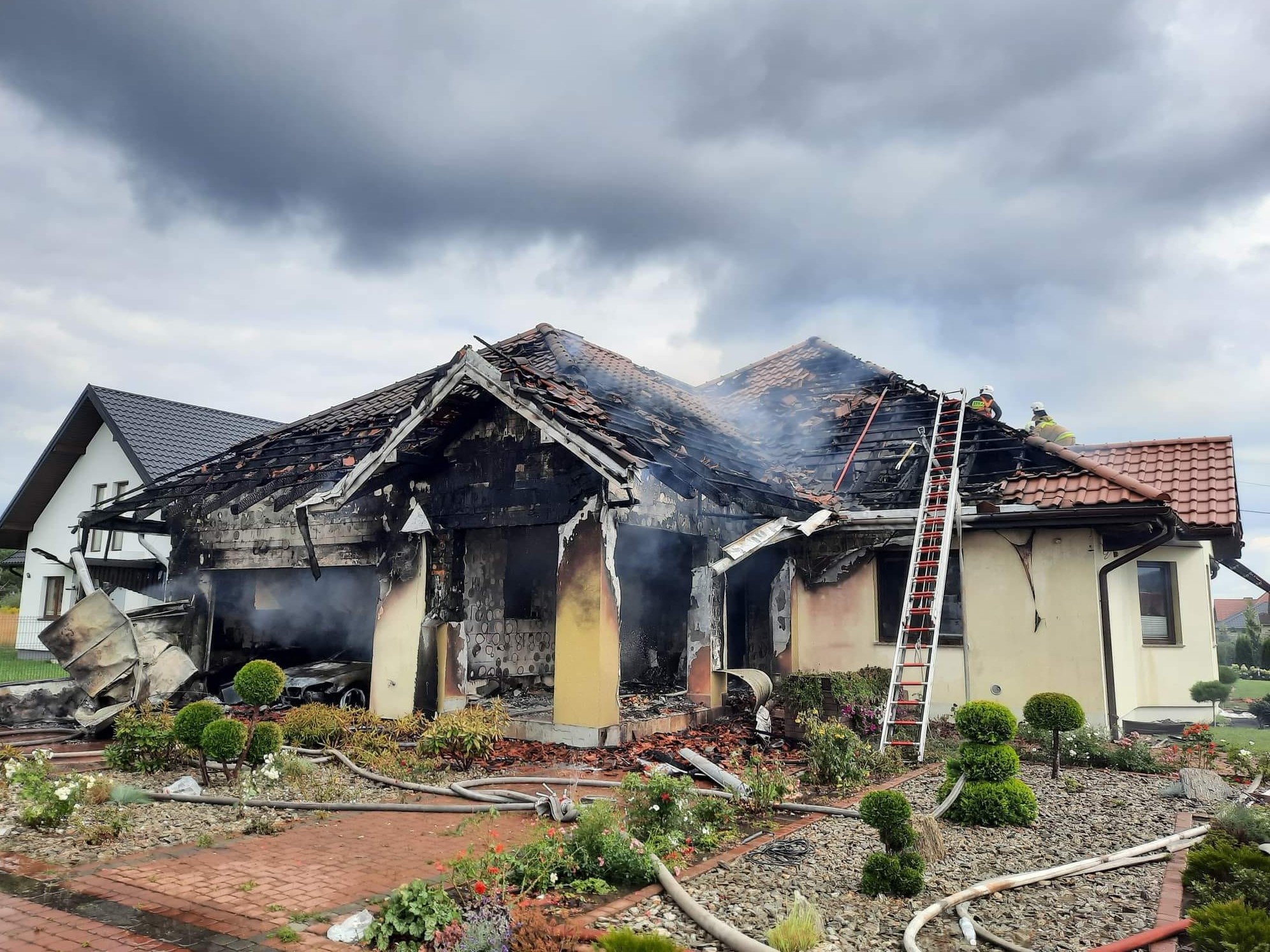Ogień ogarnął dach nad częścią mieszkalną i garażową budynku jednorodzinnego. Dodatkowo palił się samochód zaparkowany w garażu. Gęsty dym i płomienie wychodziły spod pokrycia dachowego. Wewnątrz domu nikogo nie było. Młody mężczyzna podjął nieskuteczną próbę ugaszenia ognia w wyniku czego doznał poparzeń dłoni. Strażacy zabezpieczyli miejsce zdarzenia, odłączyli zasilanie elektryczne do budynku i wdrożyli odpowiednie procedury z zakresu pierwszej pomocy w stosunku do poszkodowanego. Jednocześnie rozpoczęli podawanie wody zarówno na palący się budynek jak i sąsiedni zagrożony rozprzestrzenieniem się pożaru. 4 strumienie wody próbowały zgasić płomienie, a ratownicy z kosza drabiny mechanicznej sukcesywnie demontowali pokrycie odsłaniając zarzewia ognia. Po wejściu ratowników w aparatach dróg oddechowych do wnętrza okazało się, że ogień rozprzestrzenia się między pokryciem dachowym a warstwami wykończeniowymi na poddaszu i nie ma do niego dostępu. Rozpoczęto gaszenie wykorzystując lancę gaśniczą, którą przebijano sufity i podawano wodę w głębsze warstwy stropu nie przerywając demontażu pokrycia. Zespół Ratownictwa Medycznego udzielił pomocy właścicielce budynku, będącej pod wypływem zdarzenia oraz jej synowi, który doznał poparzeń. Po opanowaniu ognia strażacy przystąpili do dogaszania spalonych elementów więźby, przewietrzania i oddymiana budynku oraz ewakuowali nieuszkodzone mienie. Na zakończenie sprawdzono dom kamerą termowizyjną wykluczając ewentualne zarzewia ognia.