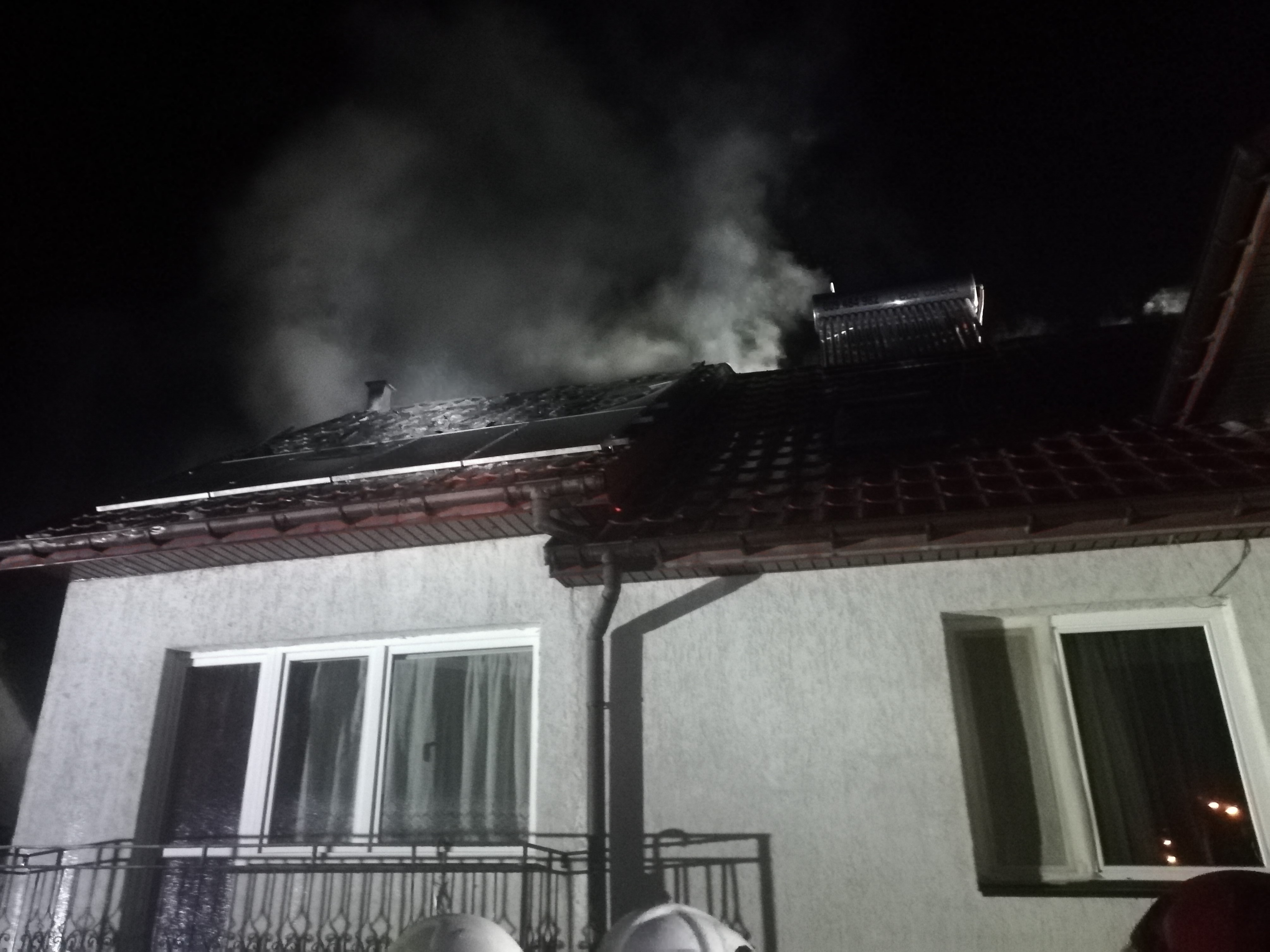 W chwili dojazdu zastępów straży pożarnej pożarem objęty był częściowo dach na jednorodzinnym budynku mieszkalnym oraz w całości przylegająca do niego murowana wiata z zaparkowanym pod nią samochodem osobowym. Wewnątrz domu nie było nikogo. Działania ratowników polegały na zabezpieczeniu miejsca zdarzenia oraz podaniu wody do wnętrza wiaty, na palący się samochód osobowy oraz na dach budynku mieszkalnego. Ze względu na zamontowaną na obiekcie instalację fotowoltaiczną woda była podawana z należytą ostrożnością. Po przybyciu i zapoznaniu się z sytuacją Pogotowie Energetyczne potwierdziło, że nasze działania są w pełni bezpieczne i nie ma zagrożenia od instalacji fotowoltaicznej. Wówczas zwiększono ilość prądów wody oraz wprowadzono prąd wody do wnętrza budynku mieszkalnego na poddasze przez okno. Po tych zabiegach bardzo szybko opanowano ogień i przystąpiono do dogaszania, oddymiana pomieszczeń oraz rozbiórki nadpalonych elementów konstrukcji. Na zakończenie miejsca objęte pożarem sprawdzono kamerą termowizyjną, a pozostałe pomieszczenia oraz budynki w najbliższym sąsiedztwie skontrolowano nie znajdując żadnych zagrożeń.