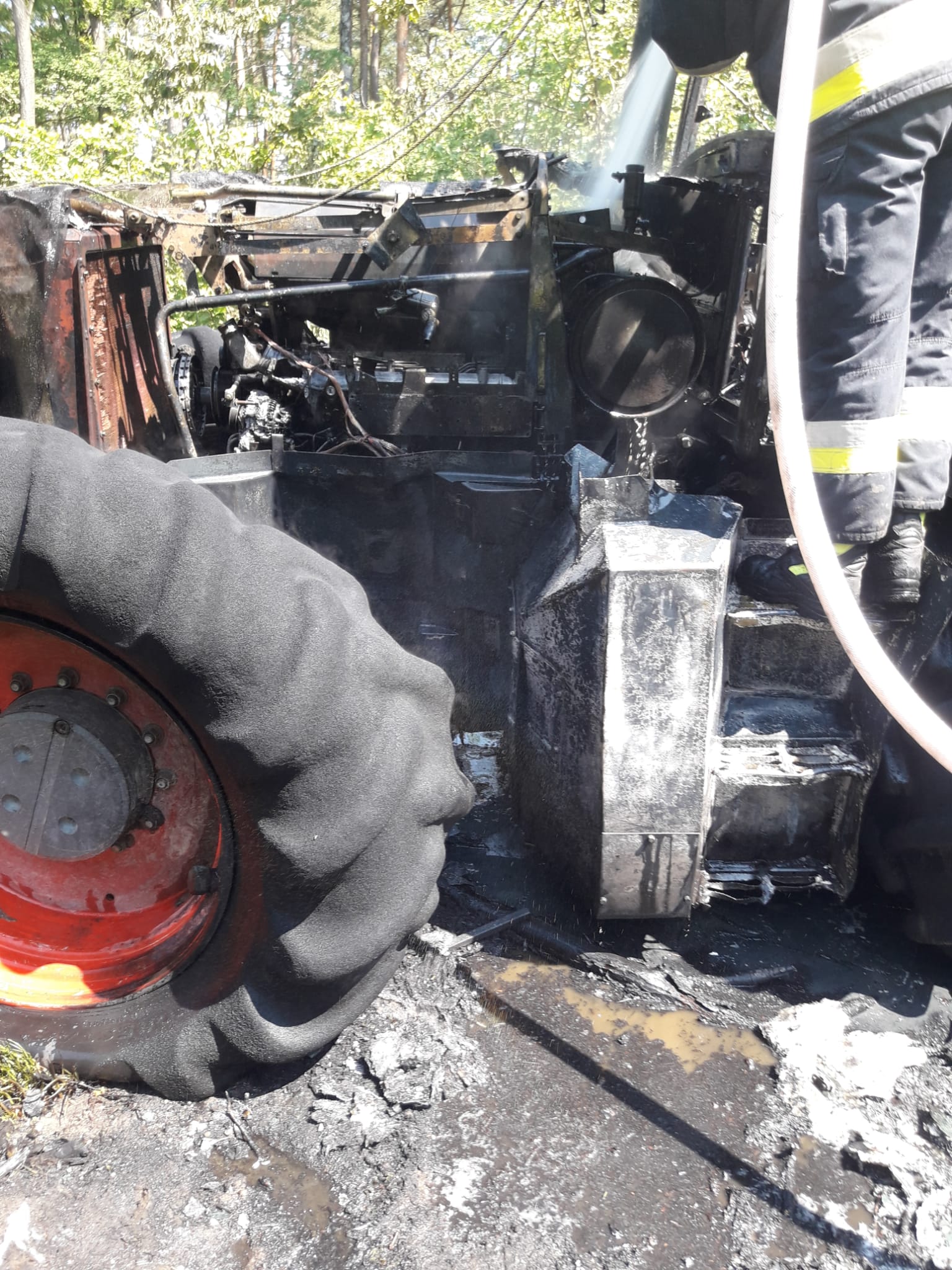 Na terenie leśnym zapalił się traktor marki FENDT 930 przeznaczony do pracy w lesie. Pożar obejmował cały pojazd oraz poszycie leśne wokół niego. Operator traktora podjął nieskuteczną próbę gaszenia ognia używając gaśnicy, a gdy jego wysiłki nie przyniosły oczekiwanego rezultatu oddalił się w bezpieczne miejsce i nie wymagał pomocy medycznej. Ratownicy jednostek ochrony przeciwpożarowej zabezpieczyli teren działań i rozpoczęli walkę z pożarem prądami wody i piany gaśniczej. Po ugaszeniu maszyny oraz palącego się poszycia leśnego wokół sprawdzono ciągnik kamerą termowizyjną potwierdzając dokładne schłodzenie wszystkich elementów urządzenia. Dzięki szybkiej i sprawnej akcji udało się uratować mulczer do rozdrabniania gałęzi podpięty do traktora.