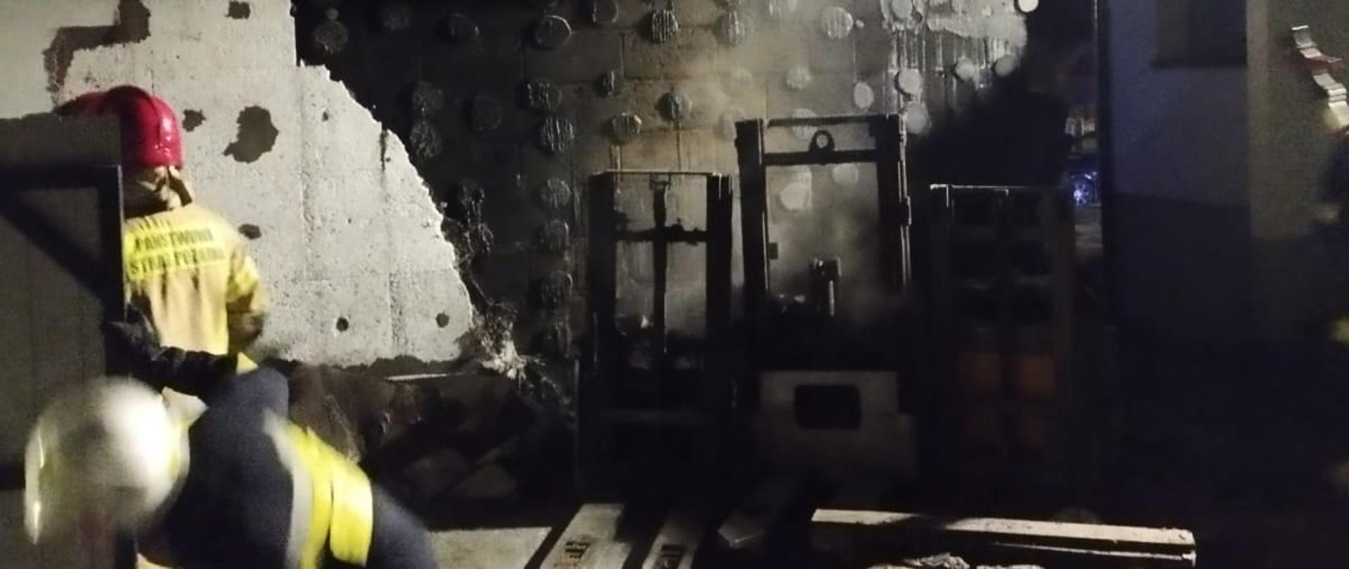 Ogień objął elewację i fragment więźby dachowej budynku gospodarczego oraz stojące przy ścianie zewnętrznej 3 wózki paletowe o napędzie elektrycznym. Właściciel przed przybyciem służb próbował ugasić pożar wykorzystując 3 12-kilowe gaśnice proszkowe co skutecznie ograniczyło jego rozwój. Zadysponowano 5 zastępów straży pożarnej. Ratownicy zabezpieczyli teren działań i ugasili ogień strumieniem wody. Dodatkowo nadpaloną elewację zdemontowano i dokładnie dogaszono. Spalone wózki paletowe odsunięto od ściany budynku i schłodzono wodą. Na zakończenie pogorzelisko sprawdzono kamerą termowizyjną wykluczając zarzewia ognia.