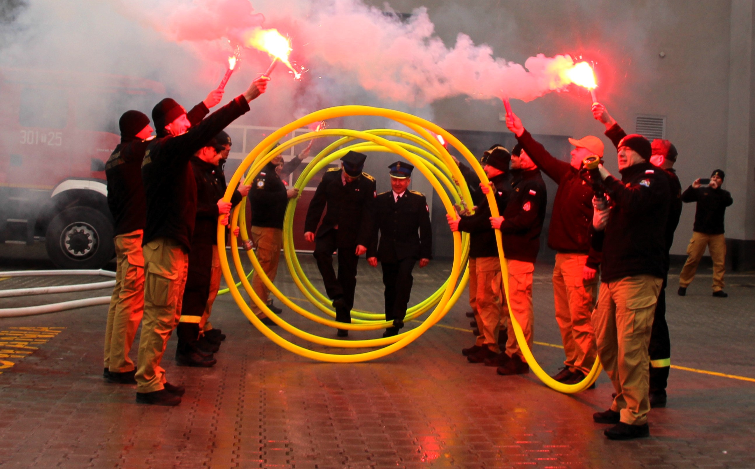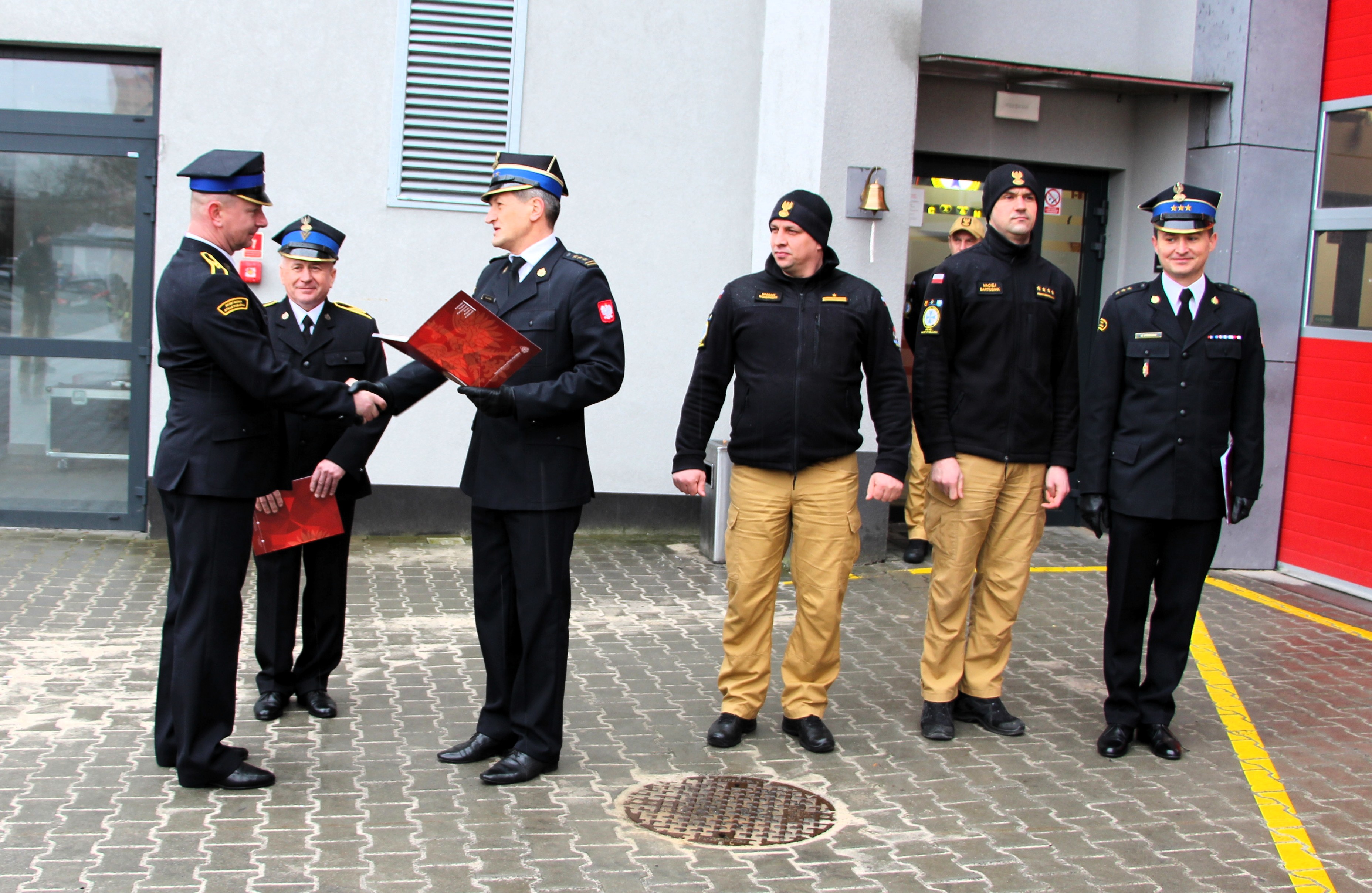 25 lutego 2025 roku, podczas uroczystej zbiórki, kadra kierownicza oraz funkcjonariusze w serdecznej atmosferze pożegnali dwóch zasłużonych strażaków odchodzących na zaopatrzenie emerytalne - st. ogn. Piotra Pedrycza oraz st. ogn. Piotra Łodeja.