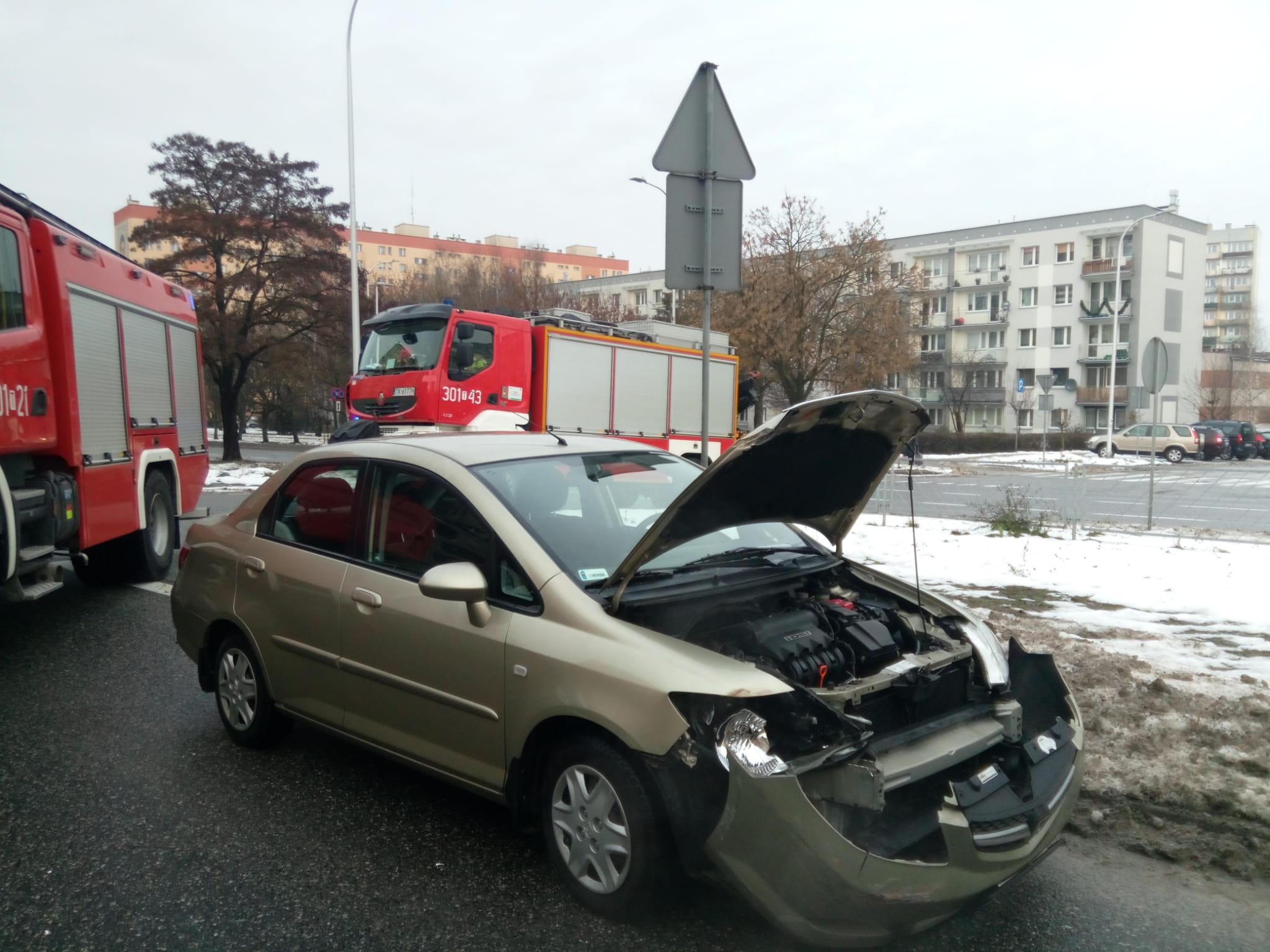 Dwa auta osobowe: Honda i Hyundai, którymi łącznie podróżowały 3 osoby zderzyły się tuż przy budynku Państwowej Straży Pożarnej. Wszyscy uczestnicy zdarzenia samodzielnie opuścili pojazdy i nie wymagali pomocy medycznej. Strażacy zabezpieczyli teren akcji i odłączyli zasilanie z akumulatorów w pojazdach. W wyniku zdarzenia zniszczone zostały barierki oddzielające jezdnie na pasie zieleni.