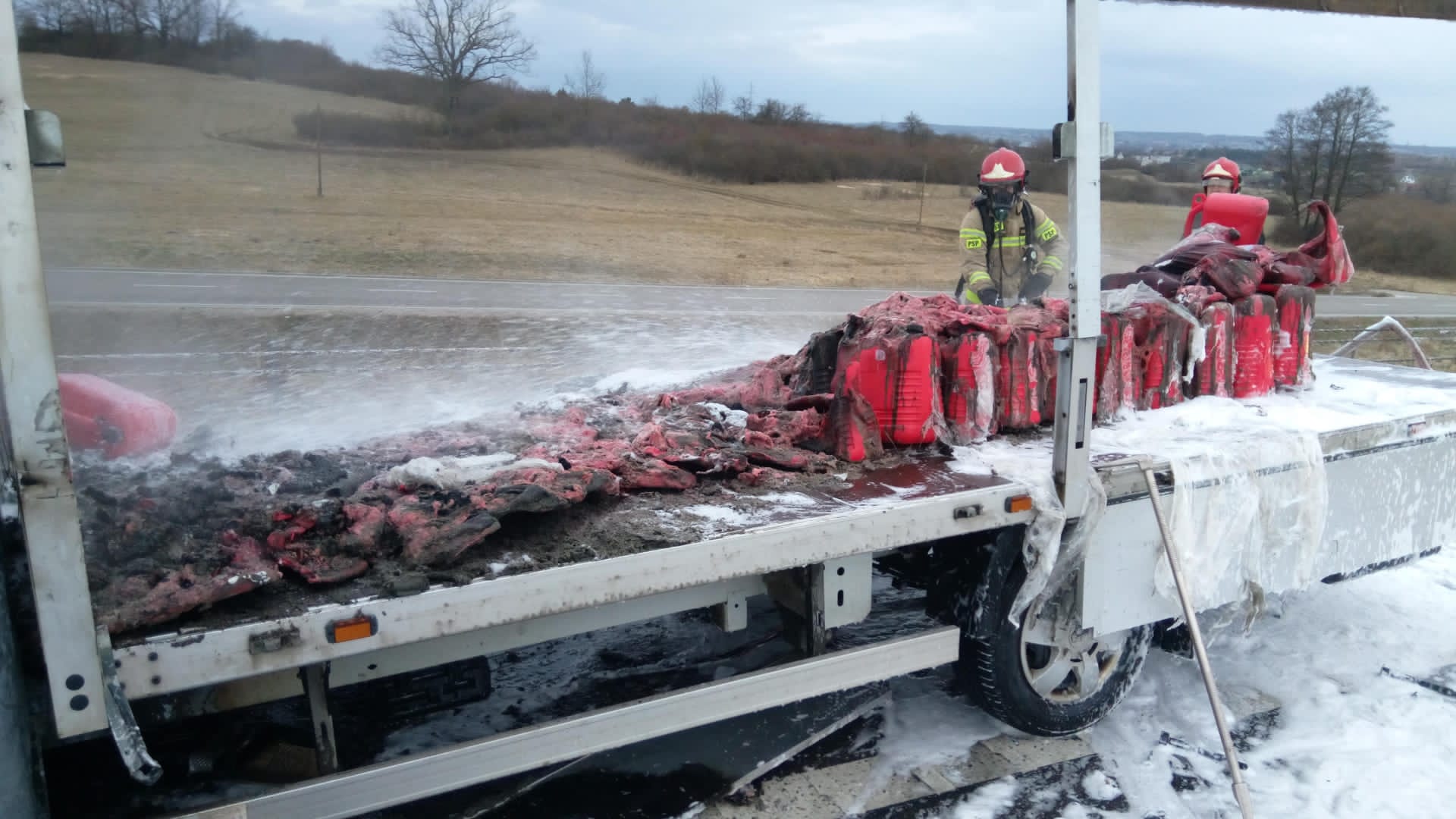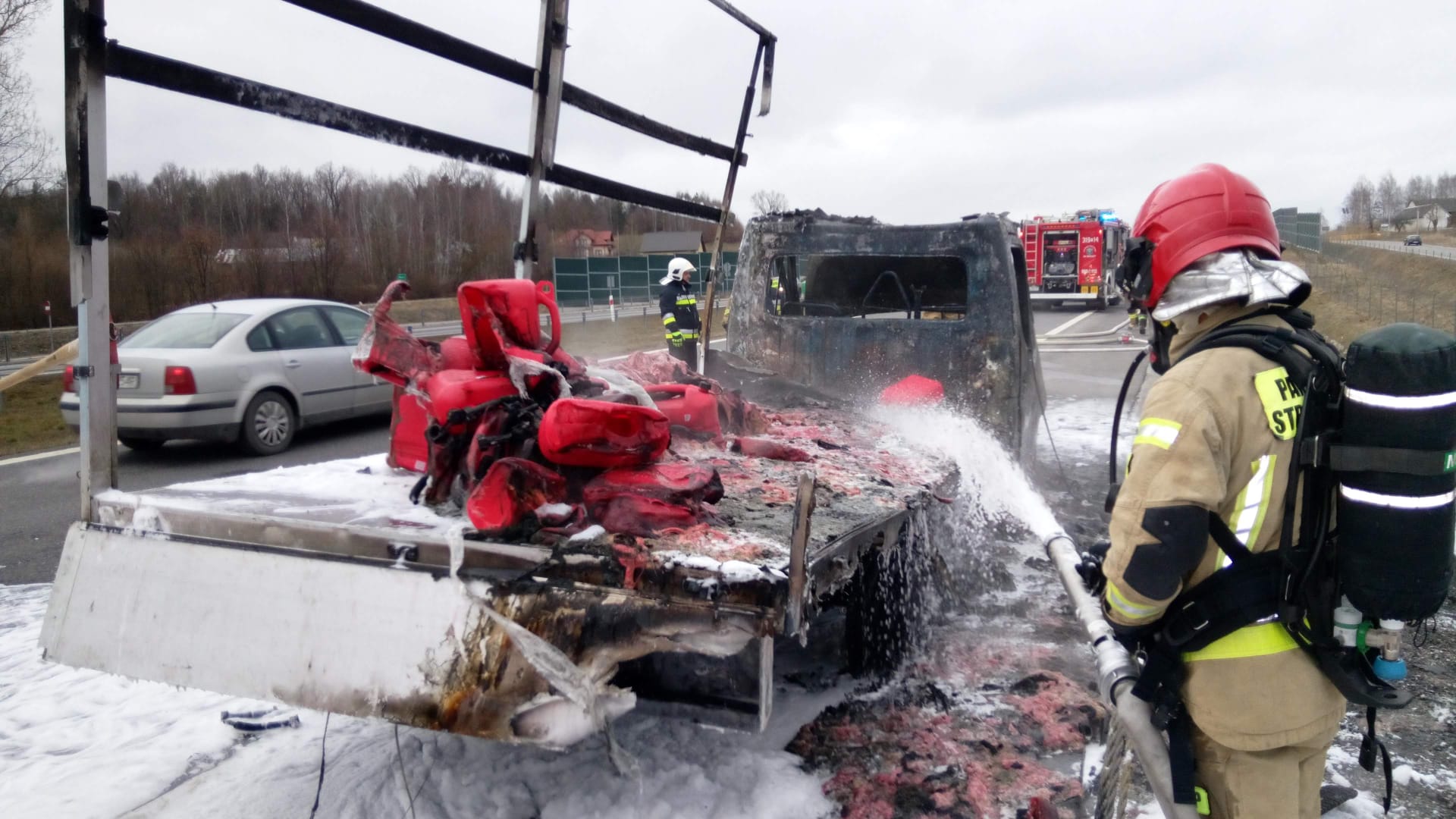 Ogień objął cały samochód dostawczy marki Renault Master, stojący na poboczu drogi ekspresowej S7. Auto przewoziło ładunek pustych kanistrów z tworzywa sztucznego. Podróżujący nim kierowca zdążył bezpiecznie zatrzymać auto i wysiąść z niego. Nie wymagał pomocy medycznej i podjął nieskuteczną próbę ugaszenia pożaru dwoma gaśnicami proszkowymi. Ratownicy zabezpieczyli i oznakowali zagrożony teren i ugasili ogień dwoma strumieniami piany ciężkiej. Następnie wrak schłodzono polewając go obficie wodą, a na zakończenie strażacy skontrolowali zniszczone auto kamerą termowizyjną nie znajdując zagrożenia.