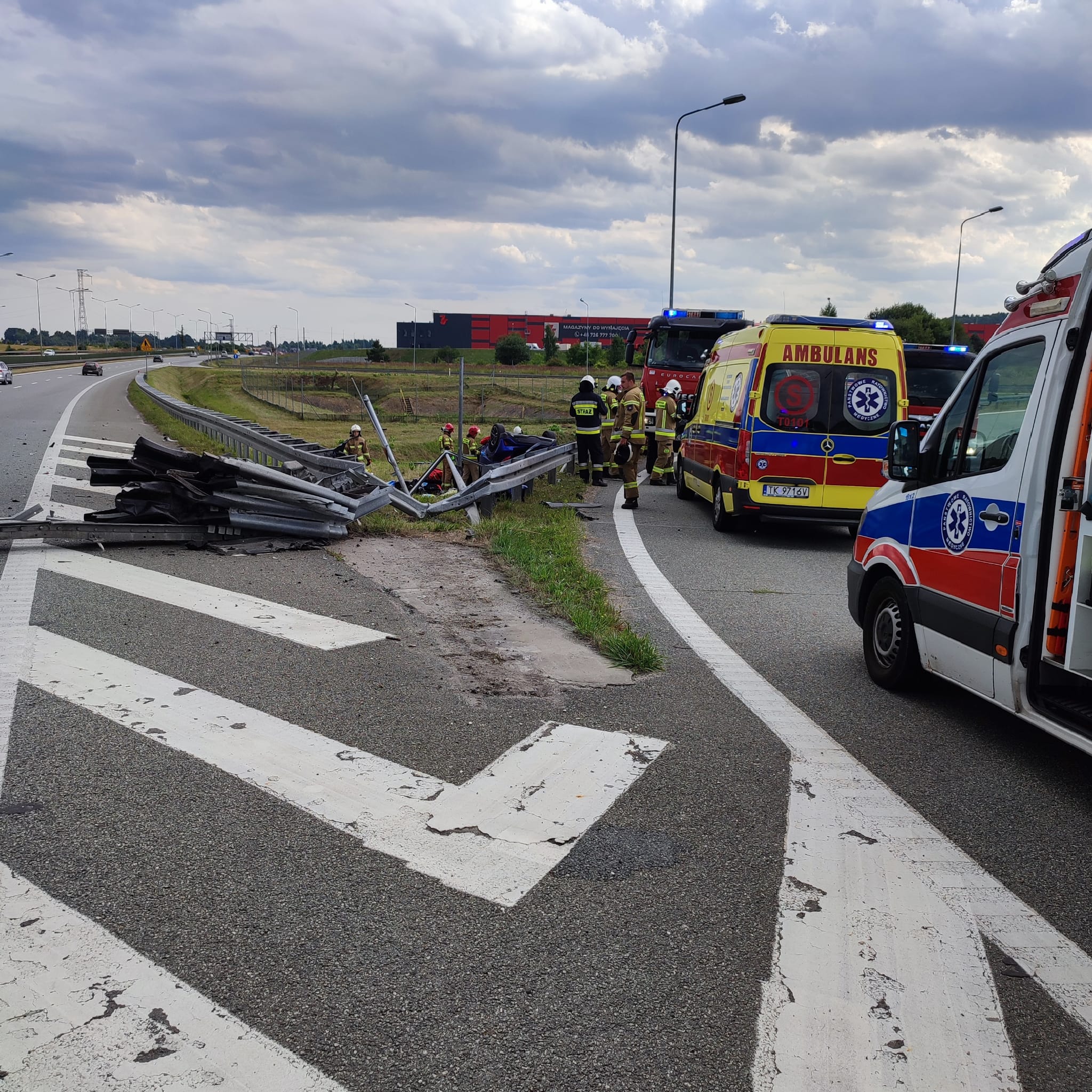 Jadący drogą ekspresową S7 samochód osobowy marki Toyota CH-R uderzył w barierę energochłonną, wypadł z jezdni i leżał na dachu na poboczu. Samochodem podróżowały 3 osoby w tym małe dziecko. Kierowca wraz z maluchem opuścił auto, a wewnątrz została pasażerka. Strażacy zabezpieczyli miejsce zdarzenia, odłączyli zasilanie z akumulatora w pojeździe i wdrożyli procedury z zakresu kwalifikowanej pierwszej pomocy w stosunku do wszystkich uczestników zdarzenia. Do działań medycznych włączyło się 2 lekarzy, którzy byli świadkami tego wypadku. Ratownicy wykonali dostęp do uwięzionej kobiety, a przybyły na miejsce zdarzenia Zespół Ratownictwa Medycznego, po przebadaniu zabrał wszystkich do szpitala. Strażacy zakręcili zawór zbiornika LPG w zniszczonym samochodzie a na zakończenie pomogli uprzątnąć jezdnię.