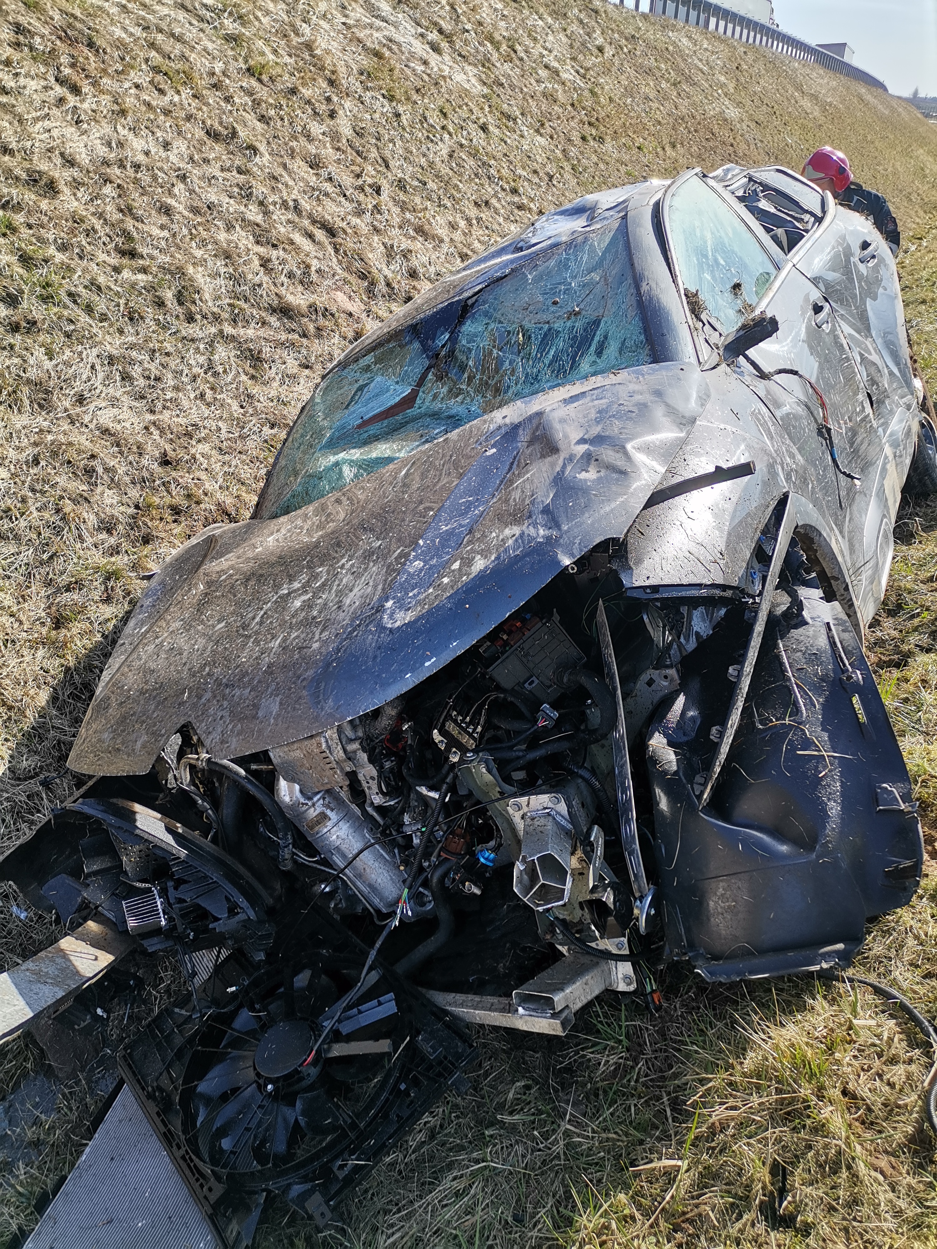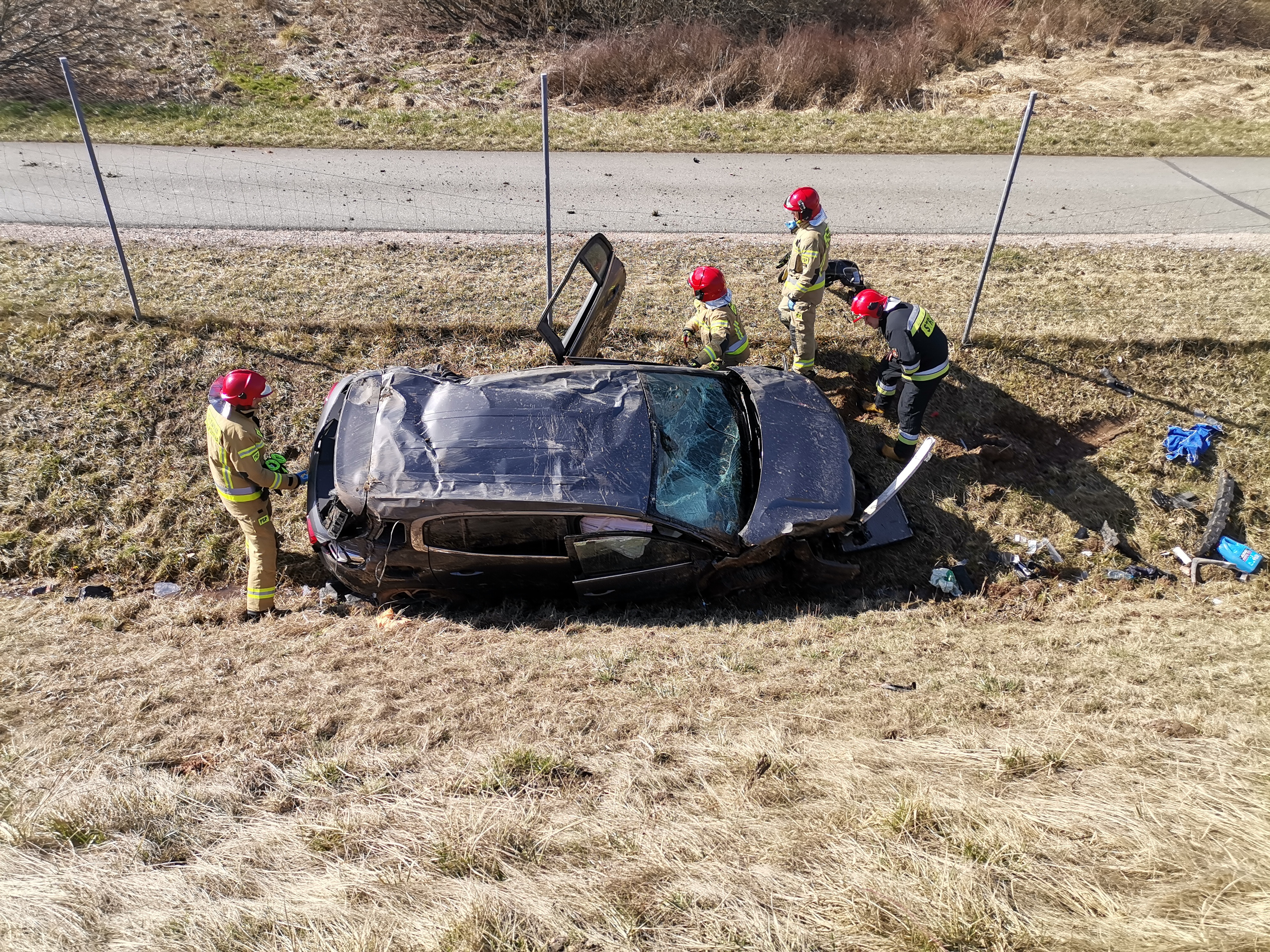 Przy drodze ekspresowej numer S7, w głębokim przydrożnym rowie stał na kołach samochód osobowy marki Citroen C-5 AIRCROSS, który wypadł z drogi i koziołkując spadł z wysokiego nasypu. Pojazdem podróżowała jedynie kierująca nim kobieta, którą zajmował się obecny na miejscu Zespół Ratownictwa Medycznego wraz z funkcjonariuszami Policji. Strażacy zabezpieczyli i oznakowali teren działań oraz przetransportowali poszkodowaną unieruchomioną na noszach w górę stromej skarpy do ambulansu.