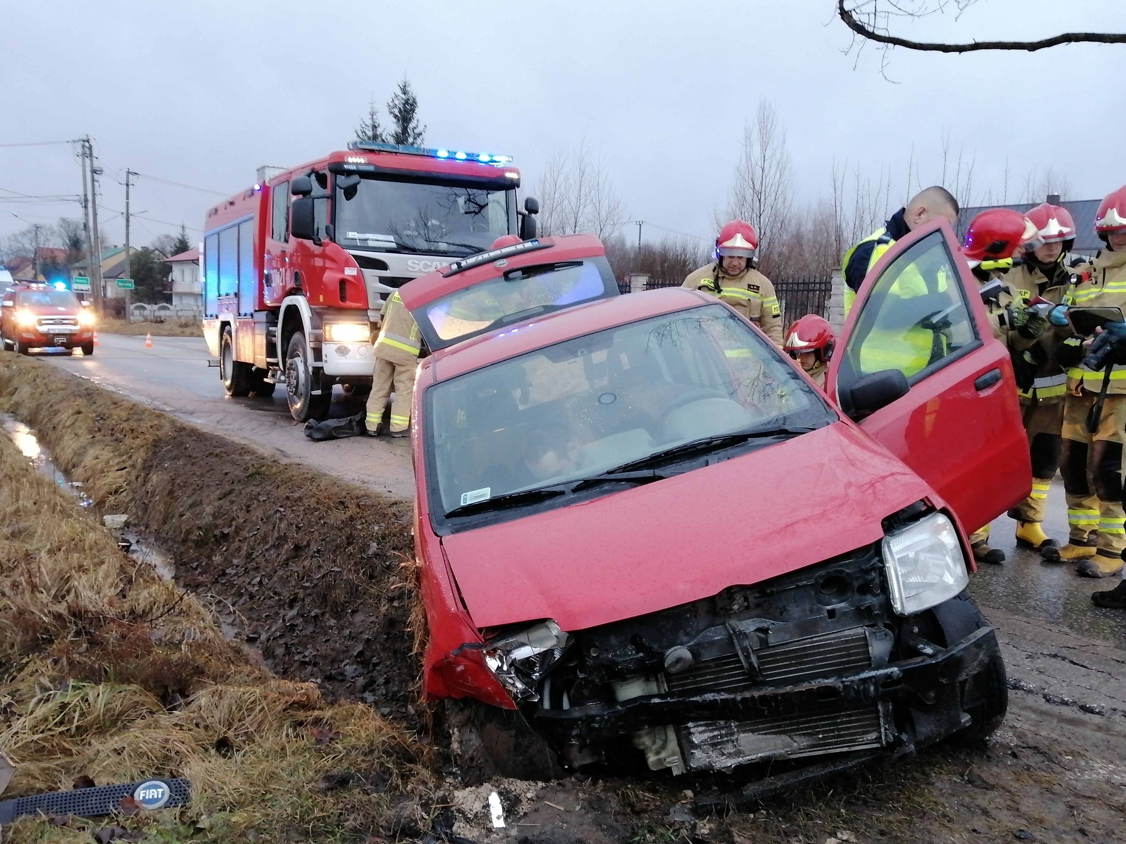 Na miejscu zdarzenia ratownicy zobaczyli, że samochód osobowy marki Fiat Panda wpadł do przydrożnego rowu i uderzył w betonowy przepust. Autem podróżował tylko kierowca, który samodzielnie go opuścił. Uszkodzony pojazd częściowo stał na jezdni i utrudniał ruch. Strażacy zabezpieczyli teren działań i odłączyli zasilanie z akumulatora w samochodzie. Samochód został wyciągnięty z rowu przy użyciu wyciągarki samochodowej i przemieszczony w bezpieczne miejsce. Mężczyzna po przebadaniu został zabrany do szpitala.