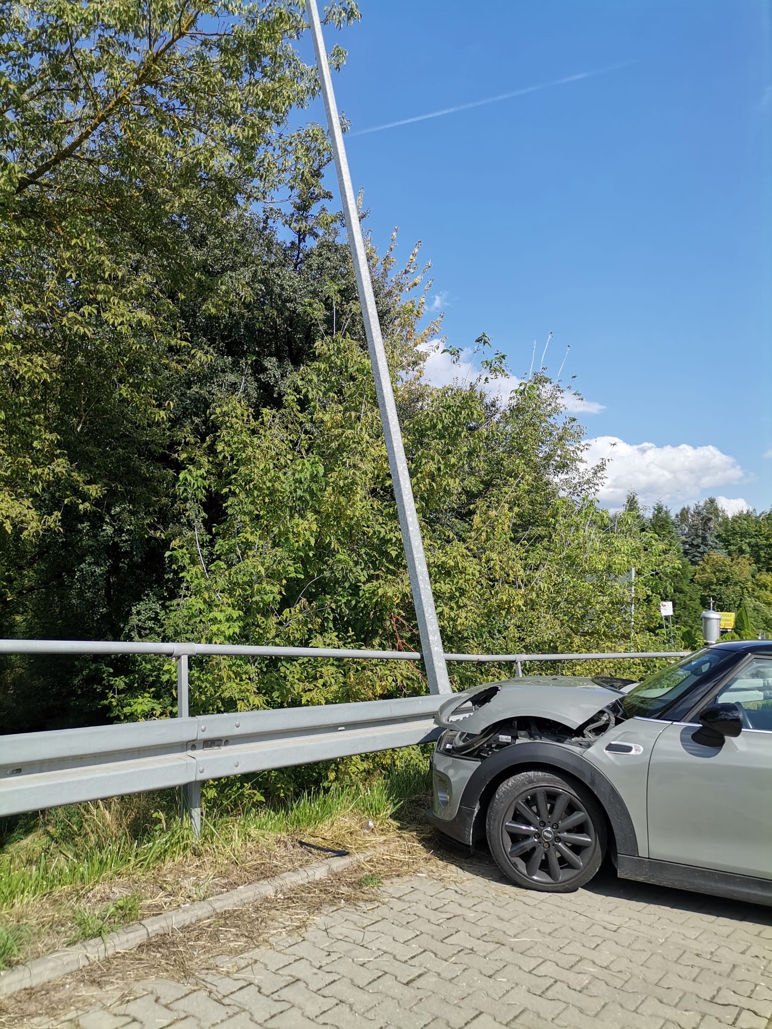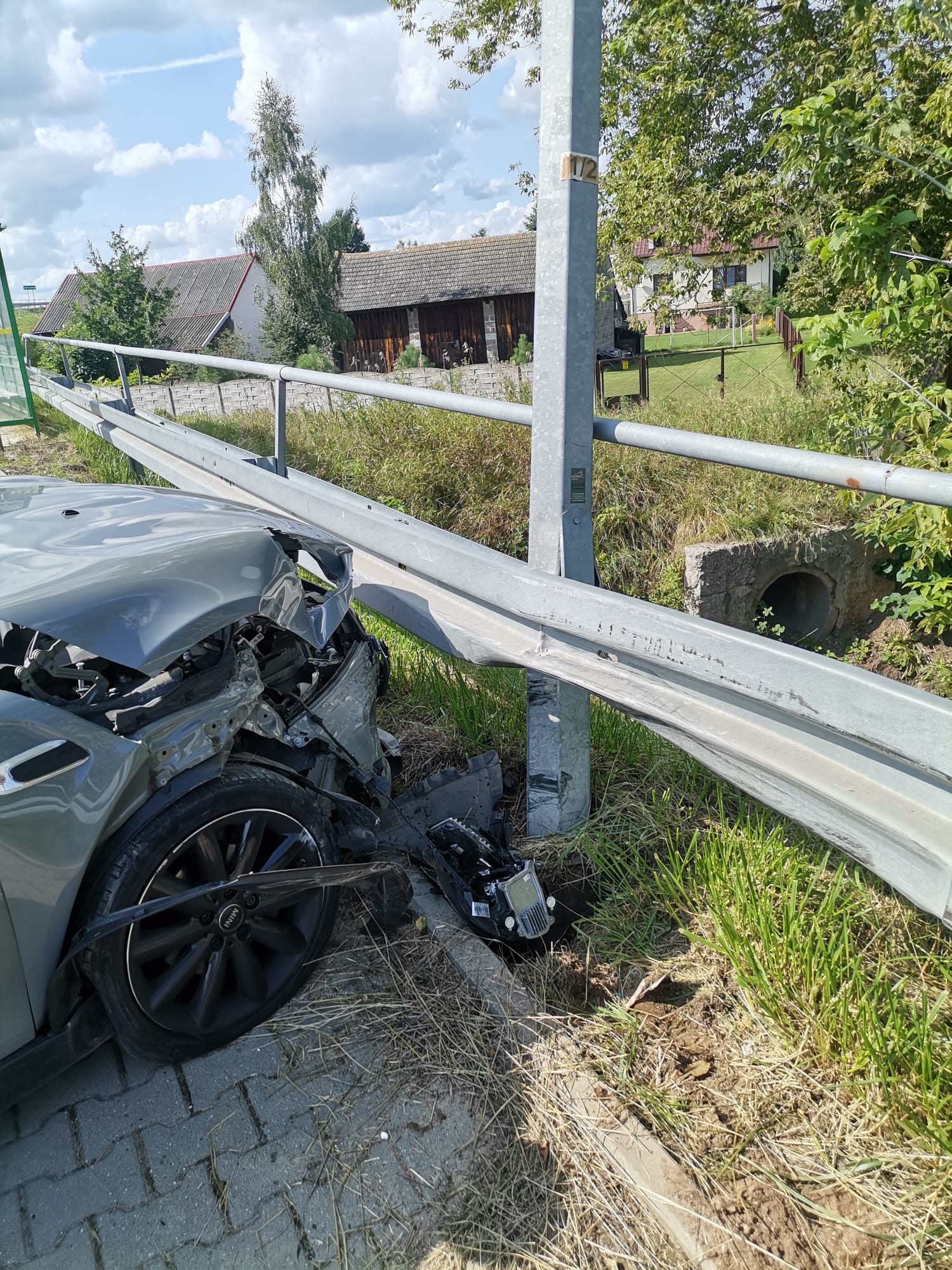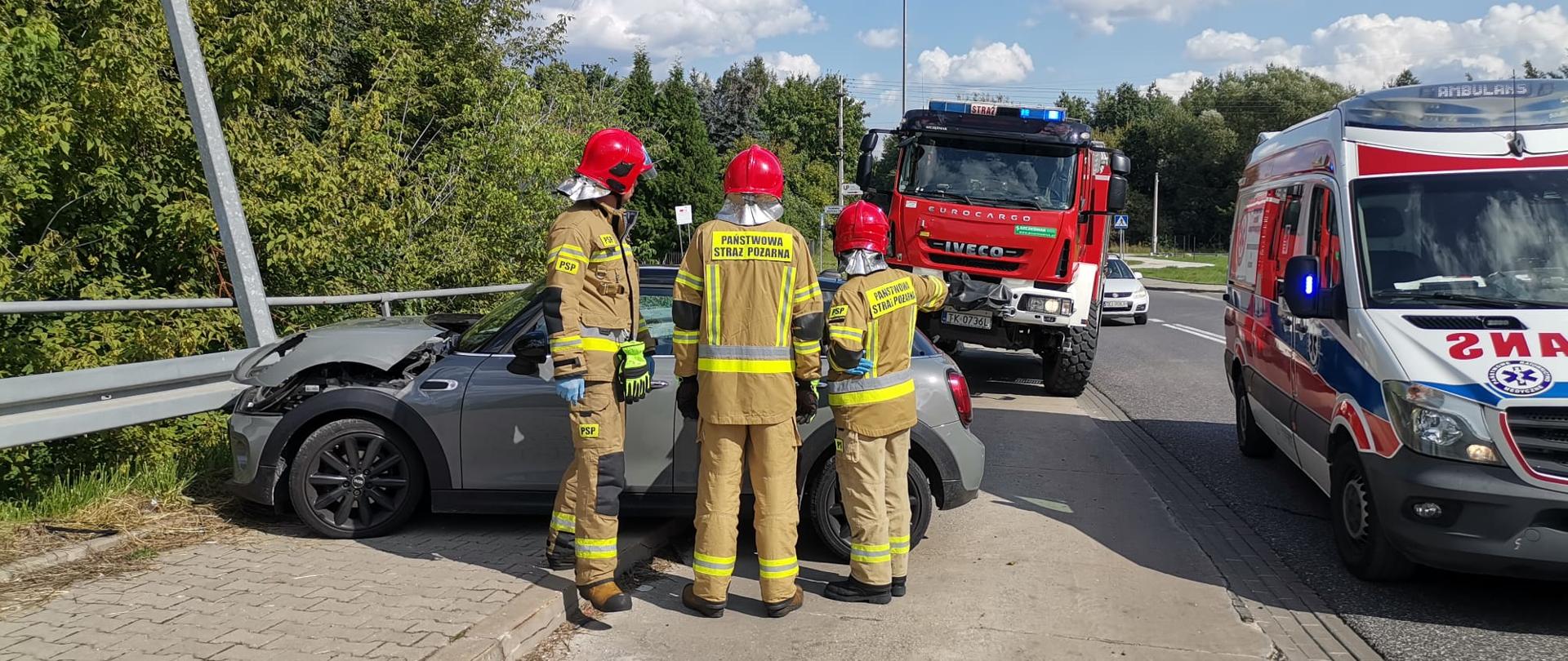 Jadąc drogą wojewódzką numer 786 samochód osobowy marki Mini Cooper wypadł z drogi, uderzył w barierę energochłonną uszkadzając ją oraz słup latarni ulicznej i zatrzymał się na chodniku przy zatoczce autobusowej. Pojazdem podróżowała jedna osoba, która sama wysiała z auta i, w chwili przybycia zastępów straży pożarnej znajdowała się pod opieką personelu Zespołu Ratownictwa Medycznego. Strażacy zabezpieczyli i oznakowali teren działań oraz odłączyli zasilanie z akumulatora w pojeździe. Zespół Ratownictwa Medycznego, który wykonywał wobec poszkodowanej medyczne czynności ratownicze podjął decyzję o zabraniu jej do szpitala. Na zakończenie strażacy sprawdzili stabilność pochylonego słupa latarni ulicznej i nie znajdując zagrożenia opuścili miejsce zdarzenia.
