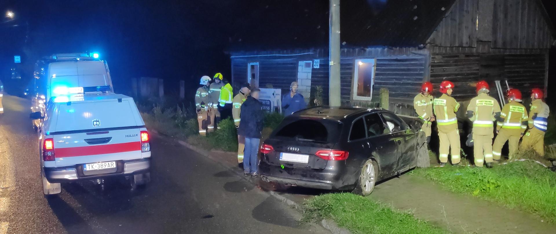 Na drodze wojewódzkiej numer 786 samochód osobowy marki Audi zjechał z drogi i uderzył w budynek jednorodzinny. Autem podróżowały dwie osoby, które samodzielnie go opuściły i znajdowały się pod opieką personelu Zespołu Ratownictwa Medycznego. Kierujący nie wymagał pomocy, zaś pasażer został zabrany do szpitala. W domu, w który uderzył samochód znajdowały się trzy osoby i żadna z nich nie wymagała pomocy medycznej, ale konstrukcja drewniana budynku została mocno nadwyrężona więc mieszkańcy zostali ewakuowani z niego do czasu ostatecznej ekspertyzy. Strażacy zabezpieczyli teren działań, odłączyli zasilanie z akumulatora w zniszczonym pojeździe oraz przemieścili go za pomocą wyciągarki. Następnie podporami budowlanymi ustabilizowali w miarę możliwości budynek i zabezpieczyli go taśmami ostrzegawczymi.