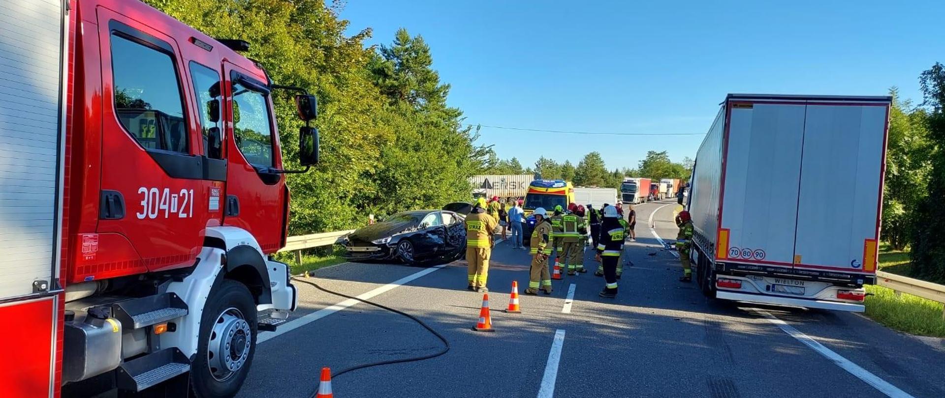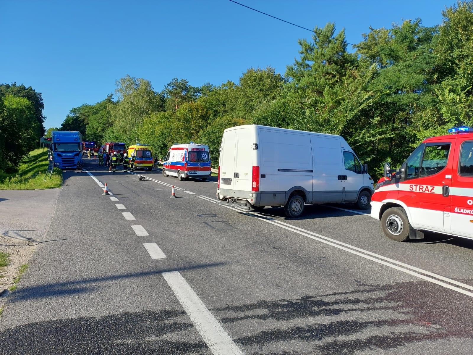 Stanowisko Kierowania Komendanta Miejskiego Państwowej Straży Pożarnej w Kielcach zadysponowało 4 zastępy strażaków. Na drodze w Śladkowie Małym gmina Chmielnik zderzyły się 3 pojazdy: ciągnik siodłowy Scania wraz z naczepą, osobowy Audi A4 i dostawczy Iveco, którymi jechało łącznie 4 osoby, w tym jedno dziecko. Wszyscy wysiedli z uszkodzonych aut stojących na jezdni i blokujących ruch w obu kierunkach. Strażacy w pierwszej kolejności zabezpieczyli i oznakowali teren oraz wdrożyli procedury kwalifikowanej pierwszej pomocy w stosunku do wszystkich poszkodowanych. Przybyły na miejsce Zespół Ratownictwa Medycznego przebadał uczestników zdarzenia i podjął decyzję o zabraniu kierującej samochodem Audi do szpitala. Ratownicy usunęli wycieki powstałe na jezdni oraz zabezpieczyli pojazdy odłączając akumulatory w pojazdach. W trakcie działań droga krajowa była nieprzejezdna.
