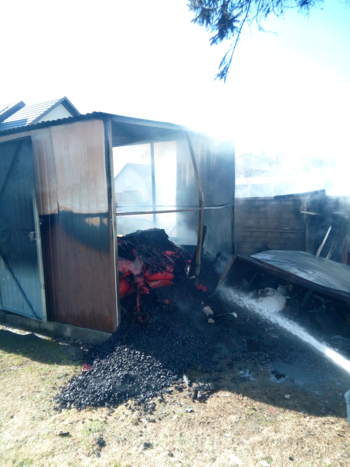Ogień zniszczył materiały zgromadzone w blaszanym garażu wolnostojącym: opał, urządzenia mechaniczne, rowery itp. W działaniach uczestniczyły 4 zastępy strażaków, którzy zabezpieczyli teren, odłączyli energię elektryczną i ugasili pożar. Ogień, oprócz tego co było w garażu, strawił także około 60 m2 wyschniętej trawy oraz pojawiły się zarzewia ognia w dachu przylegającego budynku gospodarczego. Ratownicy ugasili wszystkie ogniska pożaru, wynieśli spalone materiały z garażu w celu ich dokładnego dogaszenia, a na zakończenie sprawdzili pogorzelisko kamerą termowizyjną wykluczając zagrożenia.