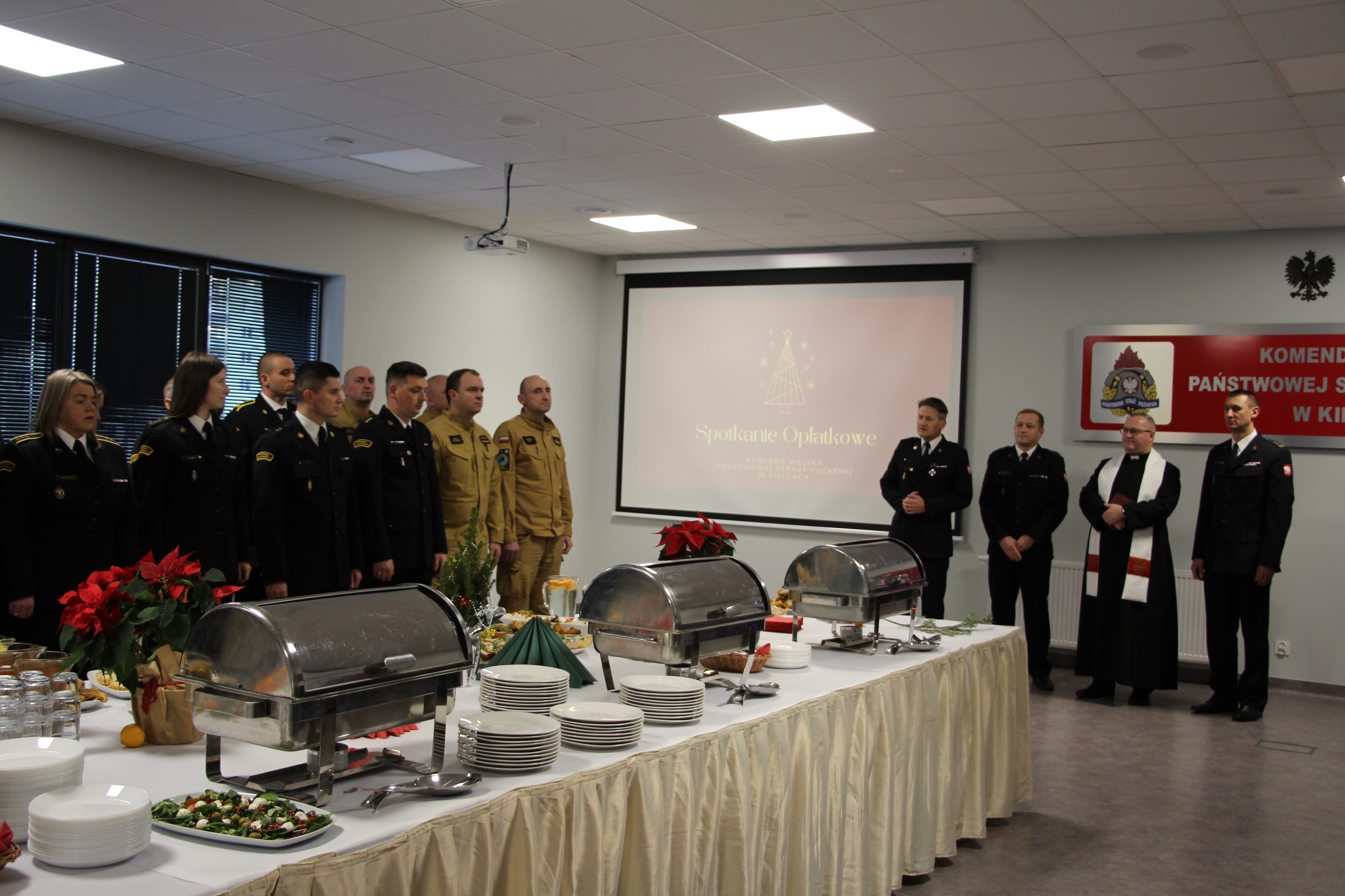 18 grudnia o godzinie 13:30 funkcjonariusze i pracownicy cywilni Komendy Miejskiej Państwowej Straży Pożarnej w Kielcach zgromadzili się w sali konferencyjnej by przy dźwiękach kolędy złożyć sobie świąteczne życzenia. W ciepłej i serdecznej atmosferze odbyło się spotkanie opłatkowe: Komendant Miejski Państwowej Straży Pożarnej w Kielcach bryg. Mariusz Góra w imieniu własnym oraz swoich zastępców złożył wszystkim zgromadzonym oraz ich rodzinom życzenia bożonarodzeniowe, a kapelan kieleckich strażaków ks. Łukasz Zygmunt, odczytał fragment Pisma Świętego. Wspólnie odśpiewano kolędę i każdy osobiście mógł przełamać się opłatkiem składając sobie wzajem indywidualne życzenia. Wszystkim życzymy ciepłych i spokojnych Świąt Bożego Narodzenia, rodzinnej i magicznej atmosfery przy wigilijnych stołach oraz spełnienia marzeń nadchodzącym 2025 roku.