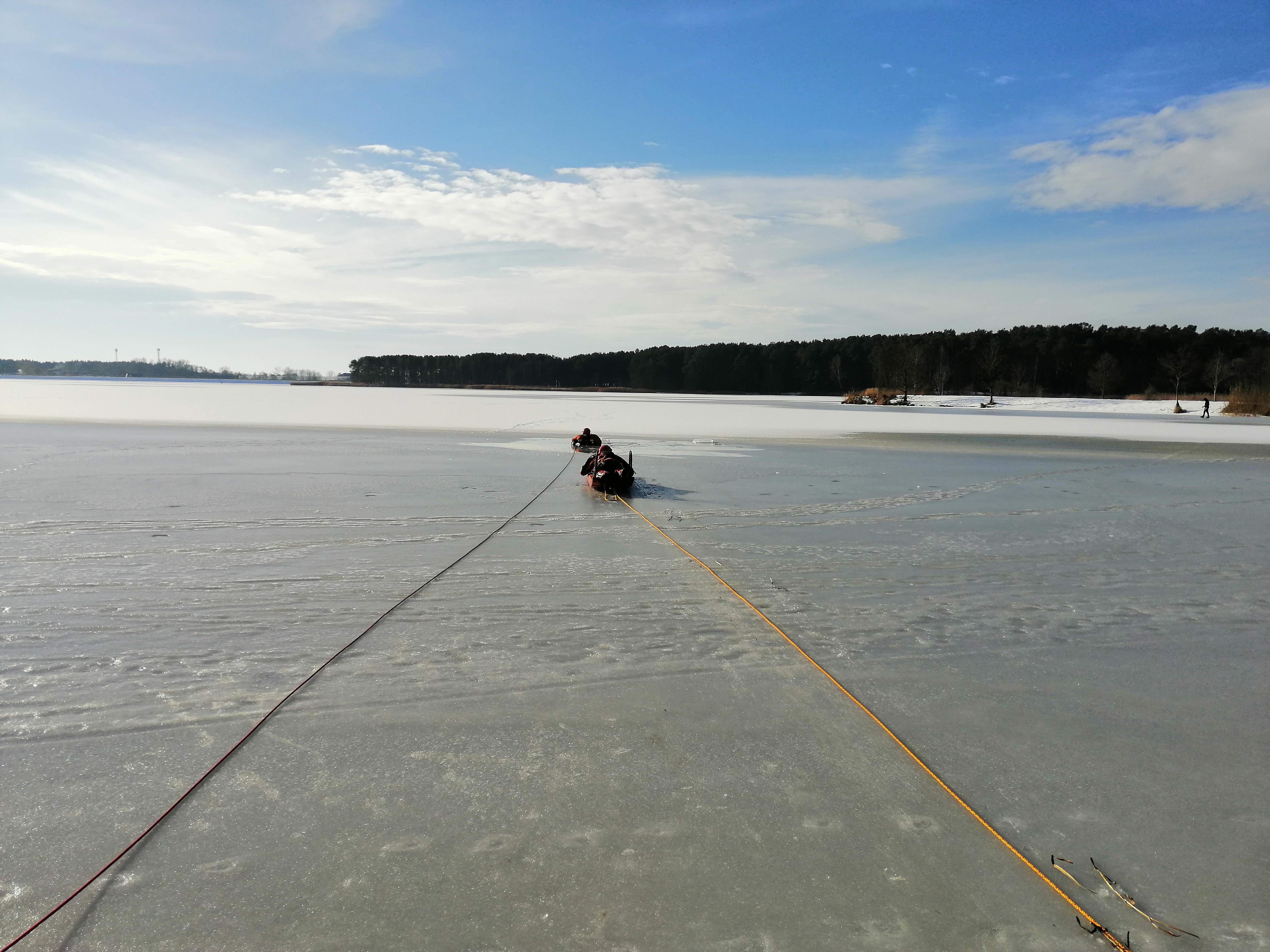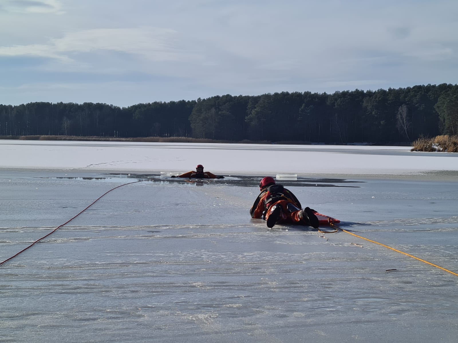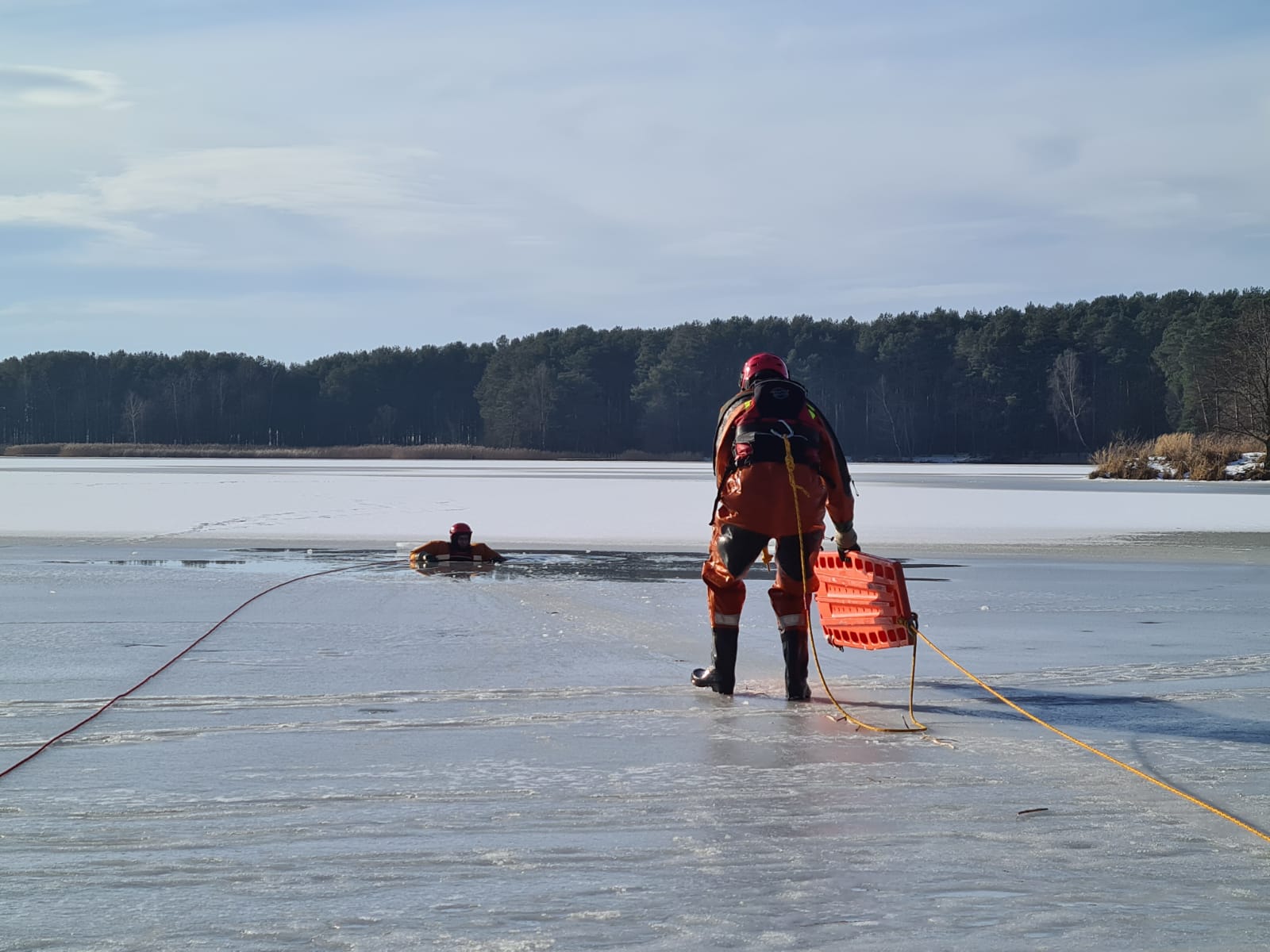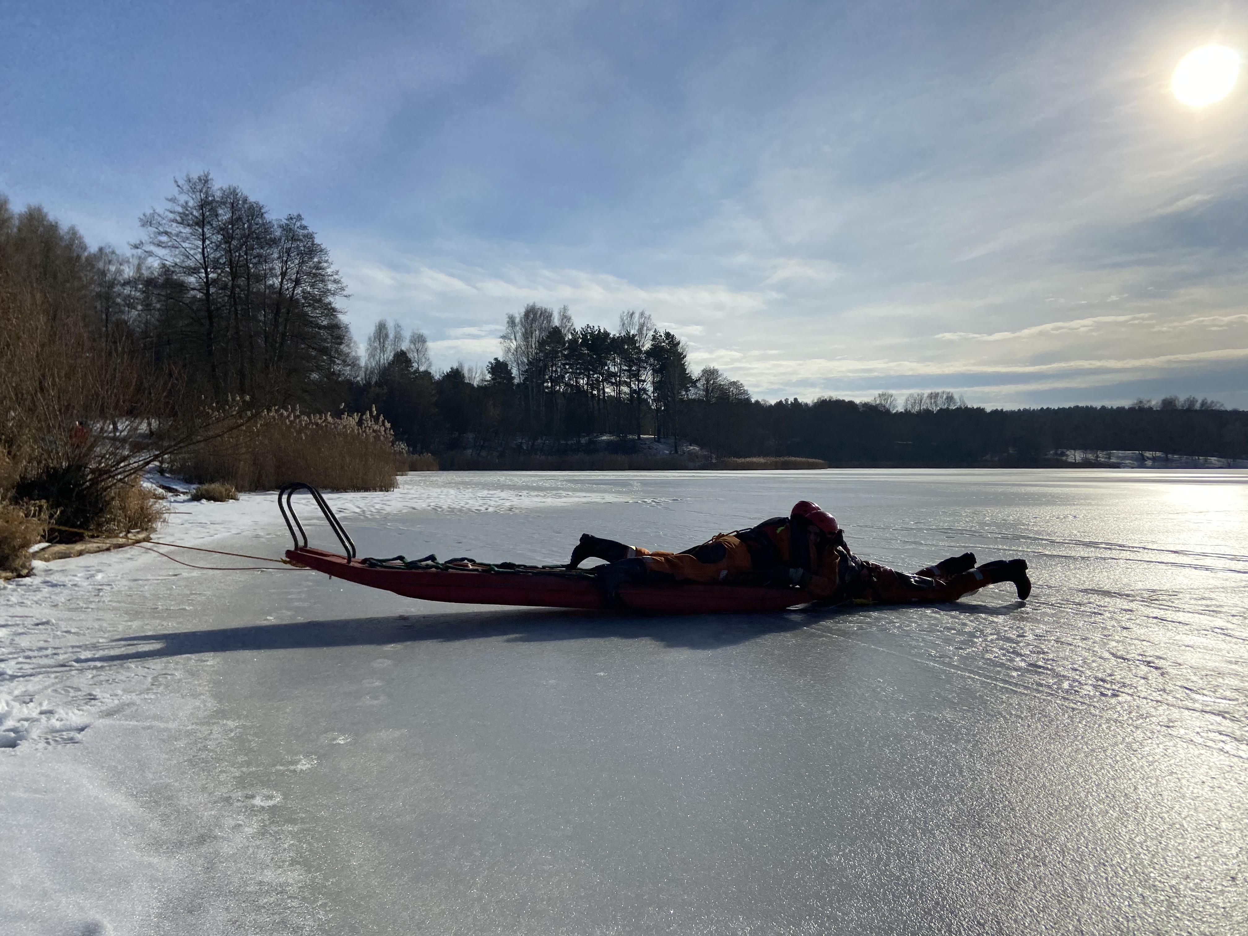 z wykorzystaniem sań lodowych oraz sprzętu ratowniczego.