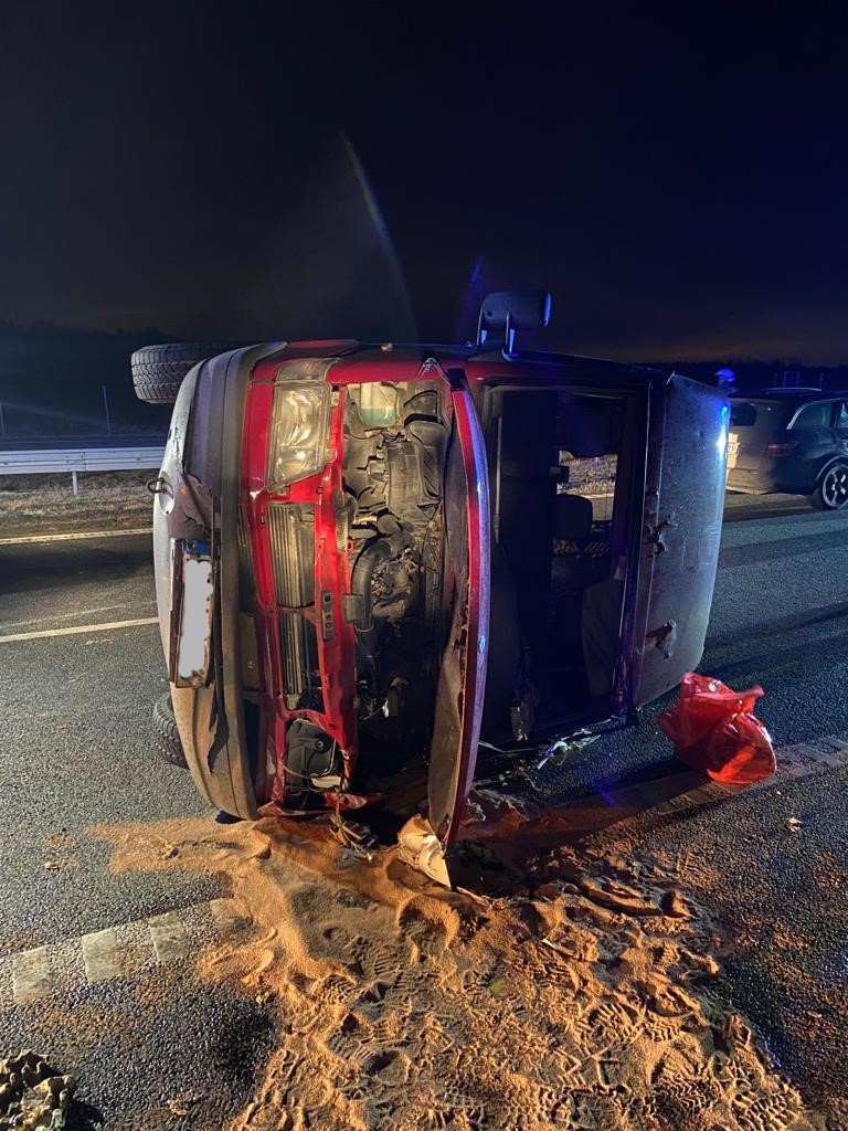 2 samochody: osobowy Mercedes E200 i dostawczy Mercedes Sprinter przewożący transport jajek, którymi podróżowało łącznie 6 osób w tym jedno dziecko, zderzyły się na drodze ekspresowej numer S7. Uszkodzone pojazdy oraz rozsypany ładunek zatarasowały drogę. Poszkodowani samodzielnie opuścili auta i jedynie kierujący z samochodu dostawczego pozostawał w pojeździe. Strażacy zabezpieczyli i oznakowali teren oraz odłączyli zasilanie z akumulatorów w pojazdach. Wraz z personelem ZRM przetransportowali kierowcę z samochodu dostawczego do karetki. Po przebadaniu wszyscy uczestnicy zdarzenia zostali zabrani do szpitala. Na czas prowadzenia działań zamknięto ruch na S7 i zorganizowano objazdy. Po zakończeniu czynności wyjaśniających przyczyny zdarzenia uszkodzone pojazdy ustawiono na koła i zepchnięto na pas awaryjny. Pozostałości ładunku zebrano z drogi, a asfalt spłukano strumieniem wody.