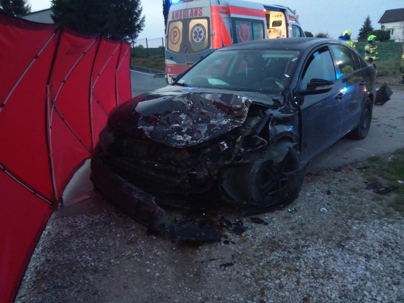 Na drodze gminnej doszło do zderzenia dwóch pojazdów osobowych marki Seat i Volkswagen. Autami jechały łącznie 3 osoby. Kierujący Volkswagenem sam wysiał z pojazdu, a po przebadaniu pozostał na miejscu zdarzenia. Strażacy, którzy przybyli na miejsce zdarzenia zabezpieczyli i oznakowali teren oraz odłączyli zasilanie z akumulatorów w samochodach. Jednocześnie wykorzystując narzędzia hydrauliczne wykonali dostęp do 2 osób poszkodowanych znajdujących się w stojącym w przydrożnym rowie Seacie. Po wydobyciu uwięzionych osób przekazano je personelowi Zespołu Ratownictwa Medycznego. Strażacy oraz personel medyczny wdrożyli procedury ratownicze w stosunku do kierowcy Seata. Kobietę przetransportowano do śmigłowca Lotniczego Pogotowia Ratowniczego i zabrano do szpitala. Mimo wysiłków życia mężczyzny nie udało się ratować. Inne działania funkcjonariuszy straży pożarnej polegały na zabezpieczeniu lądowania i startu śmigłowca LPR, osłonięcia miejsca tragedii parawanami, oświetleniu terenu akcji oraz usunięciu wycieków z jezdni. W czasie trwania działań związanych z usuwaniem skutków wypadku komunikacyjnego droga była zamknięta.