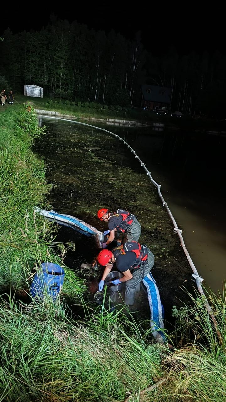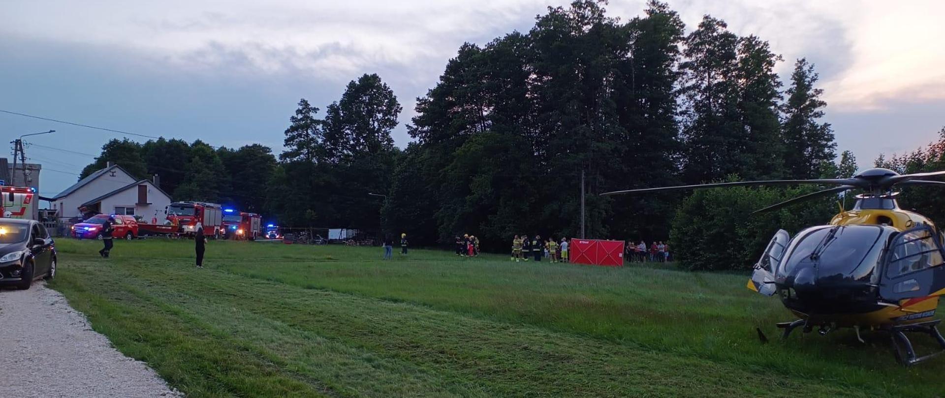 Podczas prac polowych ciągnik rolniczy zsunął się do zbiornika wodnego, a kierujący nim mężczyzna został przygnieciony i uwięziony pod wodą. Pierwsi na pomoc ruszyli okoliczni mieszkańcy, którzy przed przybyciem służb wydobyli poszkodowanego z wody i przekazali zespołowi Lotniczego Pogotowia Ratunkowego. Strażacy zabezpieczyli i osłonili teren działań oraz pomagali służbom medyczny podczas prowadzenia resuscytacji mężczyzny. Wysiłki okazały się daremne i życia poszkodowanego nie udało się uratować. Następnie wyciągnęli pojazd na brzeg i rozpoczęli usuwanie plamy płynów eksploatacyjnych, które wylały się z ciągnika. Ograniczyli wyciek rękawami sorpcyjnymi i zebrali zanieczyszczenia z powierzchni wody.