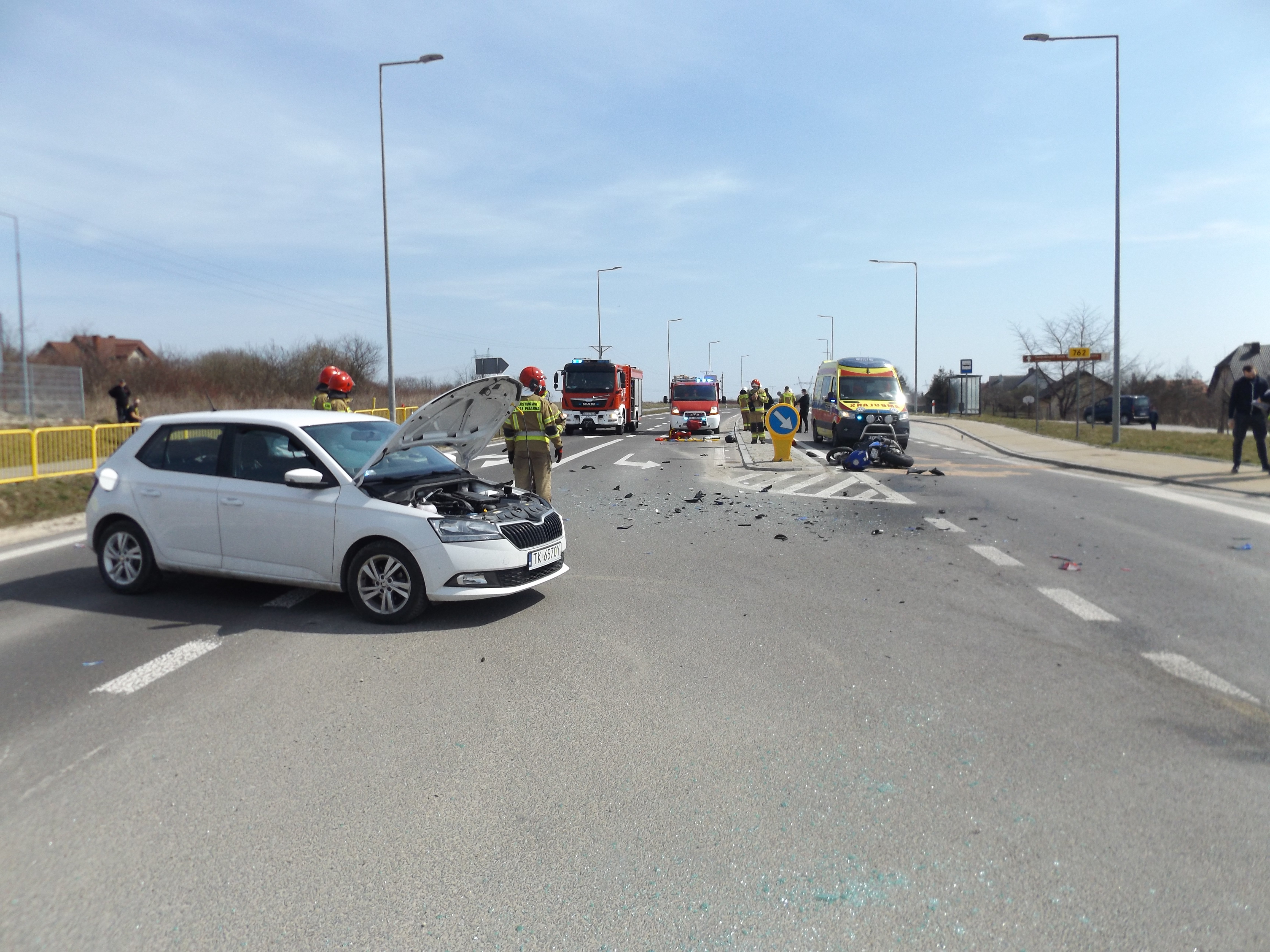 Do zdarzenia zadysponowano dwa zastępy z JRG nr 3 w Kielcach oraz zastęp z OSP Chęciny. Po dojeździe na miejsce zdarzenia zastępu z OSP Chęciny stwierdzono, że na skrzyżowaniu dróg doszło do zderzenia motocykla Honda CBR z samochodem osobowym Skoda Fabia. Kierujący motocyklem w wyniku zderzenia spadł z pojazdu i leżał nieprzytomny na drodze. Działania straży pożarnej w początkowej fazie działań polegały na zabezpieczeniu miejsca zdarzenia i udzieleniu kwalifikowanej pierwszej pomocy poszkodowanemu. Ratownicy po udrożnieniu dróg oddechowych przystąpili do wykonania resuscytacji krążeniowo-oddechowej, jednocześnie podłączając Defibrylator AED. Przybyły na miejsce zdarzenia Zespół Ratownictwa Medycznego, przejął poszkodowanego i kontynuował resuscytację krążeniowo-oddechową. Pomimo prowadzonych czynności medycznych, lekarz stwierdził zgon motocyklisty. Kierującemu samochodem osobowym również udzielono pomocy medycznej a następnie przetransportowano do szpitala. Strażacy odłączyli akumulatory w pojazdach oraz poddali sorpcji znajdujące się na jezdni płyny eksploatacyjne. Po zakończeniu czynności dochodzeniowo-śledczych prowadzonych przez policję pod nadzorem prokuratorskim, pojazdy zostały odholowane przez pomoc drogową.