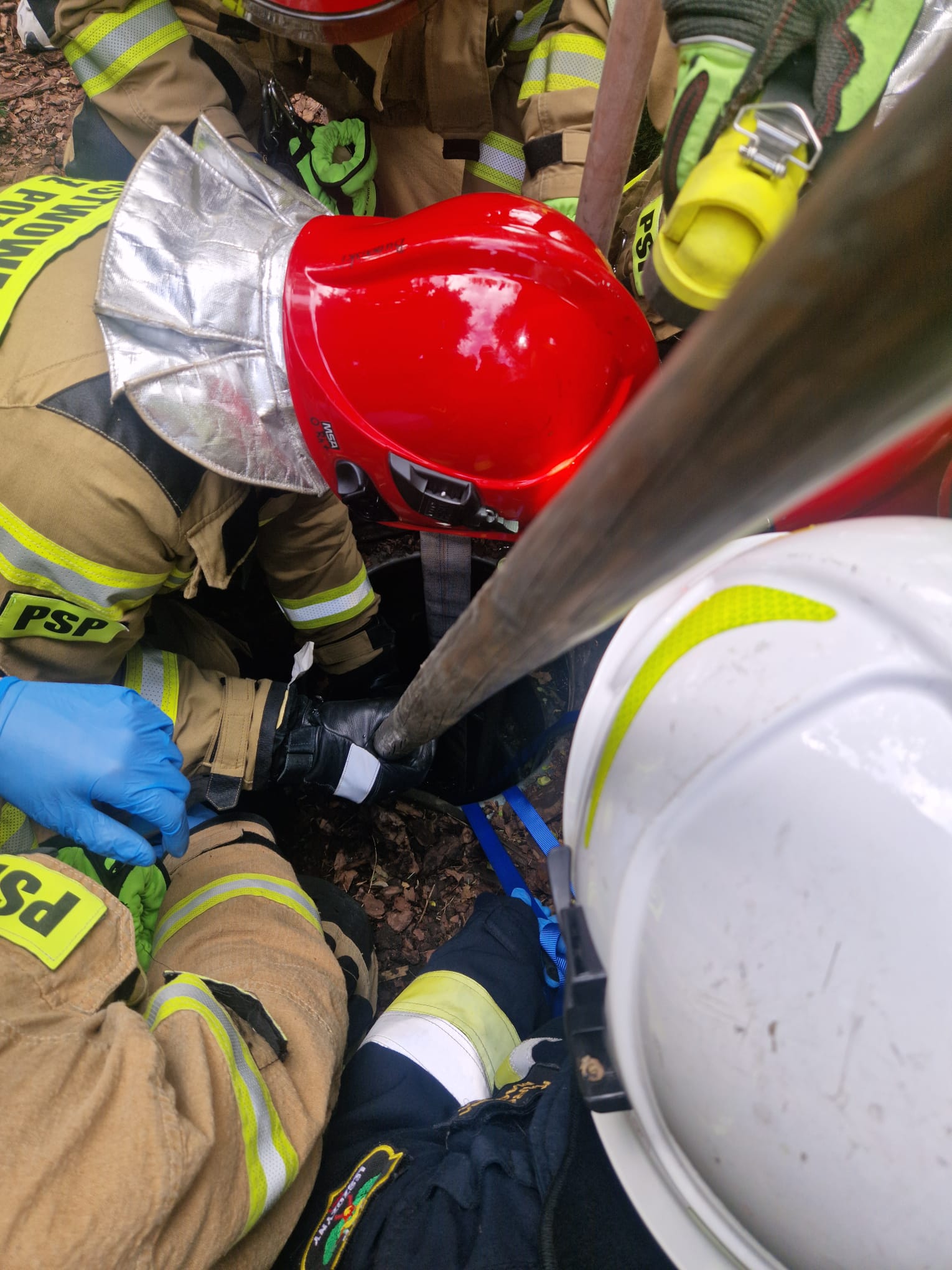 Zgłoszenie, które około 10 rano wpłynęło do kieleckich strażaków od razu znamionowało swoją niezwykłość: w Radlinie kaleki pies bez jednej łapy wpadł do szamba. Strażacy w sile 3 zastępów ruszyli aby ratować psie życie. To była prawie 2-godzinna trudna walka. Duży pies wpadł przez niewielki otwór i utknął na głębokości około 2 metrów w jednej z komór gdzie znajdowały się nieczystości już po częściowej filtracji. Strażacy odłączyli zasilanie elektryczne podpięte do zbiornika i skontrolowali atmosferę wewnątrz: urządzenia pomiarowe wykazały niewielkie ilości siarkowodoru oraz zmniejszoną wartość tlenu. Właściciel przed przyjazdem służb opróżnił komorę tak, że zwierzę choć wycieńczone znalazło się na dnie zbiornika. I tu pojawił się problem: niewielkie rozmiary wyłazu i znaczne gabaryty psa nie pozwalały łatwo wydobyć go na zewnątrz. Strażacy w porozumieniu z właścicielem odsłonili zbiornik i częściowo zdemontowali wyłaz tak aby powiększyć dostęp. Aby pomóc zwierzęciu oddychać strażacy w czasie wykonywania dostępu, doprowadzili przewód z tlenem w okolice pyska leżącego psa. Gdy dostęp był dostatecznie duży do komory wszedł zabezpieczony ratownik, który używając pasa transportowego przygotował zwierzę do wydobycia. Teraz sprawa była już prosta: pies został wyciągnięty a właściciel udał się z nim do lekarza.
