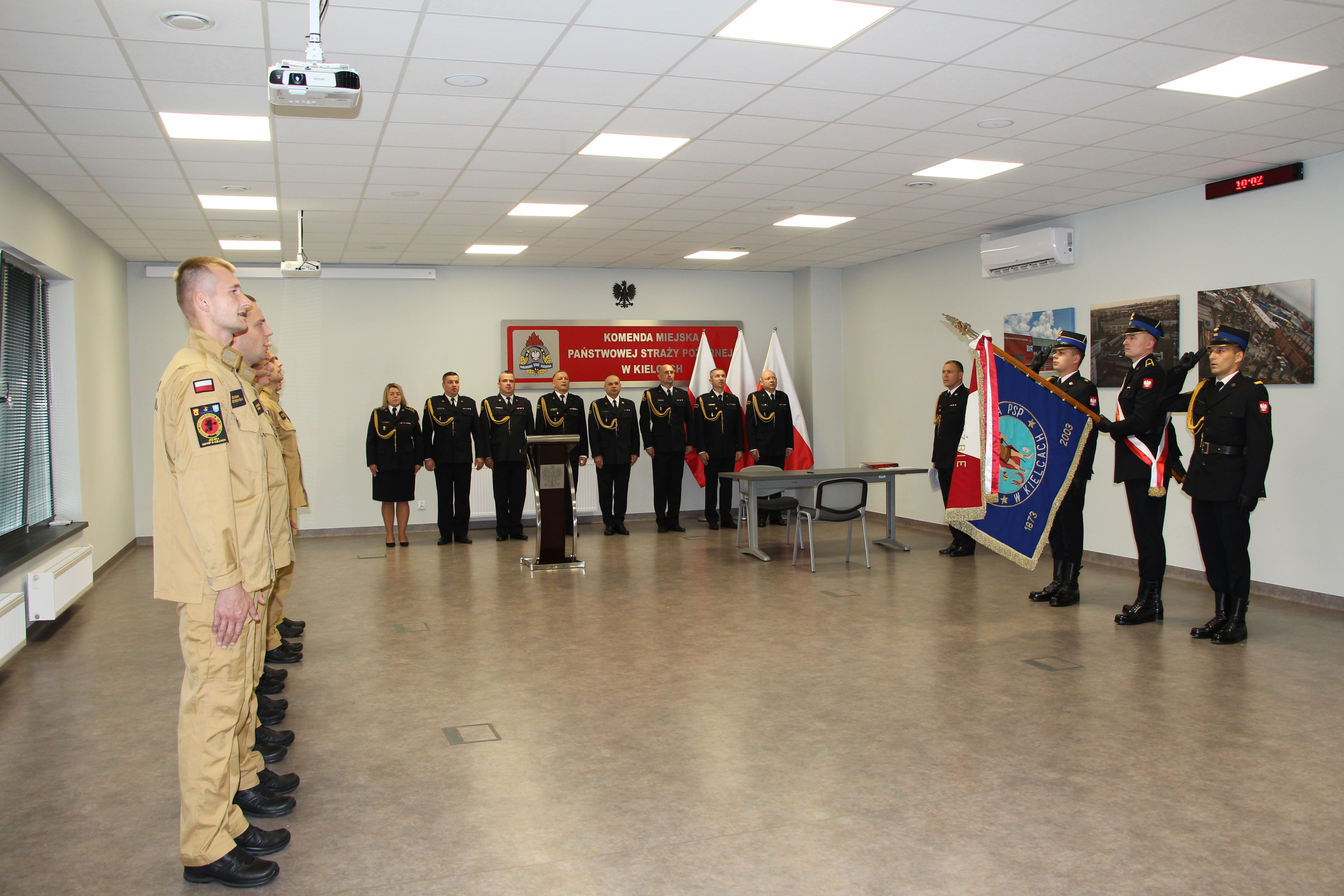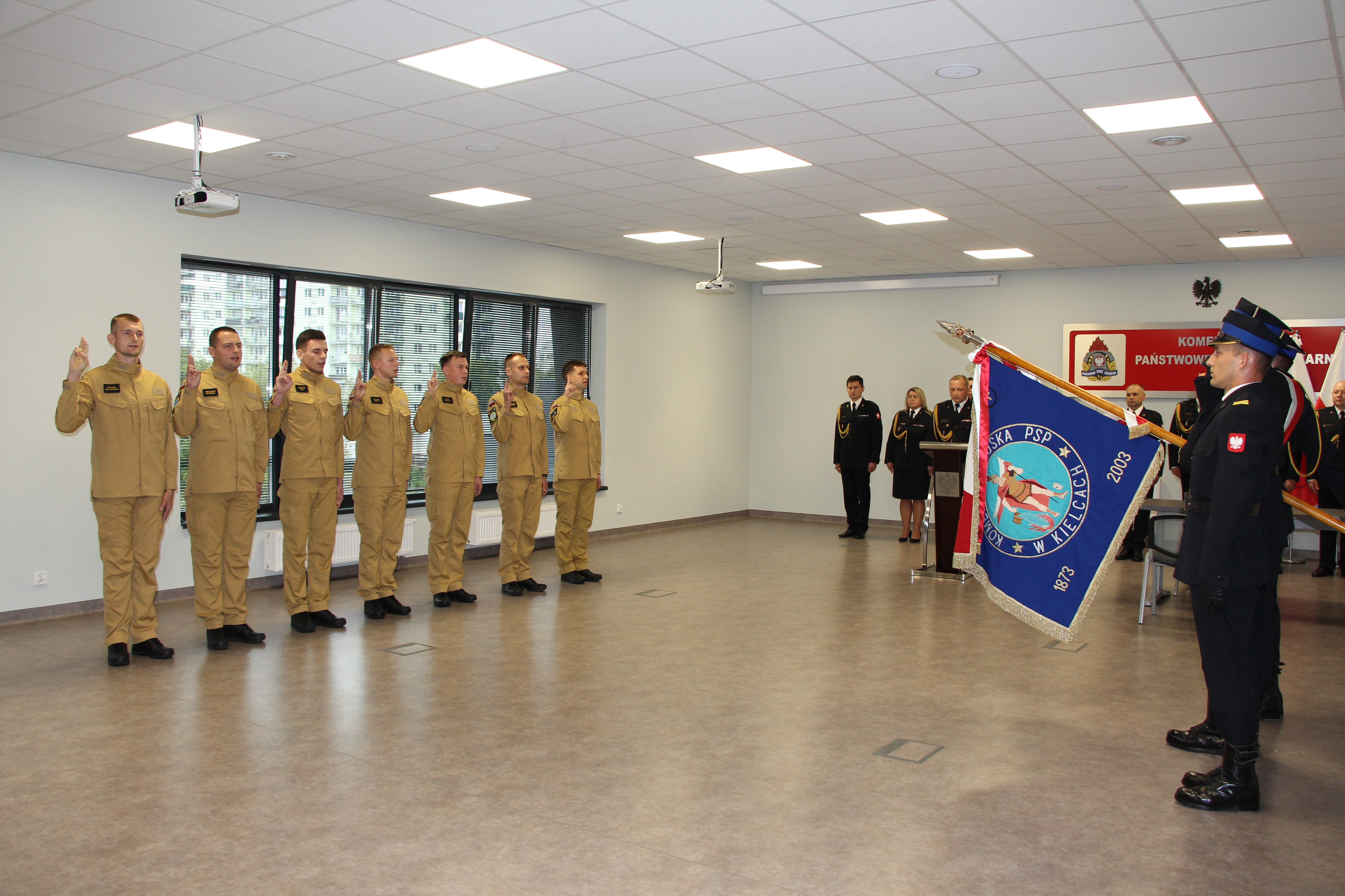 Świadkami tego podniosłego dla każdego młodego strażaka wydarzenia byli zastępcy komendanta miejskiego Państwowej Straży Pożarnej st. bryg. Piotr Sokól i bryg. Piotr Wieczorek, dowódcy jednostek ratowniczo-gaśniczych oraz naczelnicy wydziałów organizacyjnych komendy miejskiej. 7 nowoprzyjętych strażaków złożyło ślubowanie przed sztandarem Komendy Miejskiej PSP w Kielcach. Wypowiedzenie słów roty to obowiązek, który dopełnia każdy strażak wstępujący w szeregi Państwowej Straży Pożarnej. Ślubowanie to bardzo uroczysta i podniosła chwila stanowiąca symbol włączenia do formacji cieszącej się społecznym uznaniem, jest to też potwierdzenie własnej tożsamości zawodowej. Teraz, przed zaprzysiężonymi strażakami trzymiesięczne szkolenie podstawowe w zawodzie strażaka, po którym rozpoczną służbę w jednostkach ratowniczo-gaśniczych.