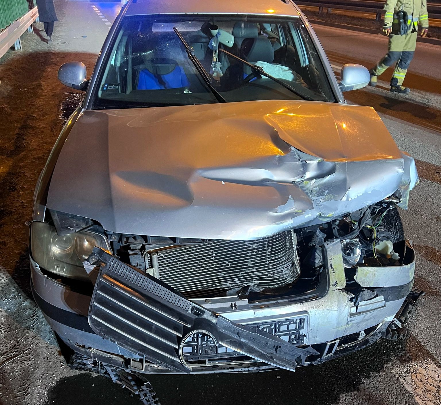 Dwa samochody osobowe Volkswagen Passat i Seat Ibiza wiozące łącznie 5 osób w tym dziecko, zderzyły się na drodze krajowej numer 73. Wszyscy pasażerowie bezpiecznie wysiedli z pojazdów, ale w trakcie prowadzenia działań chłopiec i 2 osoby z Seata poczuli się gorzej. Zespół Ratownictwa Medycznego przebadał poszkodowanych i cała trójka została zabrana do szpitala. Strażacy zabezpieczyli i oznakowali teren działań oraz, w pierwszej fazie przystąpili do udzielania kwalifikowanej pierwszej pomocy poszkodowanym. Odłączyli także zasilanie z akumulatorów w autach i usunęli powstałe na jezdni wycieki. Droga w czasie działań była całkowicie zablokowana, a ruch odbywał się pasem serwisowym.