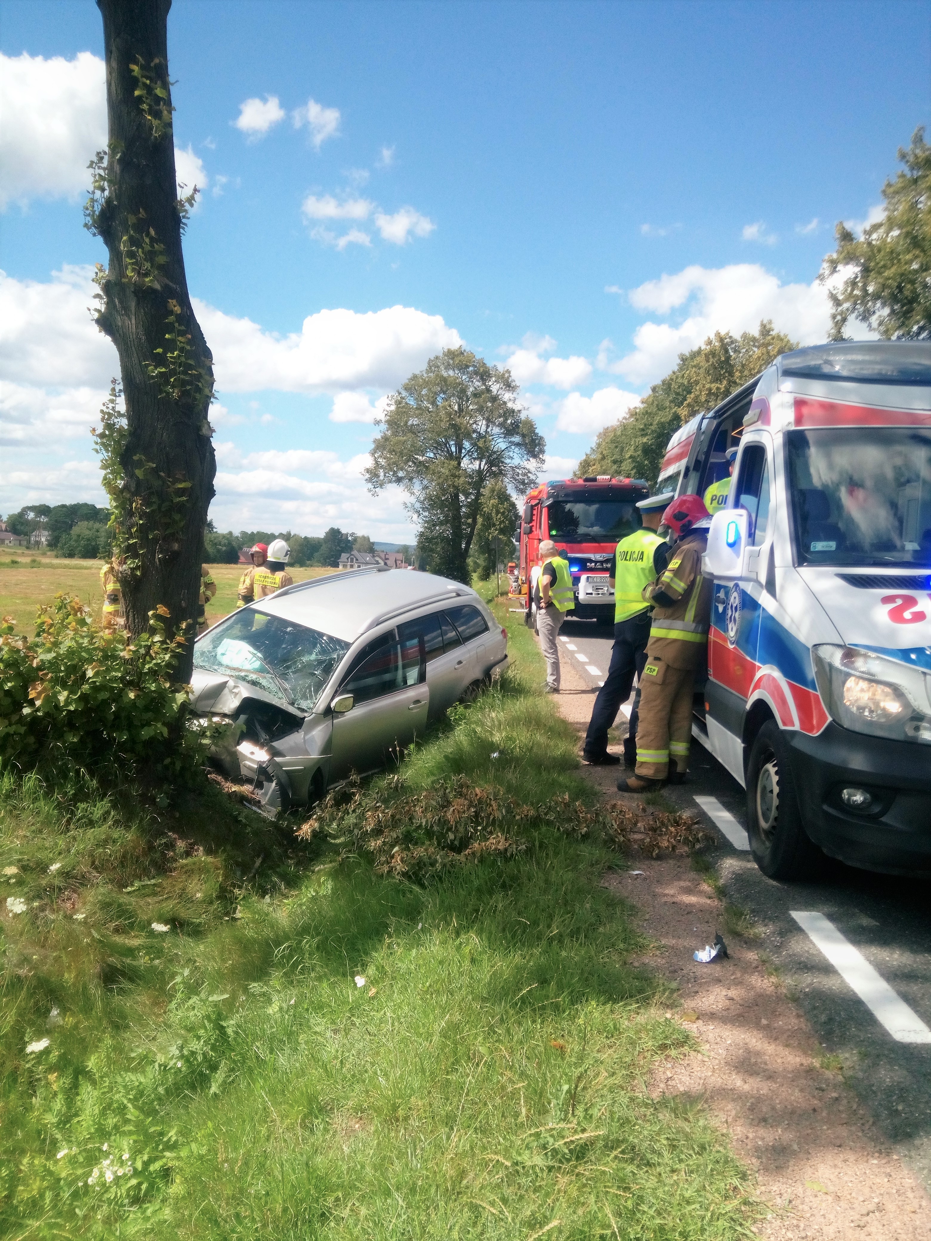 Samochód osobowy marki Toyota Avensis, którym podróżował jedynie kierowca, wypadł z drogi, uderzył w drzewo i znajduje się w przydrożnym rowie. Ratownicy zabezpieczyli miejsce zdarzenia i wdrożyli procedury z zakresu kwalifikowanej pierwszej pomocy w stosunku do poszkodowanego. Odłączono również zasilanie z akumulatora w pojeździe. Mężczyzna, po przekazaniu Zespołowi Ratownictwa Medycznego został zabrany do szpitala. Ponad półtorej godziny trwała akcja ratunkowa, w której brały udział 4 zastępy straży pożarnej w tym 17 ratowników.