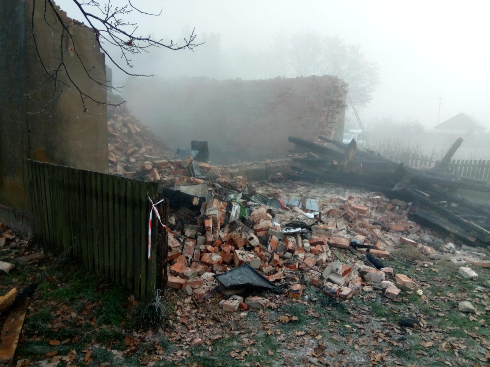 Budynek mieszkalny murowany, kryty eternitem w całości objęty był ogniem, a jego lokator, z widocznymi poparzeniami znajdował się na zewnątrz. Prawdopodobnie wybuch gazu, do którego doszło przed przyjazdem straży pożarnej zniszczył ścianę zewnętrzną i wyrzucił mężczyznę poza budynek. Zakład energetyczny wyłączył zasilanie elektryczne w całej miejscowości. Strażacy zabezpieczyli teren działań i wdrożyli procedury kwalifikowanej pierwszej pomocy w stosunku do poszkodowanego. Po przyjeździe Zespół Ratownictwa Medycznego przejął opiekę nad mężczyzną i zabrał go do placówki medycznej. Równocześnie prowadzono akcję gaśniczą. Po ugaszeniu ognia strażacy przeszukali budynek w wyniku czego schłodzili i wynieśli 2 puste butle gazowe 11-sto kilogramowe. Zdemontowali także nadpalone elementy konstrukcyjne. Na zakończenie miejsce pożaru oraz butle gazowe sprawdzono kamerą termowizyjną nie wykazując żadnych miejsc z podwyższona temperaturą.