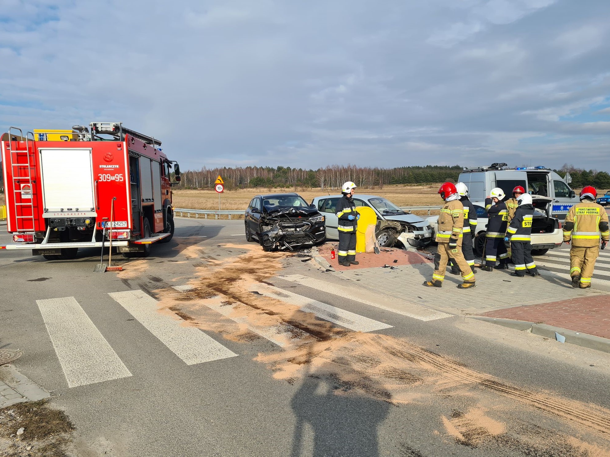 Na drodze wojewódzkiej w miejscowości Suków doszło do zderzenia trzech samochodów osobowych: Renault Scenic, BMW X1 i BMW 420. Autami jechały tylko osoby kierujące: 3 kobiety, które przed przybyciem straży pożarnej samodzielnie opuściły pojazdy. Dwie z nich zostały zaopatrzone i zabrane do szpitala przez personel Zespołu Ratownictwa Medycznego. Strażacy po zabezpieczeniu miejsca zdarzenia, odłączyli zasilanie z akumulatorów oraz usunęli powstałą na jezdni plamę substancji ropopochodnej. Po uprzątnięciu jezdni ratownicy zakończyli działania.