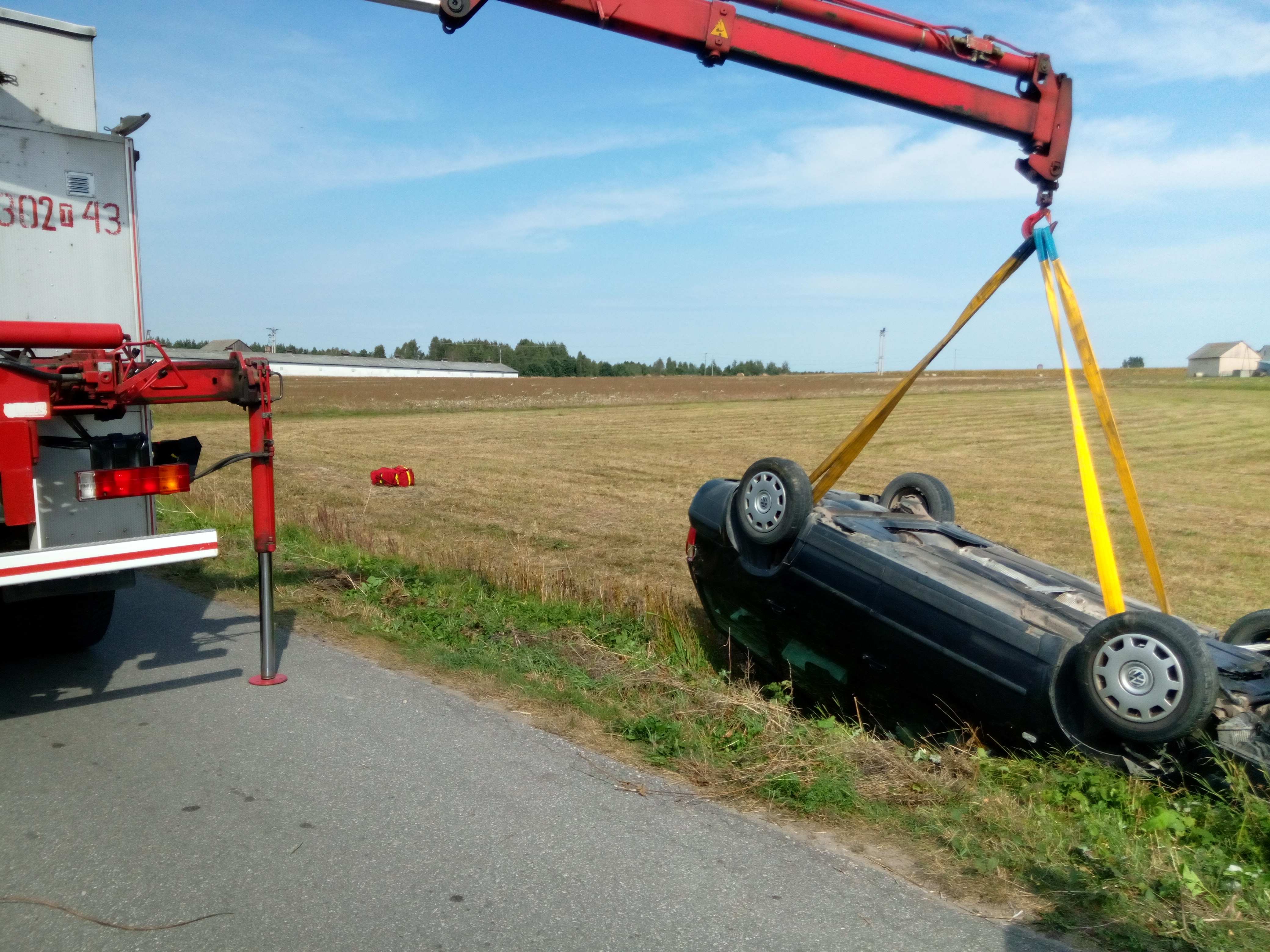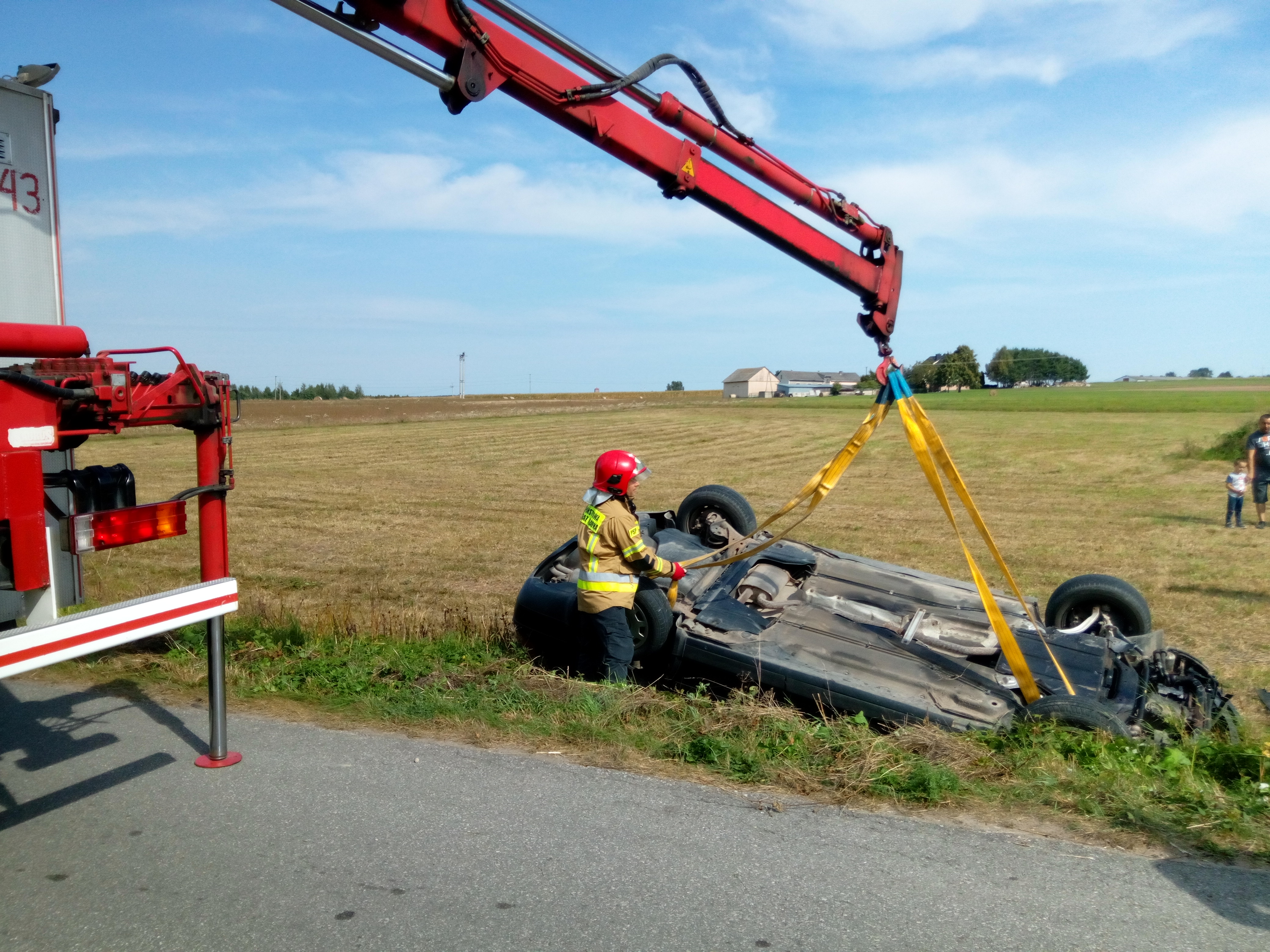 Samochód osobowy Volkswagen Passat wypadł z drogi gminnej, wpadł do przydrożnego rowu i leżał na dachu. Kobieta kierująca autem podróżowała sama i samodzielnie opuściła pojazd. Ratownicy zabezpieczyli i oznakowali teren działań i wdrożyli odpowiednie procedury z zakresu pierwszej pomocy w stosunku do poszkodowanej do czasu przybycia Zespołu Ratownictwa Medycznego, który przebadał kobietę i zabrał ją do szpitala. Strażacy, po zakończeniu procedur policyjnych postawili uszkodzony samochód na kołach w bezpiecznym miejscu i odłączyli zasilanie z akumulatora.