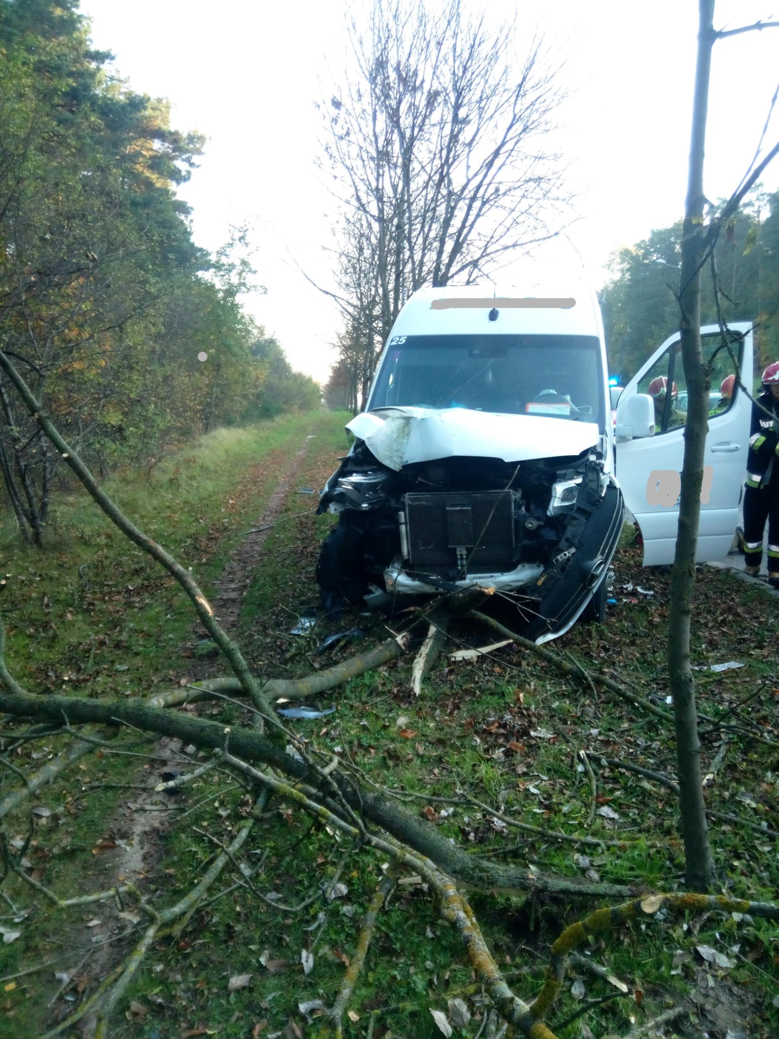 Bus przeznaczony do przewozu osób marki Mercedes Sprinter 519 zjechał z jezdni i uderzył w drzewo. Kierowca podróżował sam i w momencie dojazdu zastępów straży pożarnej znajdował przytomny się za kierownicą auta. Strażacy zabezpieczyli i oznakowali teren działań jednocześnie udzielając kwalifikowanej pierwszej pomocy poszkodowanemu. Zespół Ratownictwa Medycznego po przybyciu przejął opiekę nad mężczyzną, a po przebadaniu zabrał go do szpitala. Na zakończenie strażacy odłączyli zasilanie z akumulatora w pojeździe.
