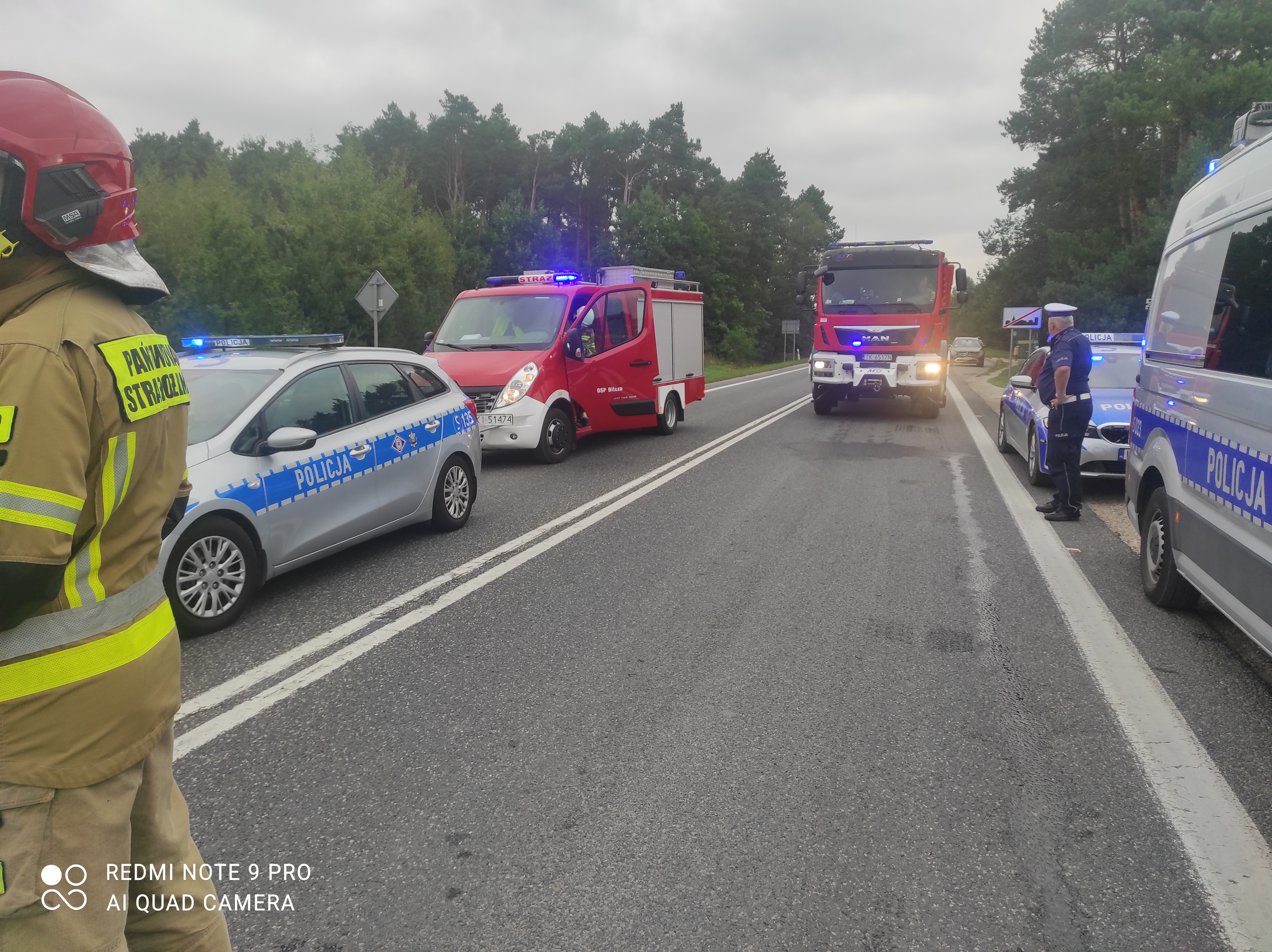 Na drodze krajowej nr 73 zderzył się motocykl Yamaha z samochodem osobowym Peugeot 407, w wyniku czego zapalił się leżący na drodze jednoślad, a uszkodzone auto zaparkowało na poboczu. Pojazdami podróżowali jedynie kierowcy, z których tylko motocyklista wymagał pomocy medycznej. Leżał nieprzytomny w rowie, a świadkowie zdarzenia udzielali mu pomocy. Funkcjonariusz Komendy Miejskiej Państwowej Straży Pożarnej w Kielcach bryg. Piotr Sokól z lekarzem i ratownikiem medycznym, którzy najechali na zdarzenie, wdrożyli procedury z zakresu pierwszej pomocy. Przybyli na miejsce strażacy zabezpieczyli teren działań i włączyli się do udzielania pomocy poszkodowanemu. Po przybyciu Zespołu Ratownictwa Medycznego ułożono mężczyznę na desce ortopedycznej i został zabrany do szpitala. Jednocześnie strażacy ugasili palący się motocykl i usunęli go na pobocze.