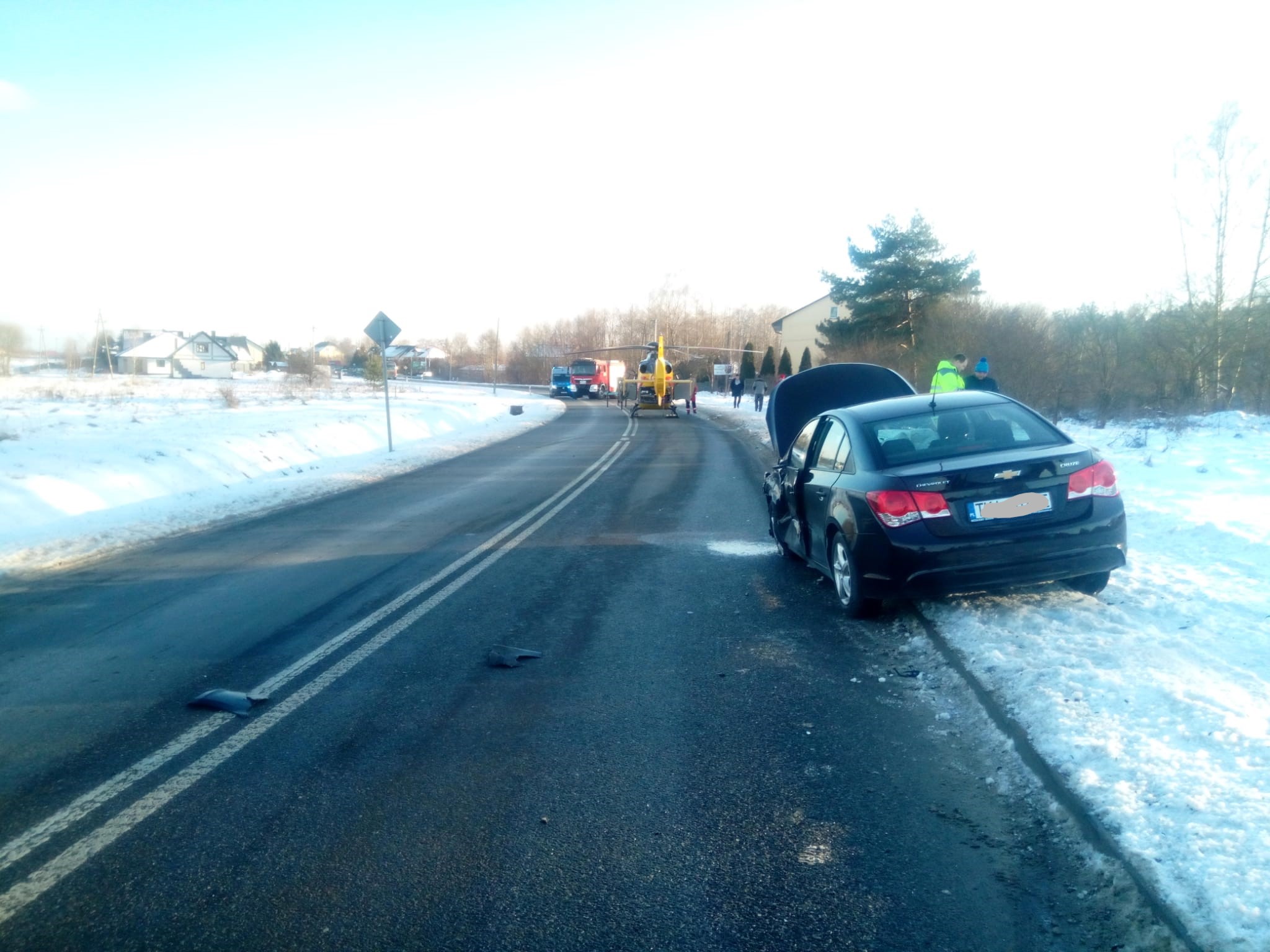 Na drodze wojewódzkiej numer 786 zderzyły się 3 samochody osobowe: Audi A4, Chewrolet Cruze i Volkswagen Passat. Autami podróżowali jedynie kierowcy, którzy samodzielnie opuścili pojazdy i tylko kierowca Audi wymagał pomocy medycznej. Strażacy zabezpieczyli i oznakowali miejsce zdarzenia, wdrożyli adekwatne procedury z zakresu pierwszej pomocy w stosunku do poszkodowanego. Jednocześnie odłączyli zasilanie z akumulatorów w uszkodzonych autach. Wraz z funkcjonariuszami Policji zabezpieczyli miejsce lądowania śmigłowca Lotniczego Pogotowia Ratunkowego, którego personel przebadał mężczyznę i zabrał do szpitala. Na zakończenie strażacy usunęli plamę płynów eksploatacyjnych z jezdni. Skutki tego zdarzenia usuwane były przez ponad 2 godziny siłami 2 zastępów w tym 11 ratowników.