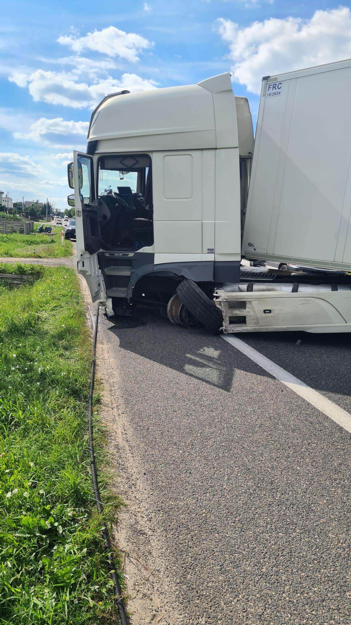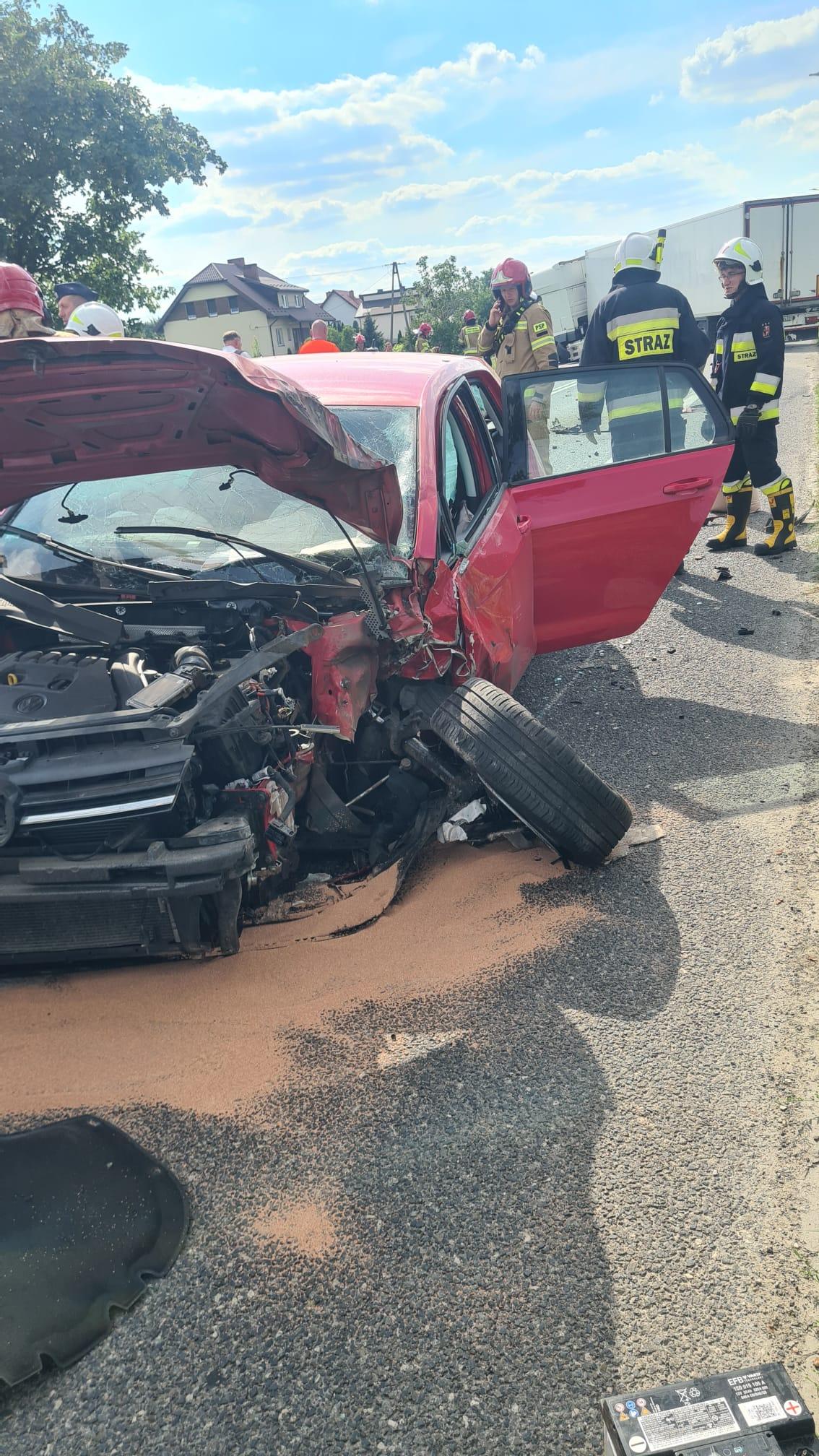 Droga krajowa numer 74 została zablokowana w obu kierunkach przez 2 auta: samochód osobowy marki Volkswagen Golf zderzył się z ciężarówką Daf przewożącą makaron. Pojazdami jechali tylko kierowcy, a będący na miejscu Zespół Ratownictwa Medycznego zajmował się mężczyzną z osobówki, który po przebadaniu został zabrany do szpitala. Drugi kierowca nie wymagał pomocy medycznej. 5 zastępów straży pożarnej przybyło z pomocą. Ratownicy oznakowali i zabezpieczyli teren, odłączyli zasilanie z akumulatorów w pojazdach oraz usunęli niewielki wyciek, który powstał na jezdni. Zadysponowany ciężki samochód ratownictwa technicznego odholował zniszczoną ciężarówkę w bezpieczne miejsce aby udrożnić przejazd. Działania, a tym samym utrudniania na drodze krajowej trwały blisko 4 godziny.