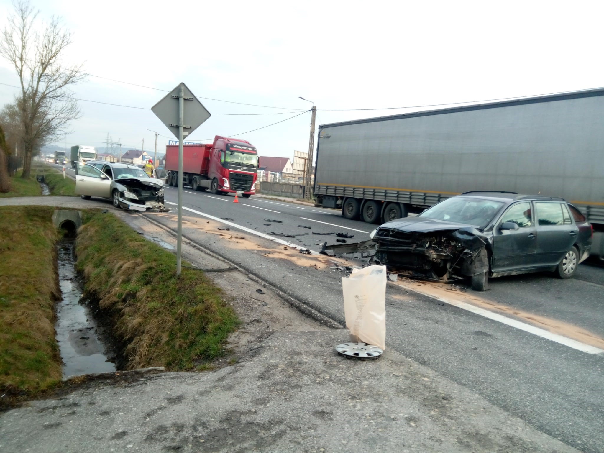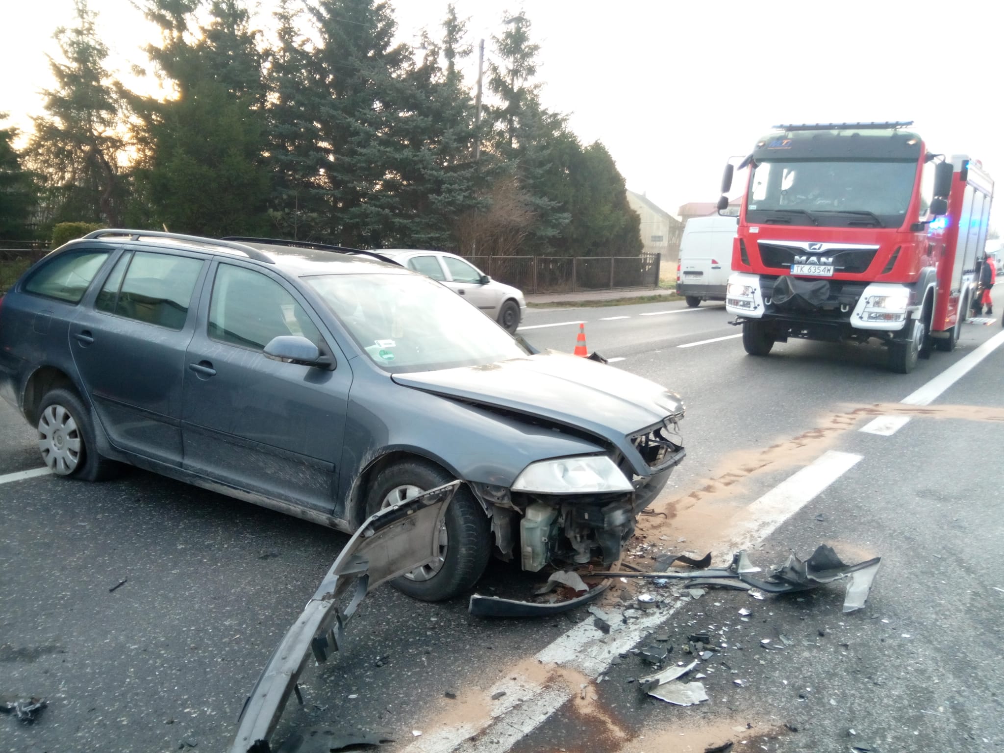 Na ulicy Kieleckiej stanowiącej fragment drogi krajowej numer 74 doszło do zderzenia dwóch pojazdów: Skody Octavia i Forda Mondeo. Autami podróżowali jedynie kierowcy, którzy samodzielnie opuścili uszkodzone auta. Samochody blokowały pas jezdni w kierunku Kielc, a ruch odbywał się wahadłowo. Obaj mężczyźni zostali przebadani przez Zespół Ratownictwa Medycznego i zabrani do szpitala. Na miejsce zadysponowano 2 zastępy straży pożarnej w sile 8 ratowników, którzy zabezpieczyli i oznakowali teren działań, odłączyli zasilanie z akumulatorów w autach oraz usunęli plamę płynów eksploatacyjnych z jezdni. Na zakończenie uszkodzone auta zostały usunięte z jezdni przywracając prawidłowy ruch na krajowej 74.