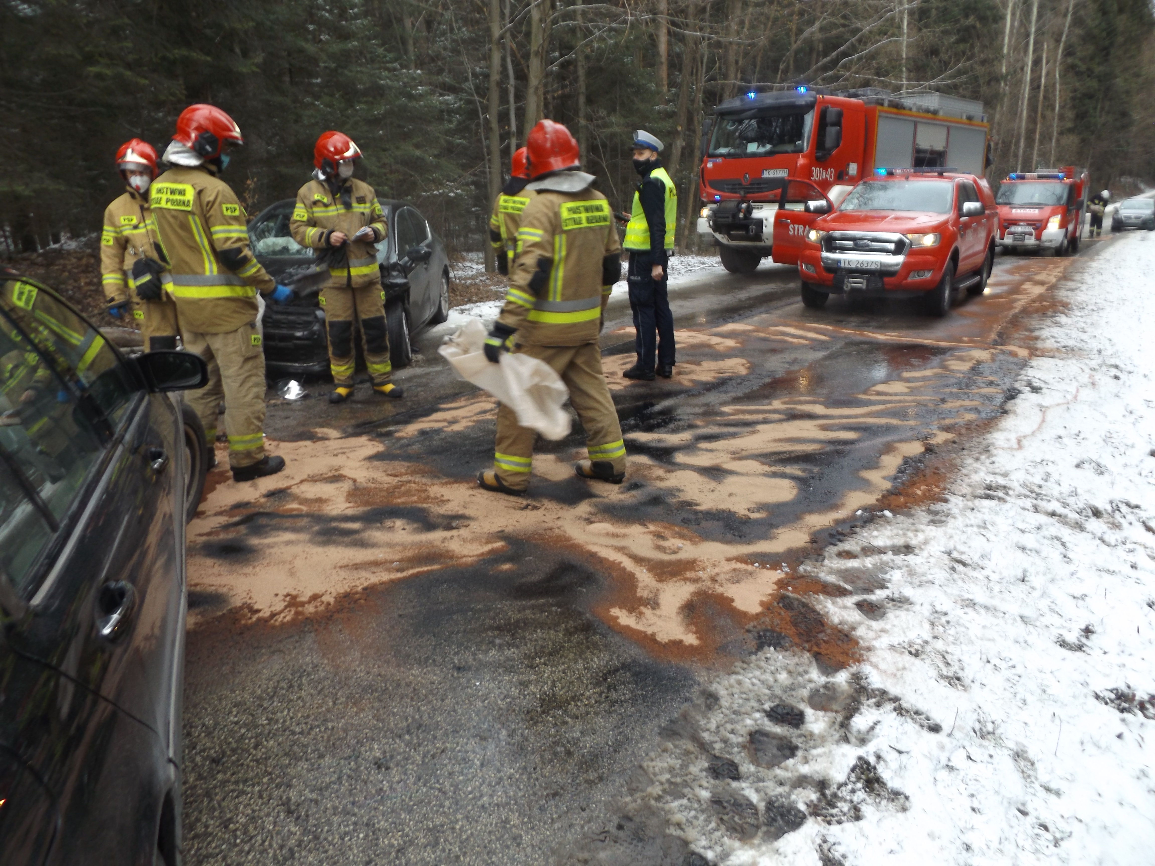 Z jednego z uszkodzonych samochodów doszło do wycieku oleju silnikowego oraz płynów eksploatacyjnych, które poddano sorpcji i zebrano do utylizacji.