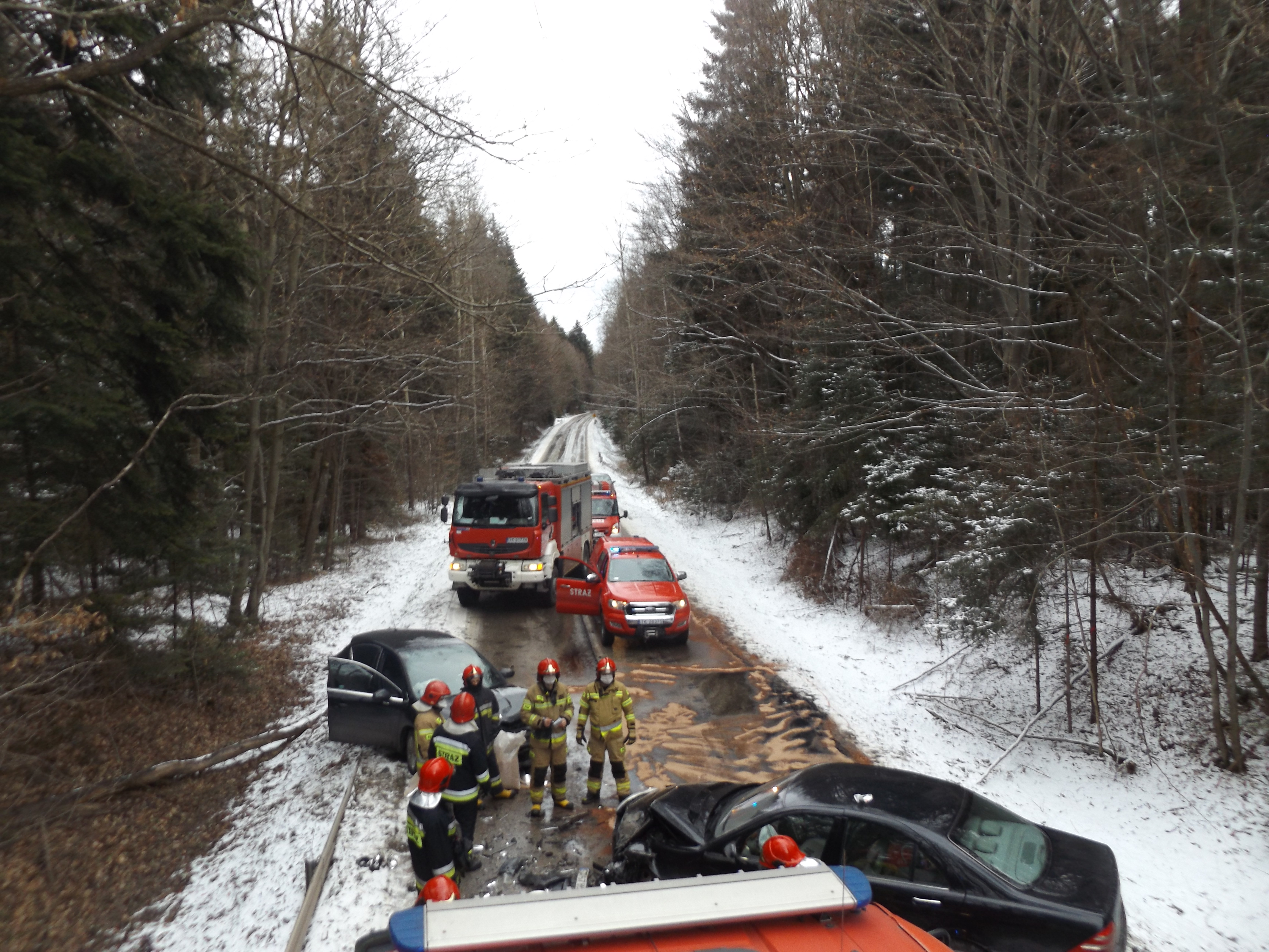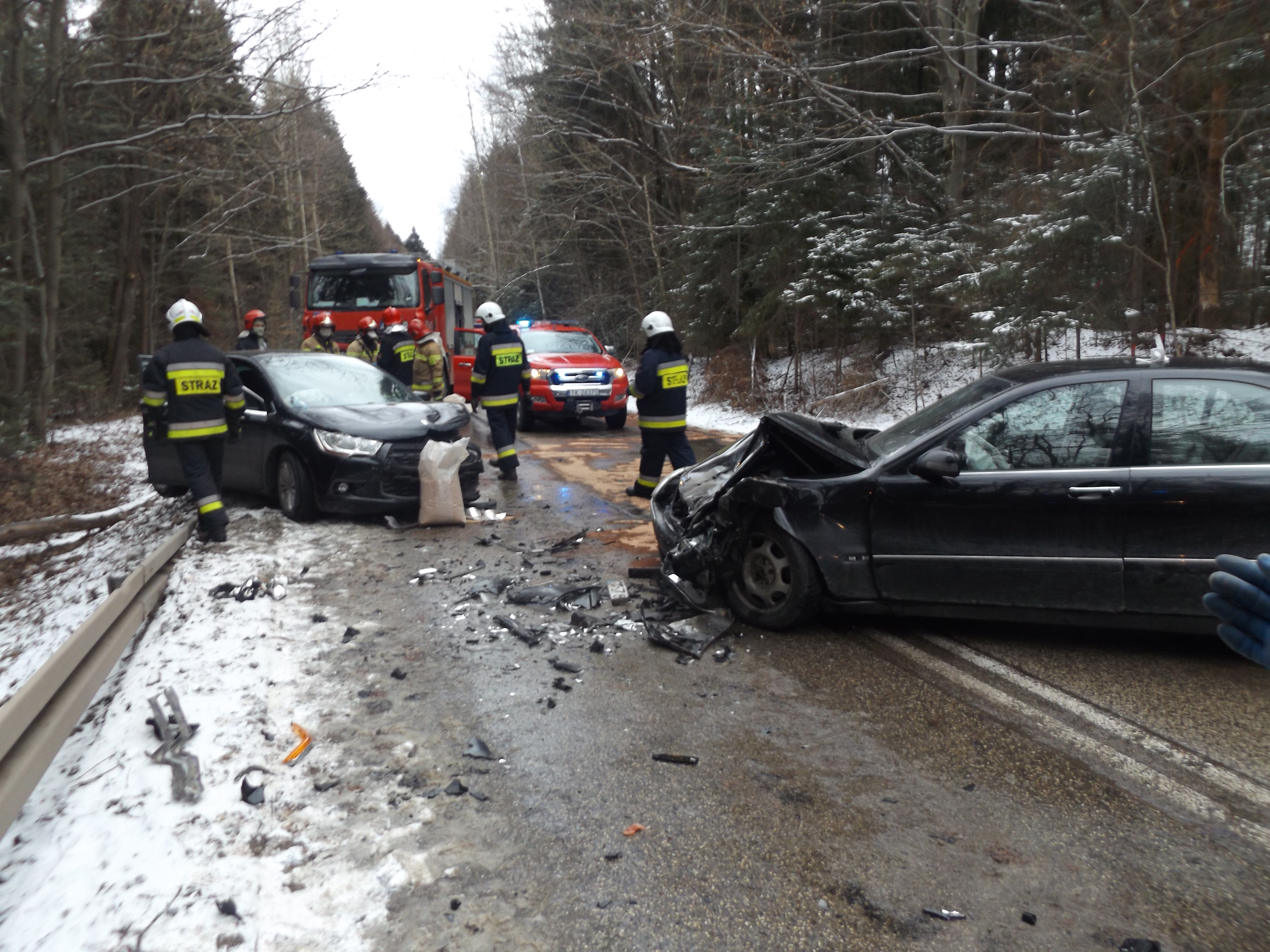 Po dojeździe na miejsce zdarzenia pierwszych zastępów straży pożarnej z JRG nr 1 w Kielcach stwierdzono, że w wypadku udział brało dwa samochody osobowe, którymi podróżowali sami kierowcy. W momencie dojazdu obie osoby znajdowały się w pojazdach - przytomni, niezakleszczeni. Ruch na drodze powiatowej był całkowicie zablokowany.