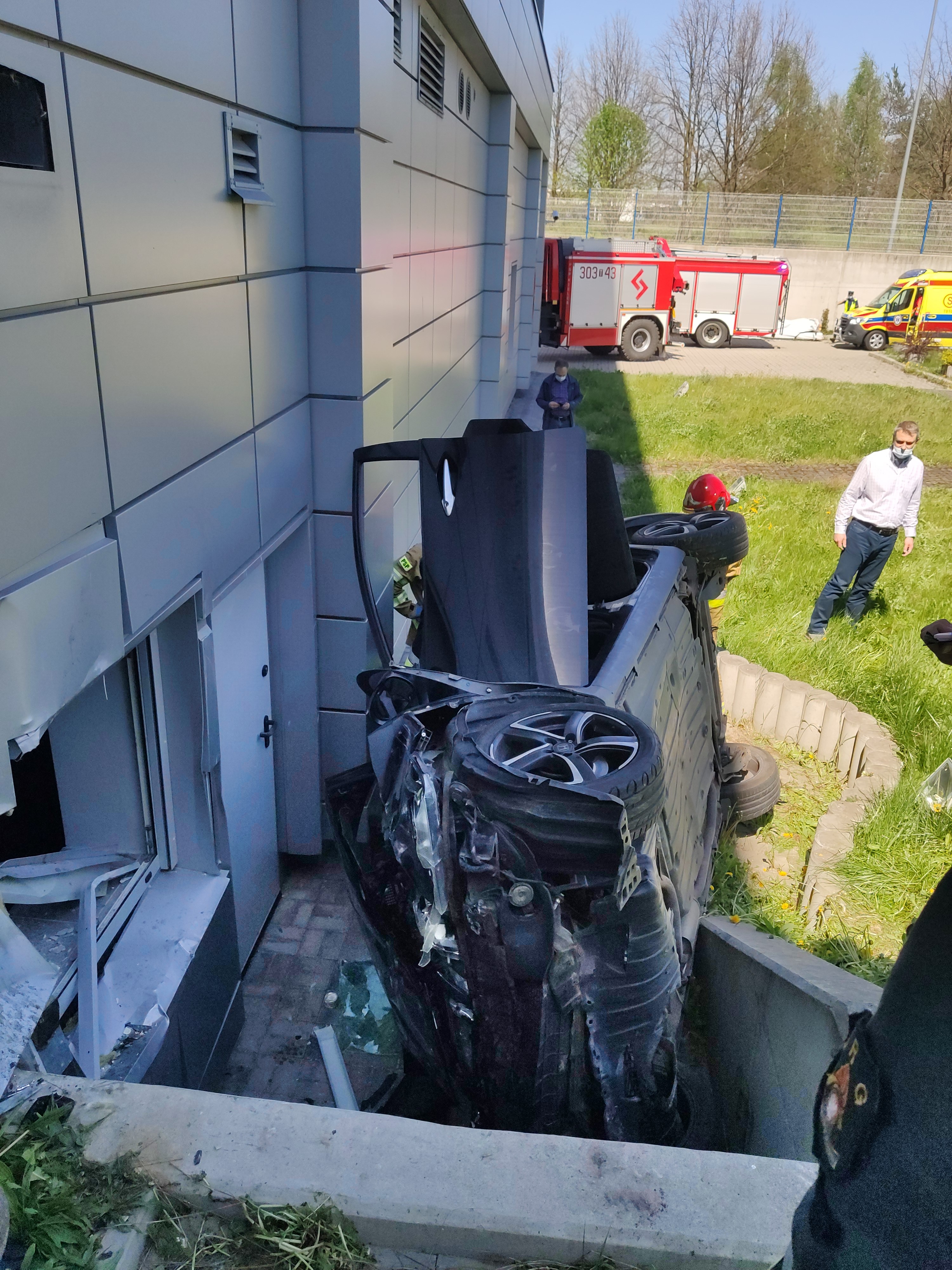 Po przybyciu na miejsce zdarzenia zastępów straży pożarnej stwierdzono, że samochód osobowy marki Honda Civic zjechał ze skarpy, uderzył w budynek parkingu wielopoziomowego i znajdował się na prawym boku przy ścianie budynku. Wewnątrz pojazdu znajdowała się przytomna kobieta, która nie mogła samodzielnie wydostać się na zewnątrz pojazdu. Poszkodowana uskarżała się na ból ręki, posiadała liczne rozcięcia skóry oraz stłuczenia.