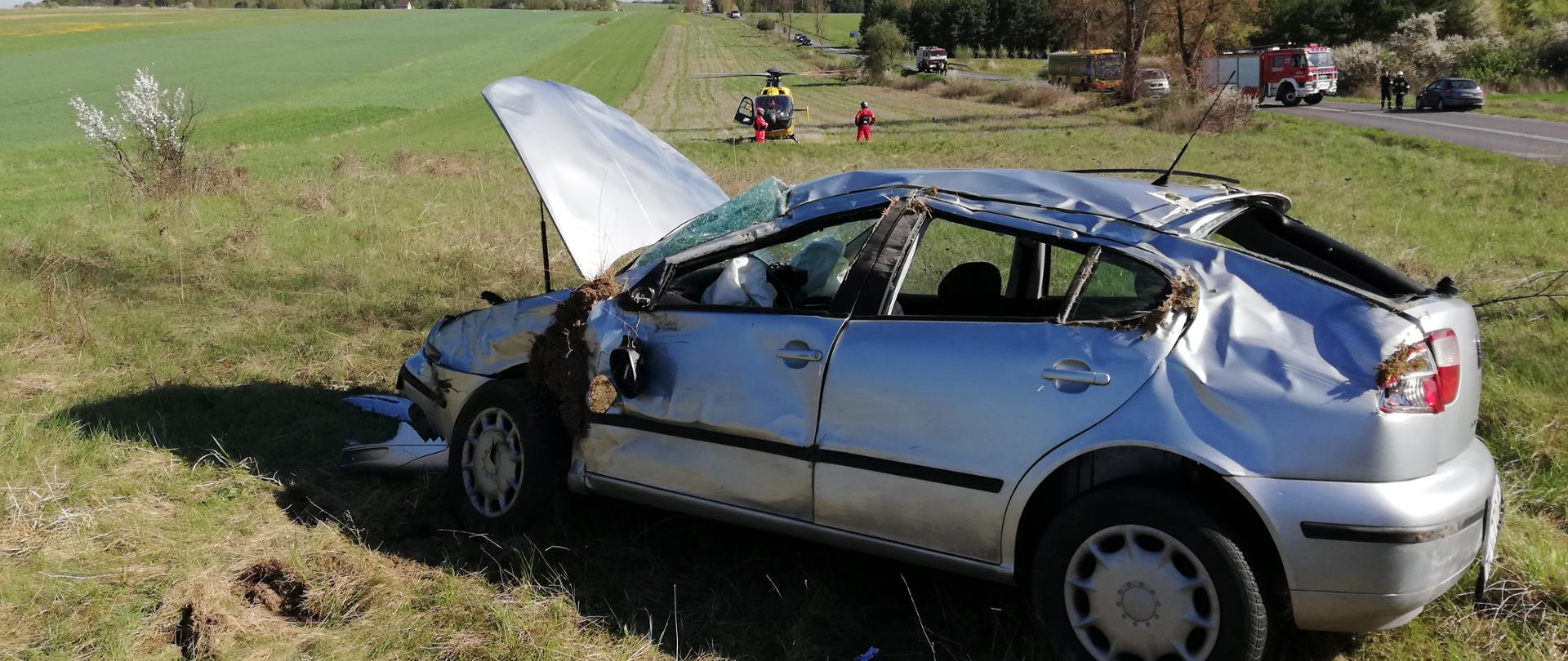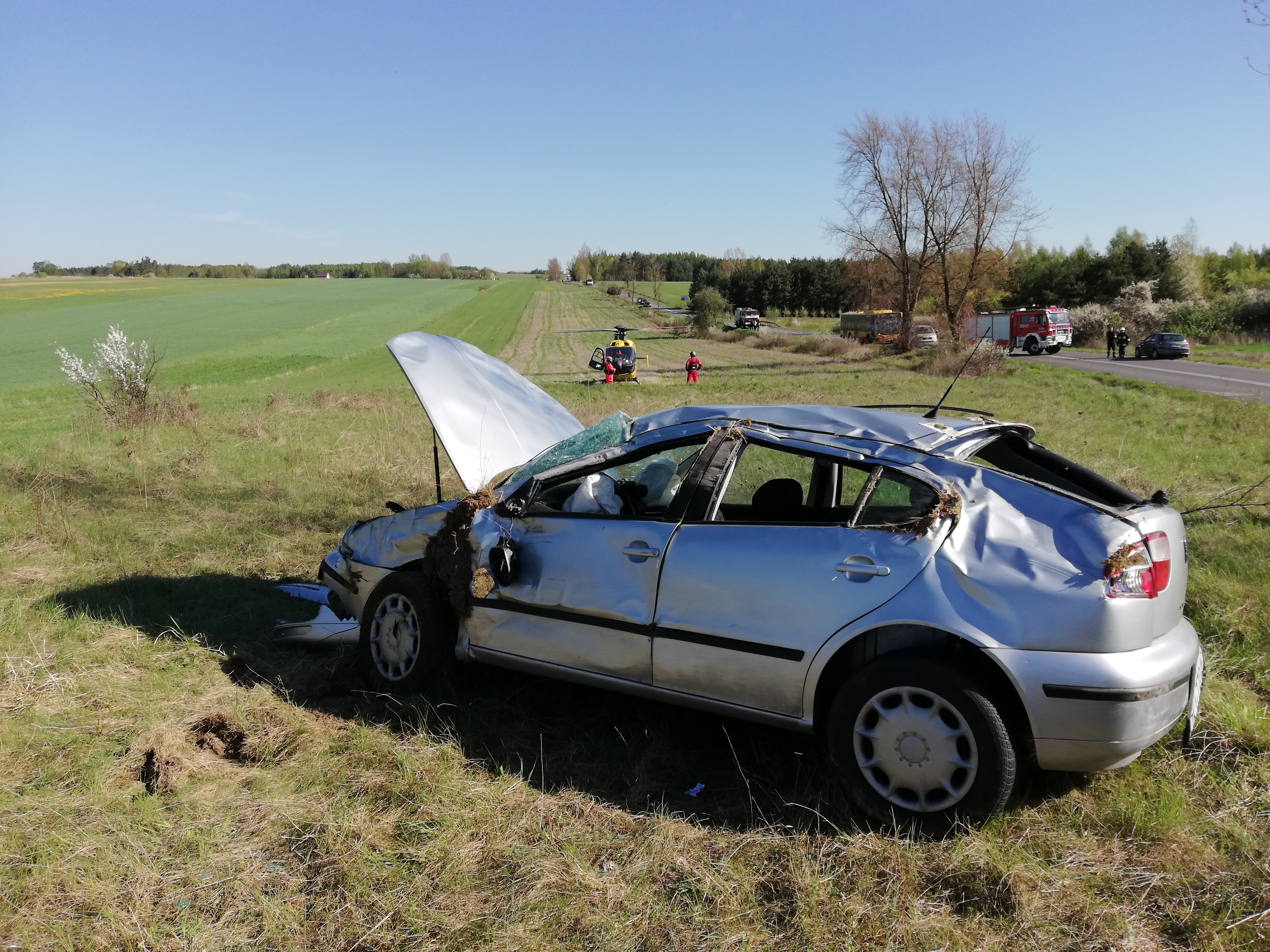 Po przybyciu na miejsce zdarzenia zastępów straży pożarnej stwierdzono, że na łuku drogi wypadł z jezdni i dachował pojazd który znajduje się poza pasem drogowym na pobliskiej łące. Seatem podróżowała jedna osoba - kobieta, która w chwili przybycia pierwszych zastępów straży pożarnej znajdowała się poza pojazdem.