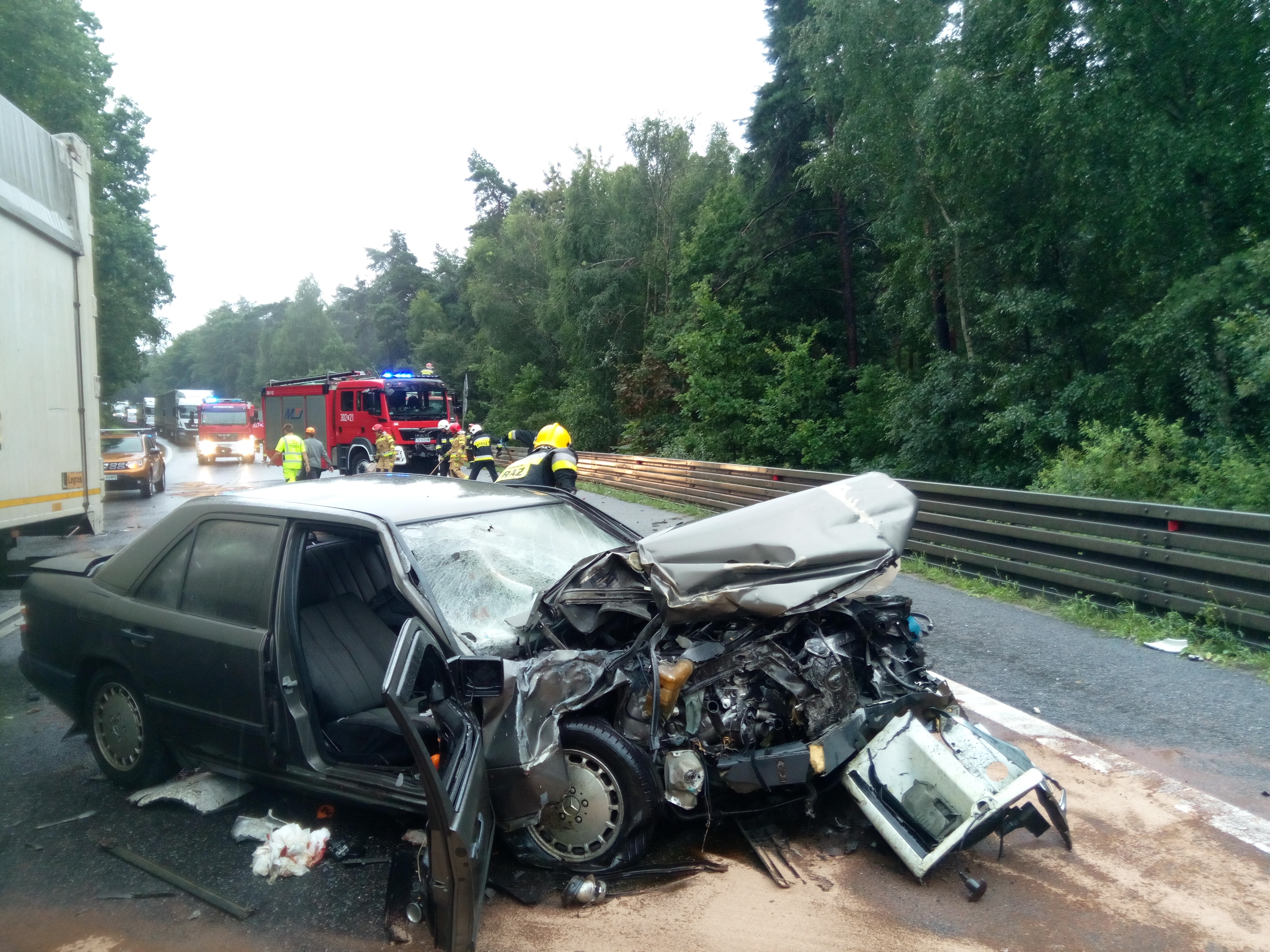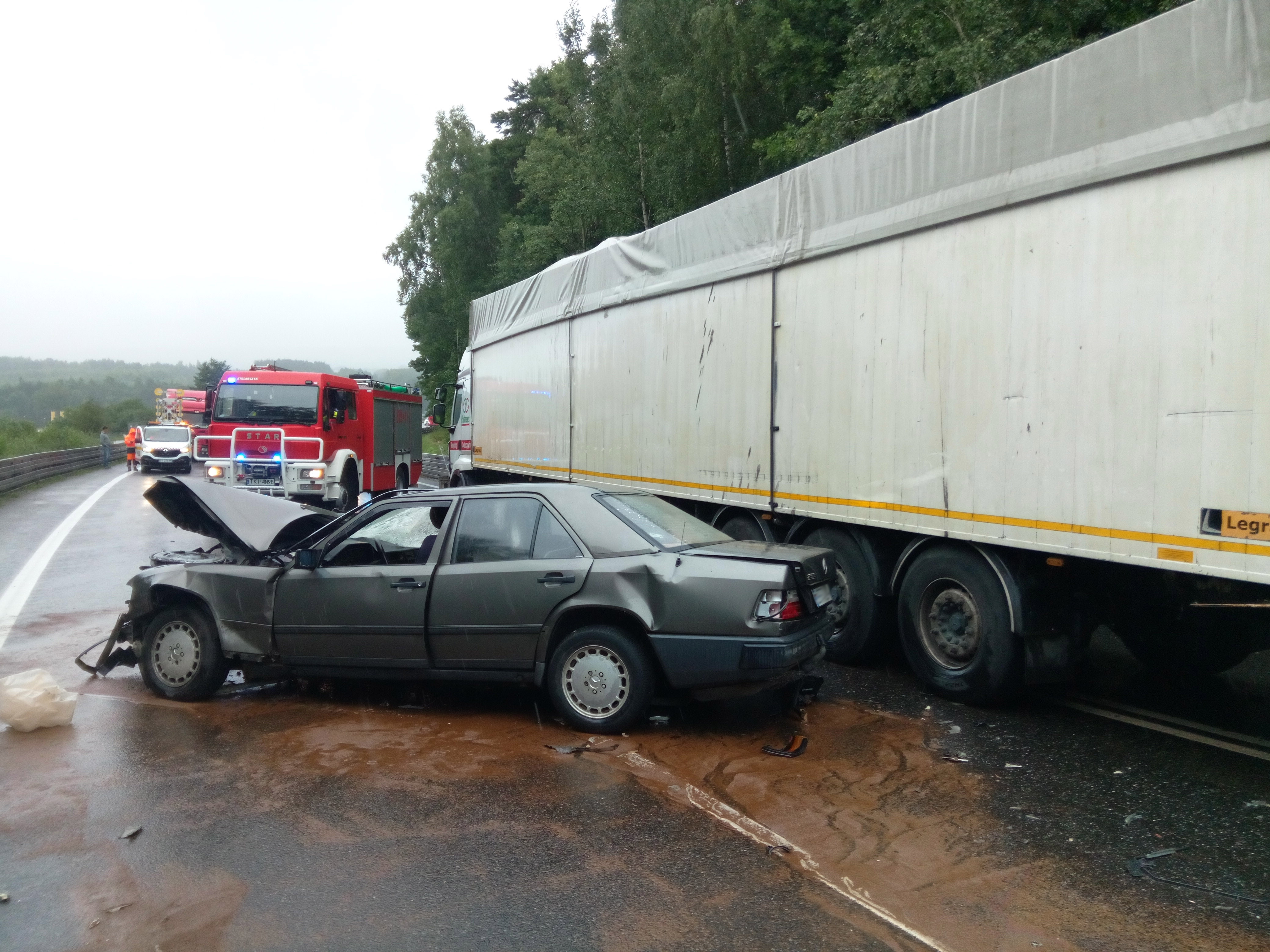 Przybyli na miejsce strażacy wykonali dostęp do poszkodowanego i ewakuowali go na zewnątrz samochodu. Następnie ranny został przekazany załodze zespołu Państwowego Ratownictwa Medycznego i przetransportowany do szpitala. Kierujący pojazdem ciężarowym nie odniósł żadnych obrażeń. Dodatkowe działania straży pożarnej polegały na zabezpieczeniu pojazdów oraz usunięciu powstałej plamy oleju z jezdni. Na tym odcinku drogi krajowej ruch był całkowicie wstrzymany do godzin popołudniowych.