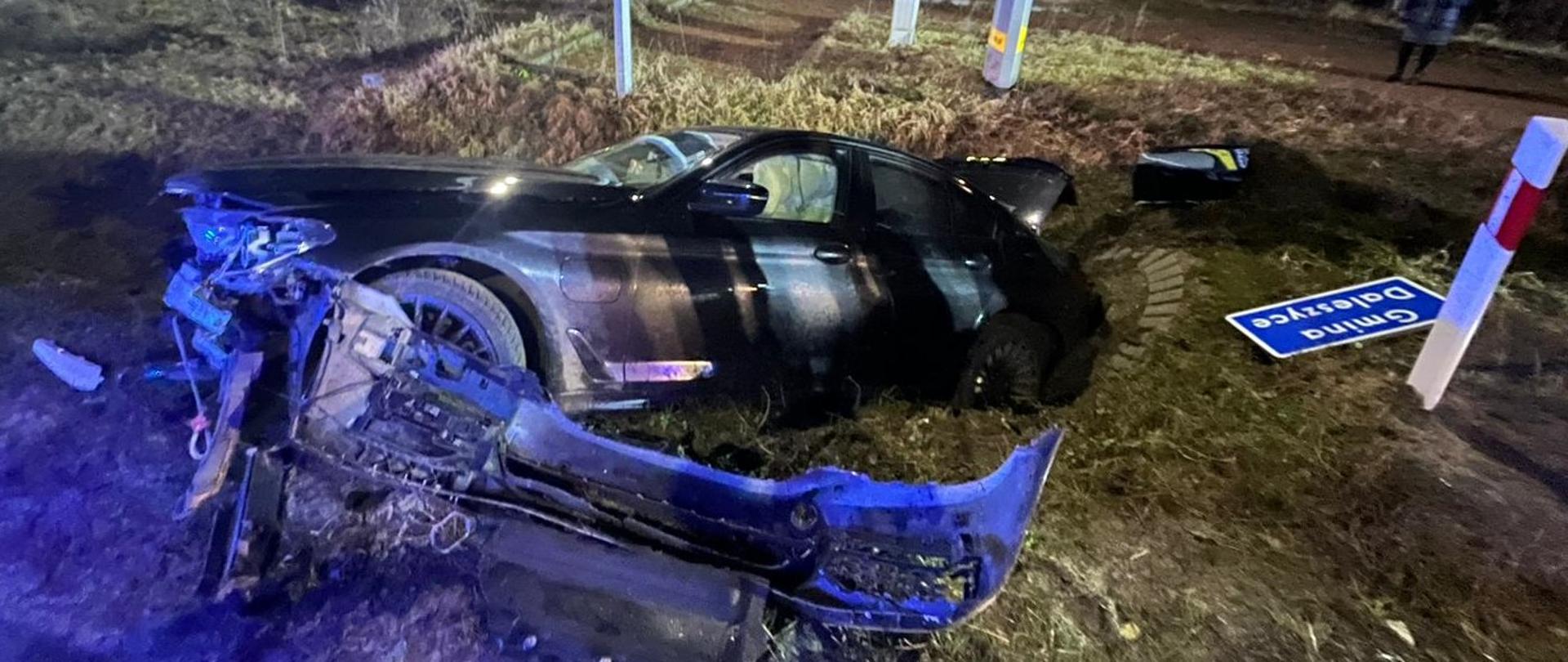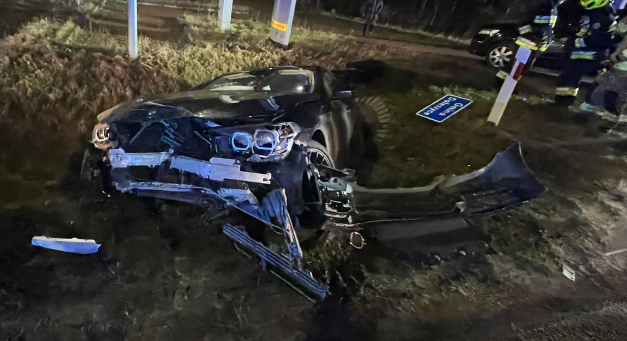 Na drodze wojewódzkiej numer 764 samochód osobowy marki BMW, którym podróżowały 4 osoby wypadł z drogi i wpadł do przydrożnego rowu niszcząc 2 znaki drogowe. Wszyscy bezpieczne opuścili pojazd, a po przebadaniu przez Zespół Ratownictwa Medycznego dwie z nich zostały zabrane do szpitala. Do zdarzenia zadysponowano 3 zastępy straży pożarnej. Ratownicy zabezpieczyli teren działań i odłączyli zasilanie w uszkodzonym aucie hybrydowym. Następnie wyciągnęli wyciągarką pojazd z rowu i pozostawili go w bezpiecznym miejscu.